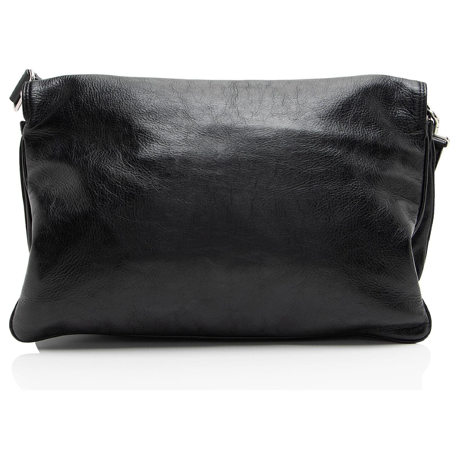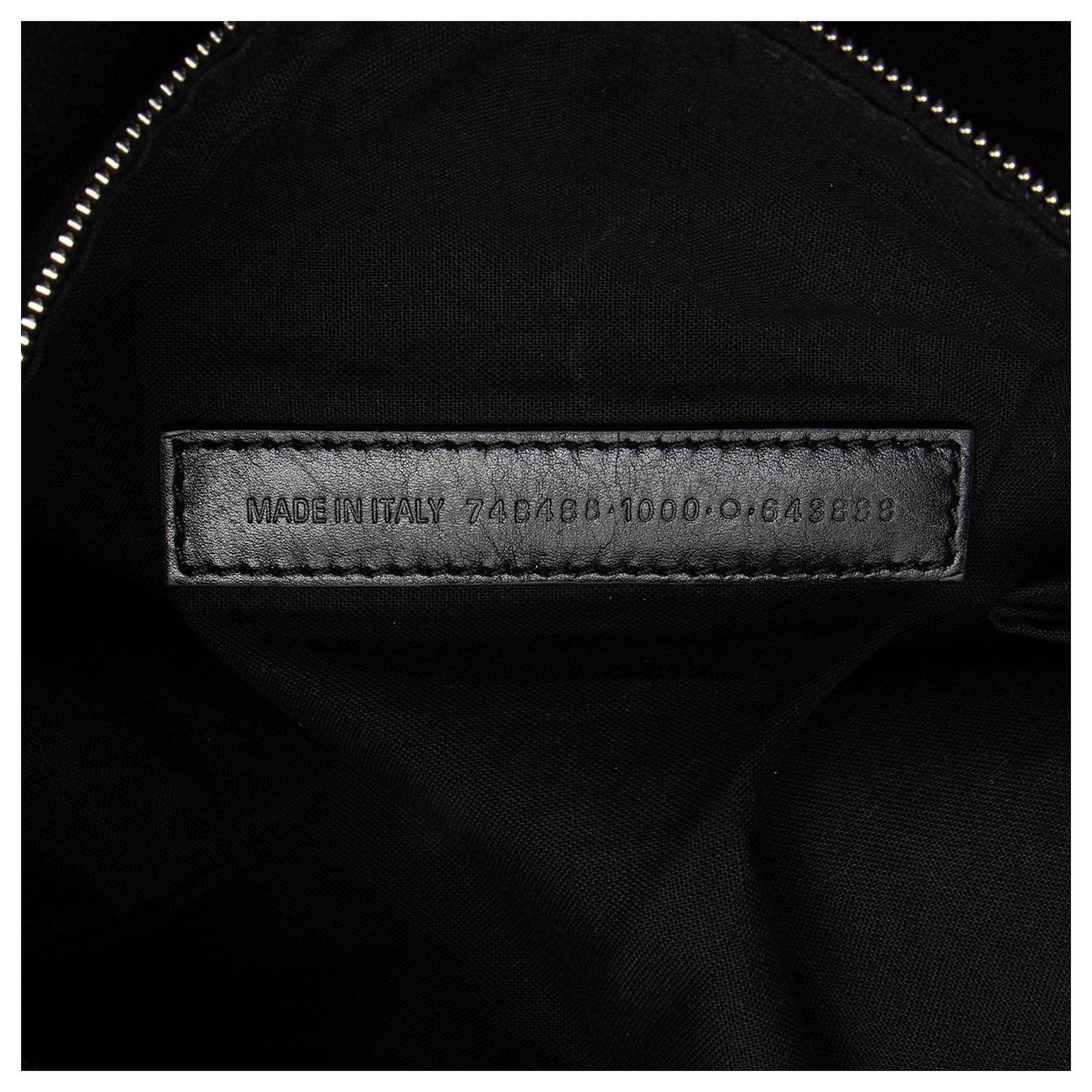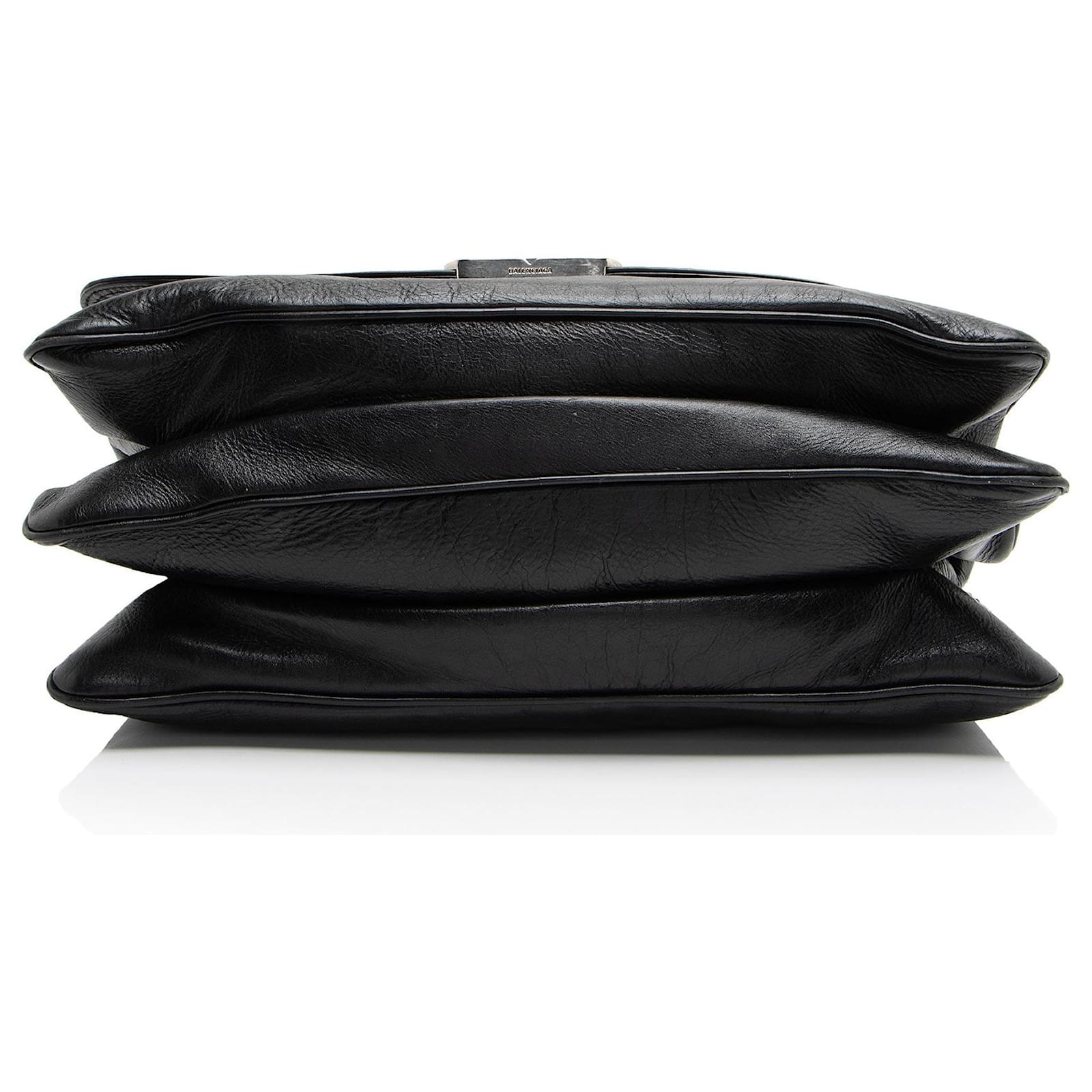 Founded in San Sebastian, Spain in 1918, the House of Balenciaga relocated to Paris in 1937 during the Spanish Civil war. Almost immediately Cristóbal was hailed as "the couturier of couturiers." Past designer Nicolas Ghesquiere, had revitalized the company with a youthful aesthetic, introducing the famous motorcycle inspired handbags. Successor to Alexander Wang, current Creative Director Demna Gvasalia upholds the brand’s rejuvenating aesthetic with high-fashion streetwear and graphic-driven styles.Condition Notes: Scuffs to exterior bottom corners. Light creasing and scuffs throughout exterior. Creasing throughout leather shoulder strap. Light surface scratches to hardware. Light scuffs throughout interior flap. Light marks throughout interior.Width (at base): 14"Height: 9"Depth: 4.5"Shoulder Strap Drop: Adjustable, 20.5"Type of Material: LeatherColor: BlackLining: Black Fine TextilePockets: One InteriorHardware: Silver ToneClosure: Turn LockOrigin: ItalyIncludes: Two Detachable Shoulder Straps, Dust Bag Measurments: width: 355 mm height: 228 mm strap length: 520.7 mm