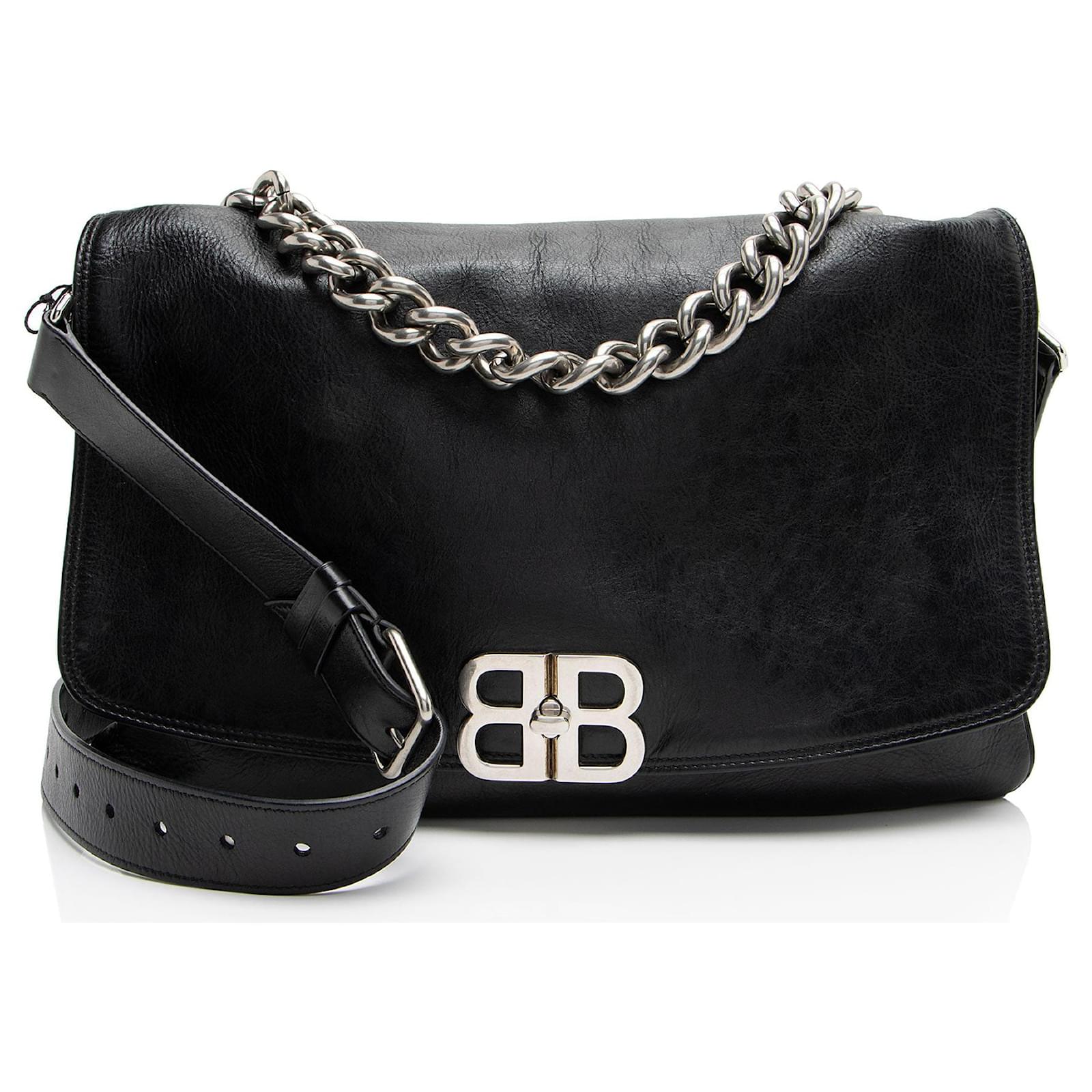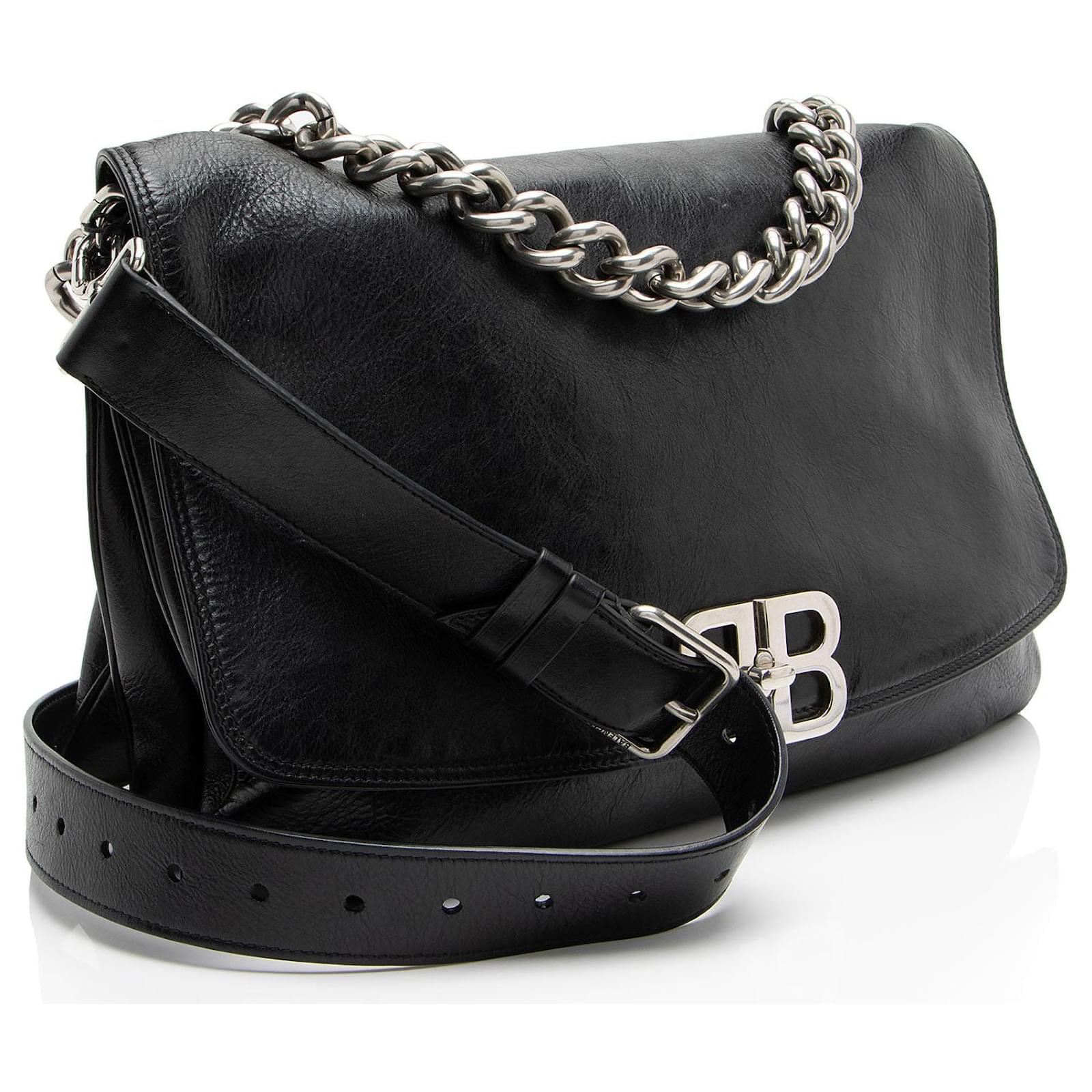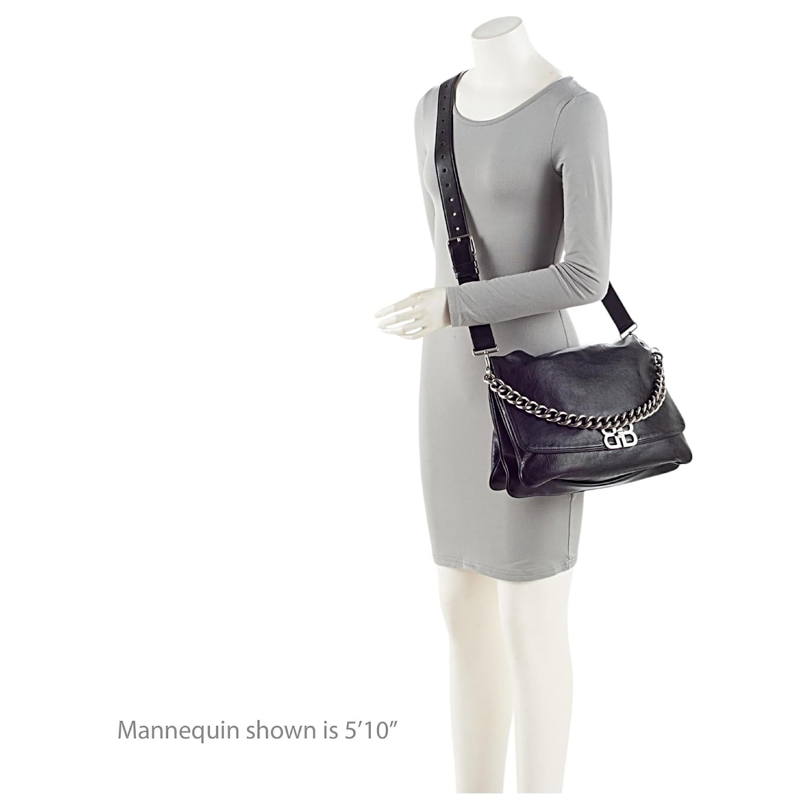 Founded in San Sebastian, Spain in 1918, the House of Balenciaga relocated to Paris in 1937 during the Spanish Civil war. Almost immediately Cristóbal was hailed as "the couturier of couturiers." Past designer Nicolas Ghesquiere, had revitalized the company with a youthful aesthetic, introducing the famous motorcycle inspired handbags. Successor to Alexander Wang, current Creative Director Demna Gvasalia upholds the brand’s rejuvenating aesthetic with high-fashion streetwear and graphic-driven styles.Condition Notes: Scuffs to exterior bottom corners. Light creasing and scuffs throughout exterior. Creasing throughout leather shoulder strap. Light surface scratches to hardware. Light scuffs throughout interior flap. Light marks throughout interior.Width (at base): 14"Height: 9"Depth: 4.5"Shoulder Strap Drop: Adjustable, 20.5"Type of Material: LeatherColor: BlackLining: Black Fine TextilePockets: One InteriorHardware: Silver ToneClosure: Turn LockOrigin: ItalyIncludes: Two Detachable Shoulder Straps, Dust Bag Measurments: width: 355 mm height: 228 mm strap length: 520.7 mm