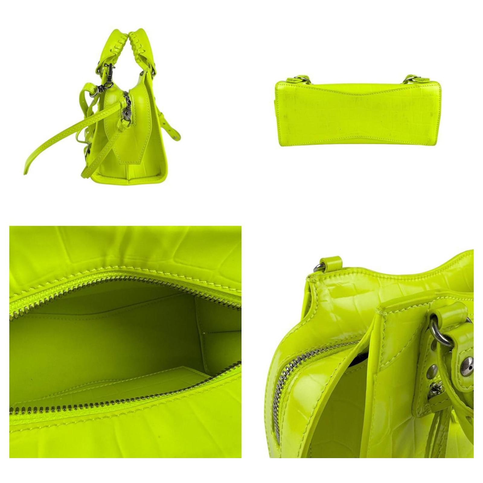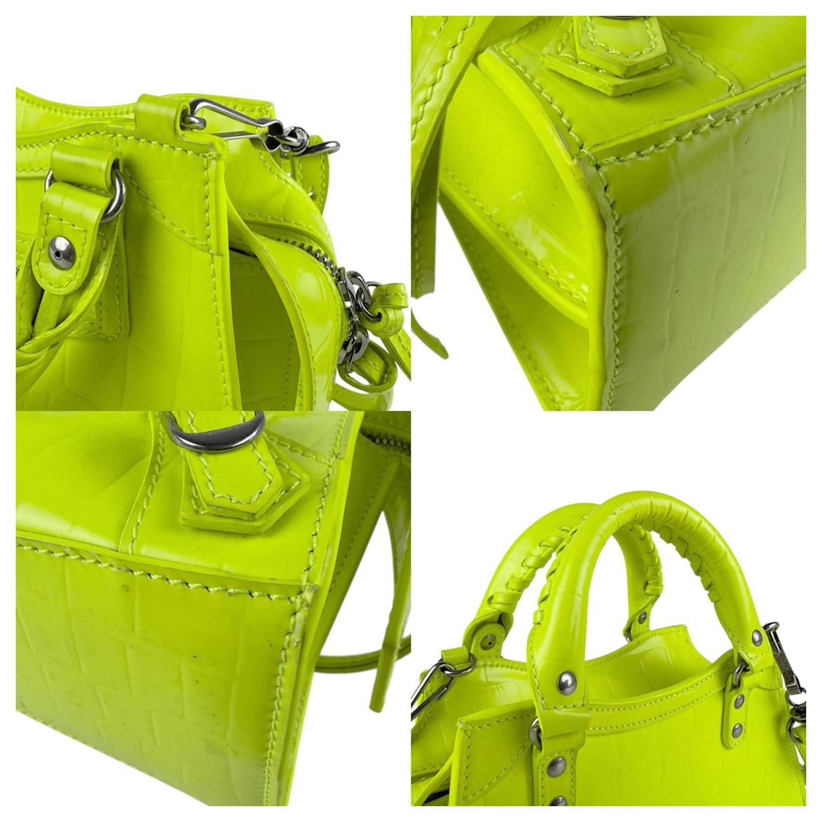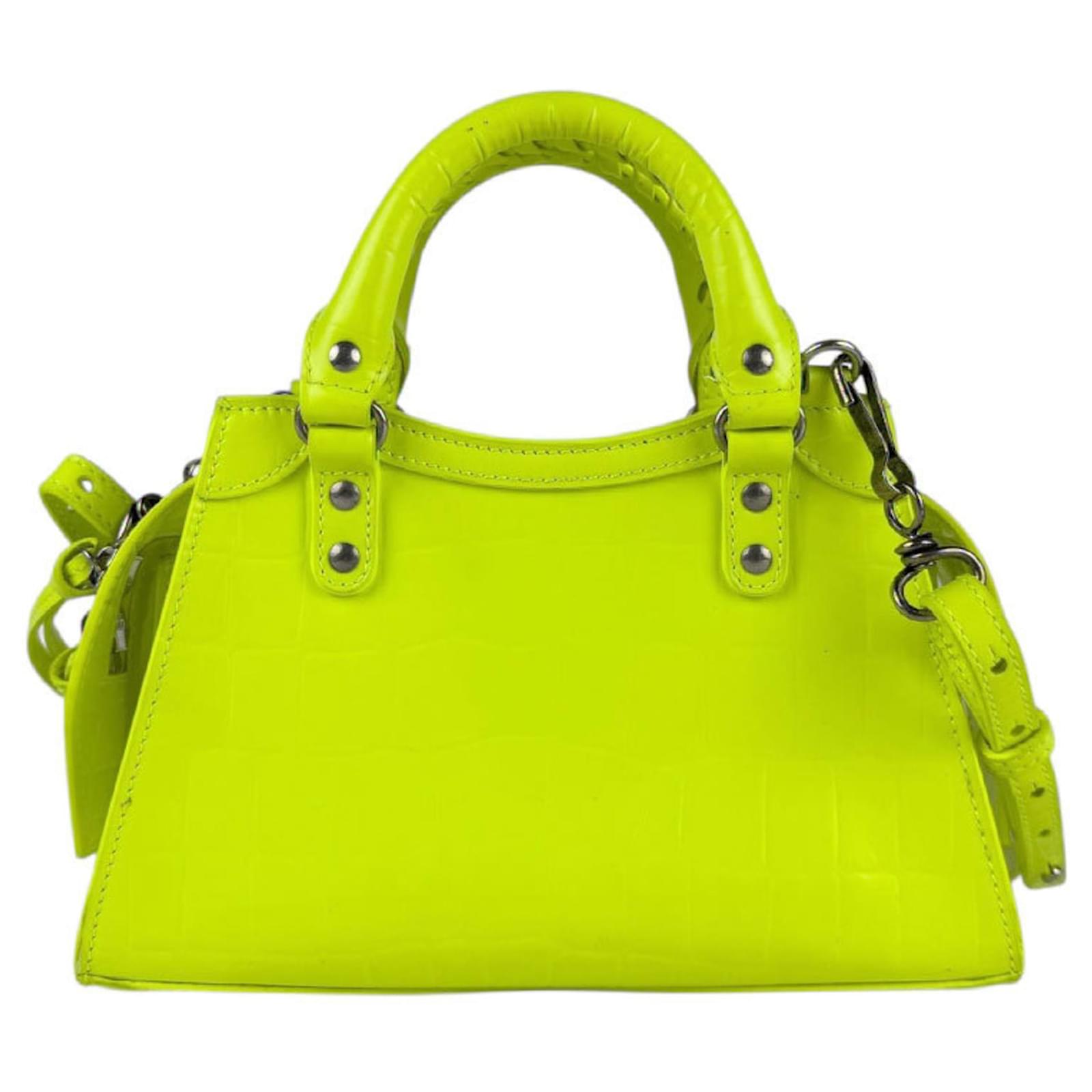The Balenciaga Neo Classic City Mini Handbag is a stylish accessory designed for women, crafted from embossed leather in a vibrant neon green and yellow color scheme. This handbag, which can also be worn as a shoulder bag, measures 14cm x 22cm x 9cm (5.51'' x 8.66'' x 3.54'').