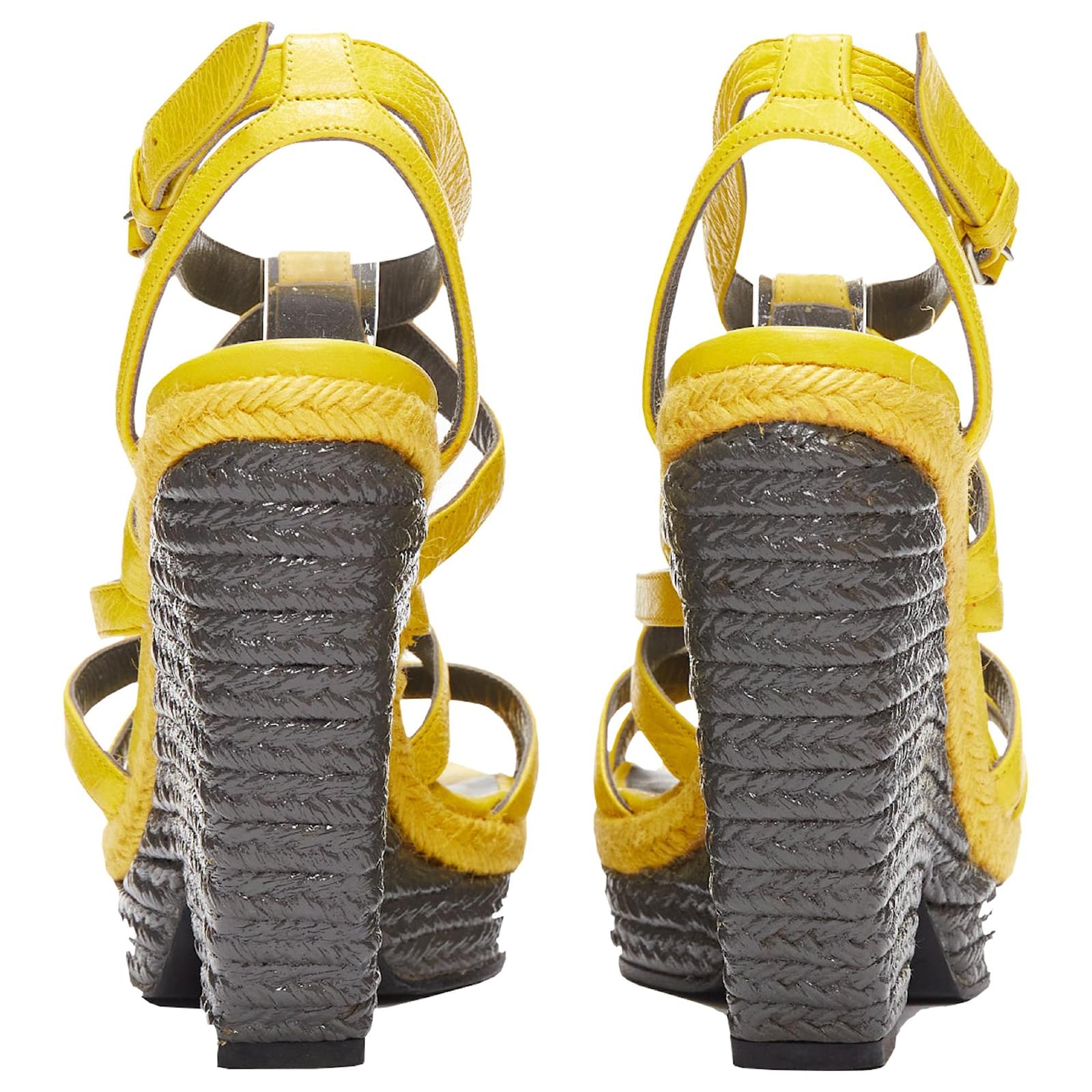 BALENCIAGA Vintage Arena yellow studded grey espadrille wedge heel EU38Reference: MEKK/A00003Brand: BalenciagaDesigner: Nicolas GhesquiereModel: ArenaMaterial: LeatherColor: Yellow, GreyPattern: SolidClosure: Ankle StrapLining: Grey LeatherExtra Details: Balenciaga Leather Espadrilles Heel.Yellow and grey. Wedge Heels with Platform. Crossover Straps & Buckle Closure at Ankles.Made in: SpainCONDITION:Condition: Very good, this item was pre-owned and is in very good condition. Please refer to image gallery for thorough condition check. Minor color transfer on left shoe T strap and front insole. Lining slightly peeling off at end of straps. Slight storage dents on straps.Comes with: Style code present (Generic) SIZINGDesigner size: EU38Size reference: EU38 / US8 / UK5 / JP25.5MEASUREMENTS: Footbed length: 24.5cm / 9.6"Heel height: 12cm / 4.7"Platform height: 2cm / 0.8"Measurments: length: 245 mm height: 120 mm