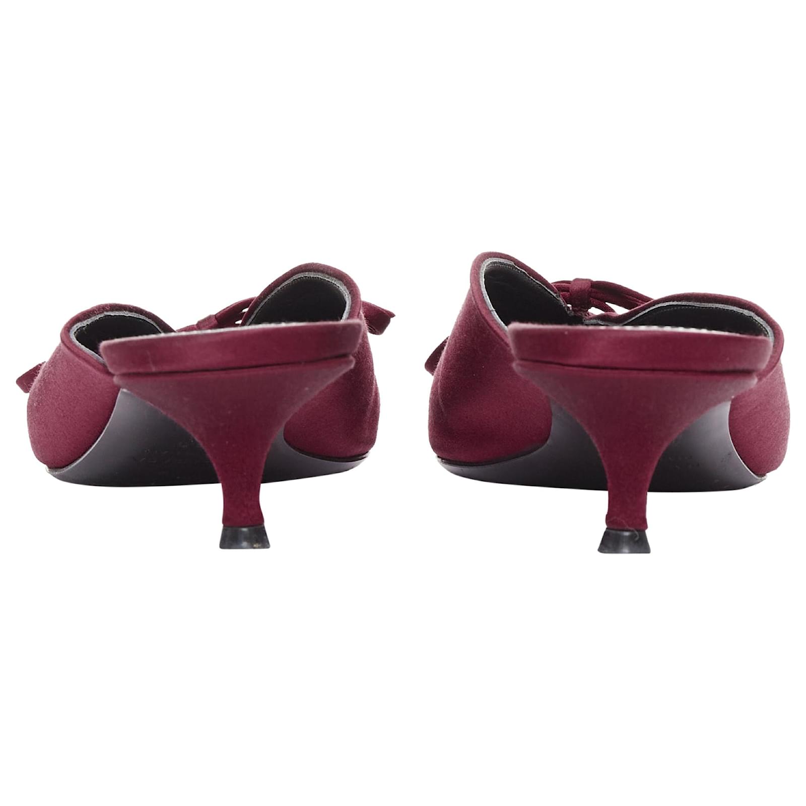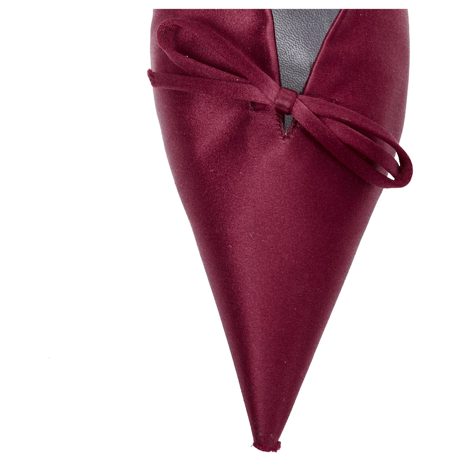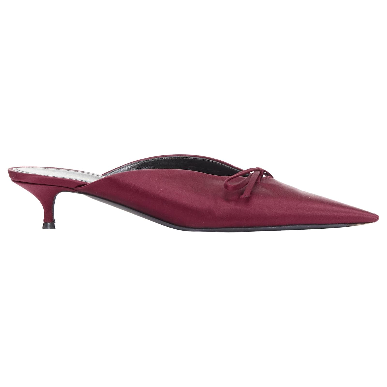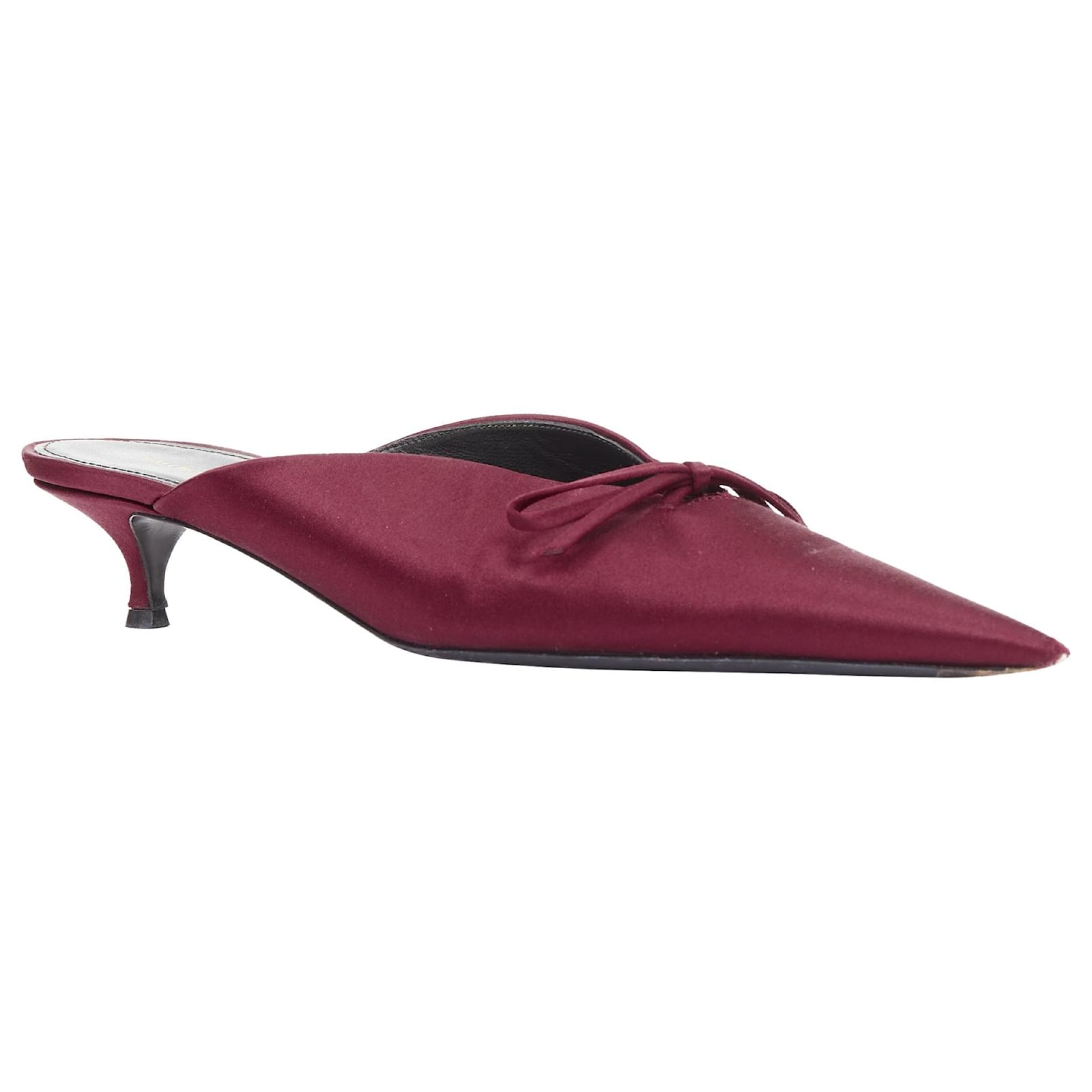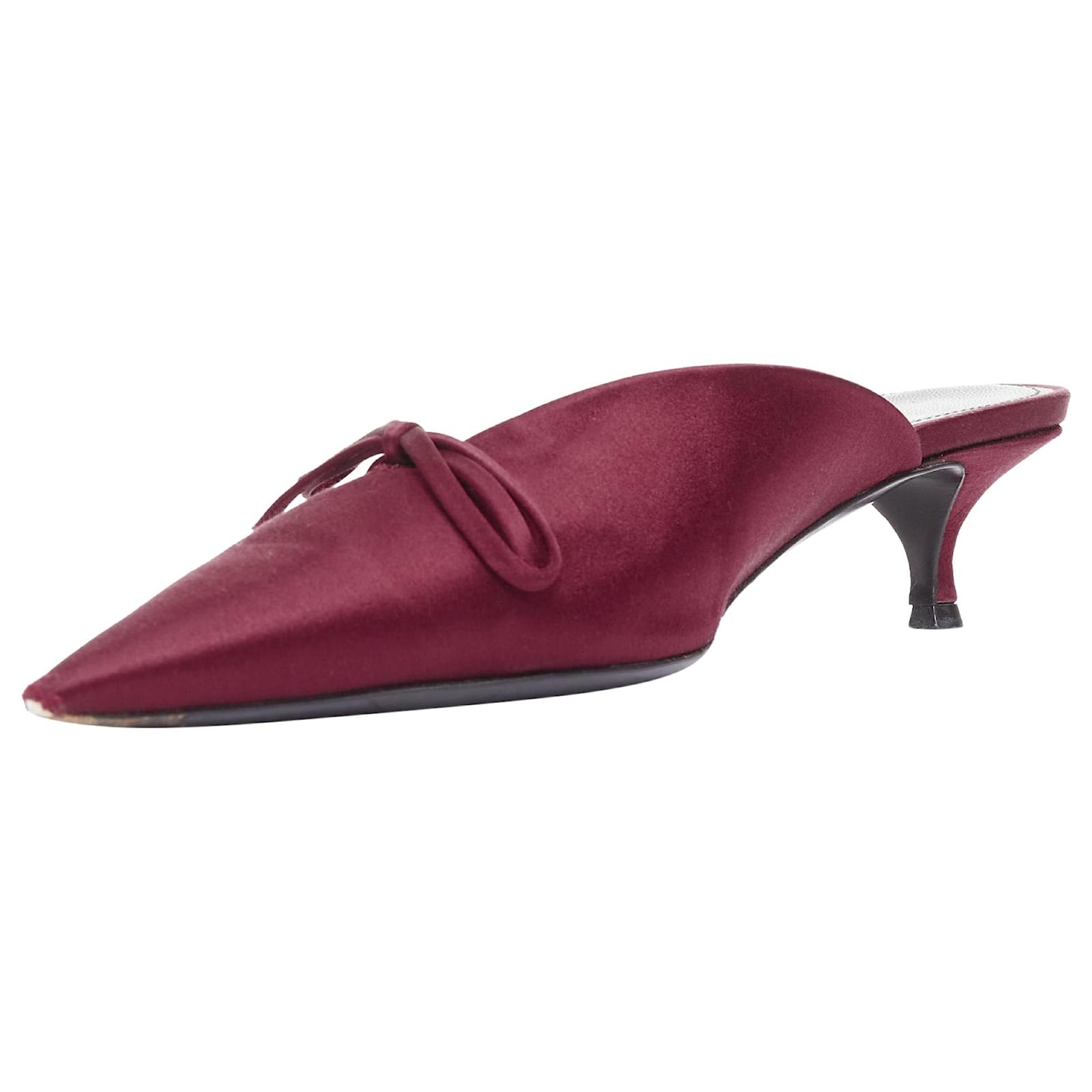 BALENCIAGA Demna Knife Mules burgundy satin bow pointy kitten heels EU38.5Reference: CNPG/A00125Brand: BalenciagaDesigner: DemnaModel: Knife MulesMaterial: SatinColor: BurgundyPattern: SolidClosure: Slip OnLining: Black LeatherMade in: ItalyCONDITION:Condition: Very good, this item was pre-owned and is in very good condition. Please refer to image gallery for thorough condition check. Scuffed at toes.SIZINGDesigner size: EU38.5Size reference: EU38.5 / US8.5 / UK5.5 / JP26Balenciaga. This Balenciaga .