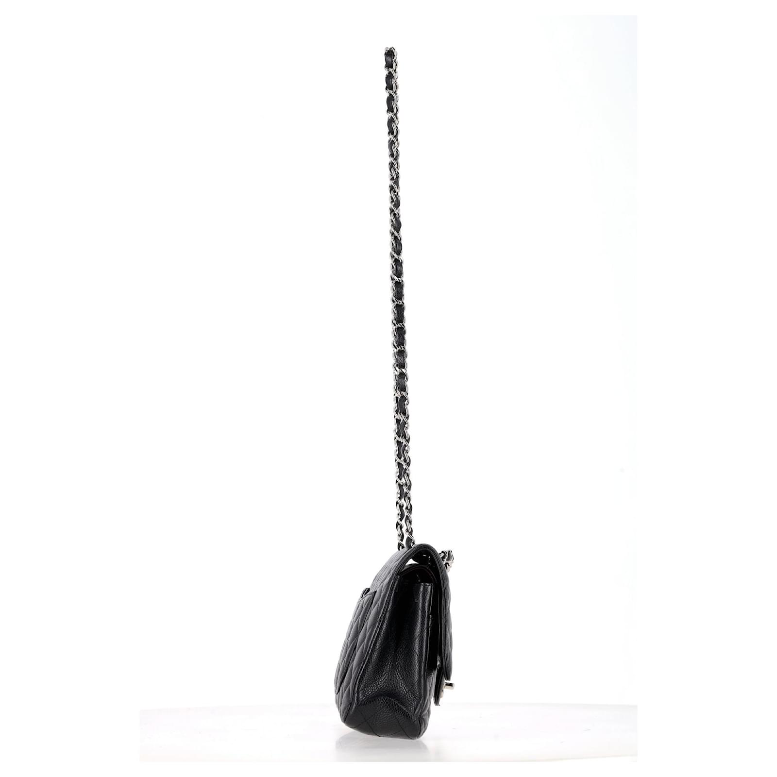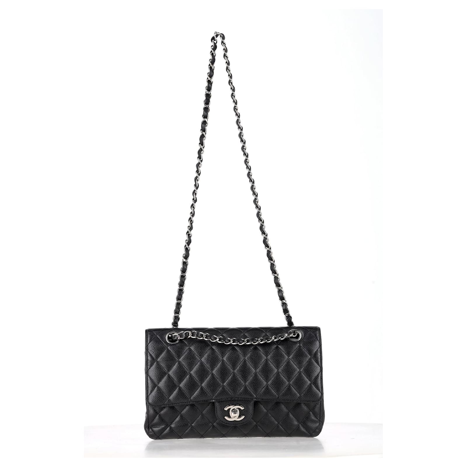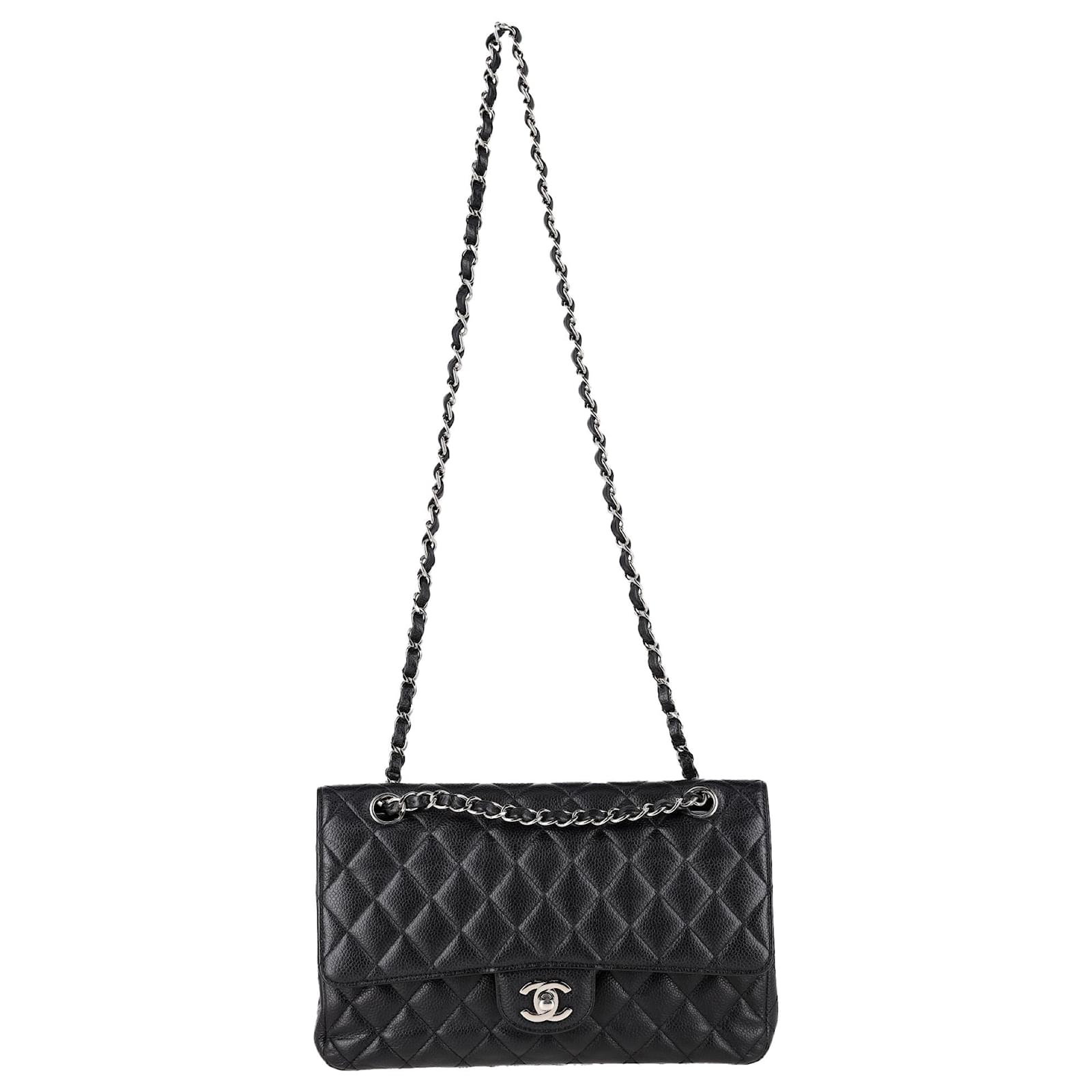 A timeless icon of Parisian elegance, the Chanel Medium Double Flap Bag in black caviar leather is the ultimate investment piece. Its signature diamond quilting, silver-tone CC turn-lock, and leather-threaded chain strap embody the house’s heritage of effortless sophistication. The structured silhouette opens to reveal an inner flap and a rich burgundy leather interior, complete with thoughtfully placed pockets — a masterclass in both form and function.