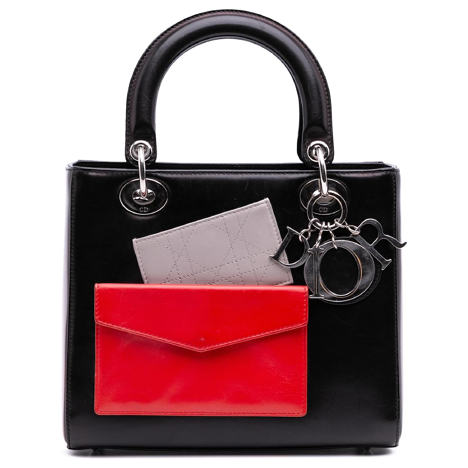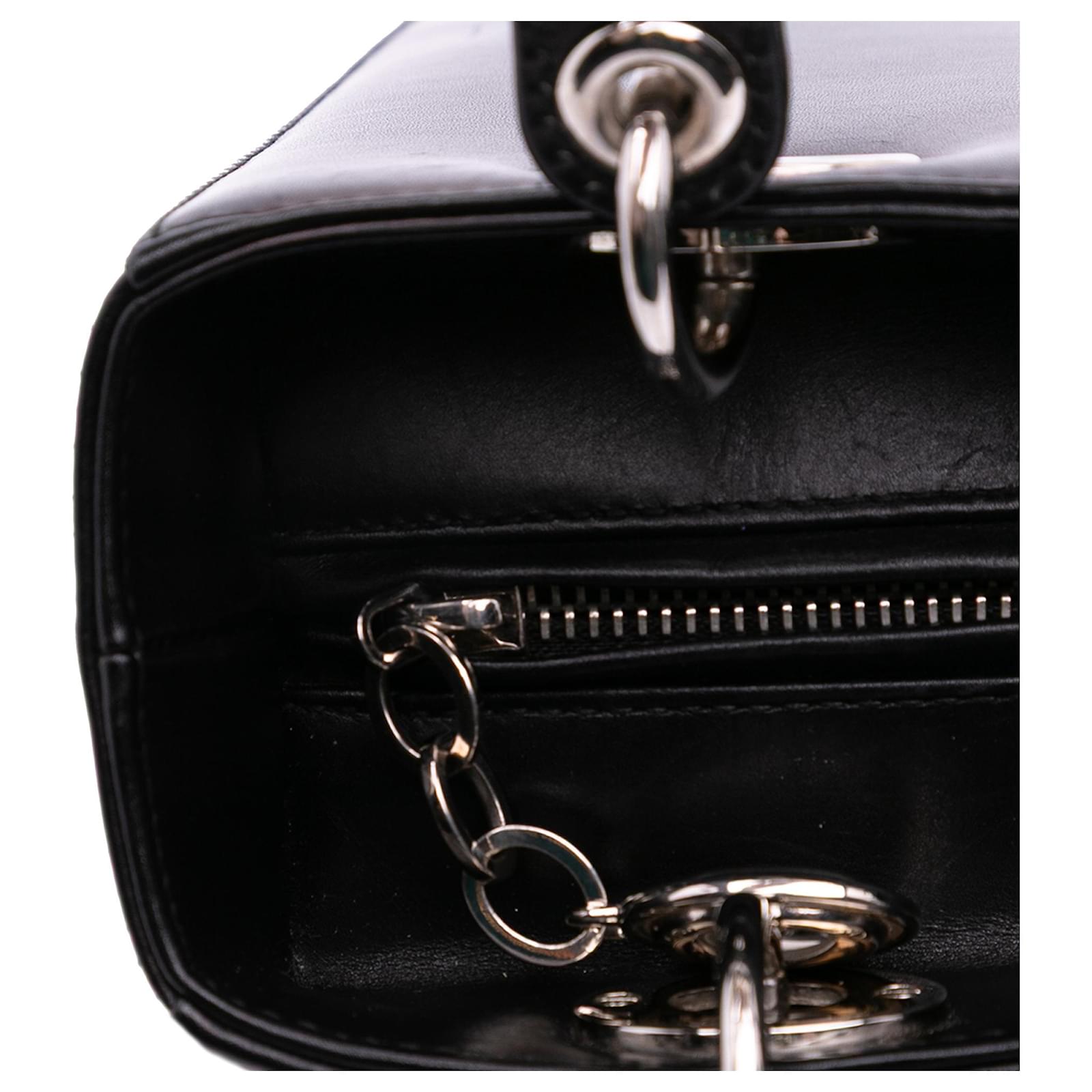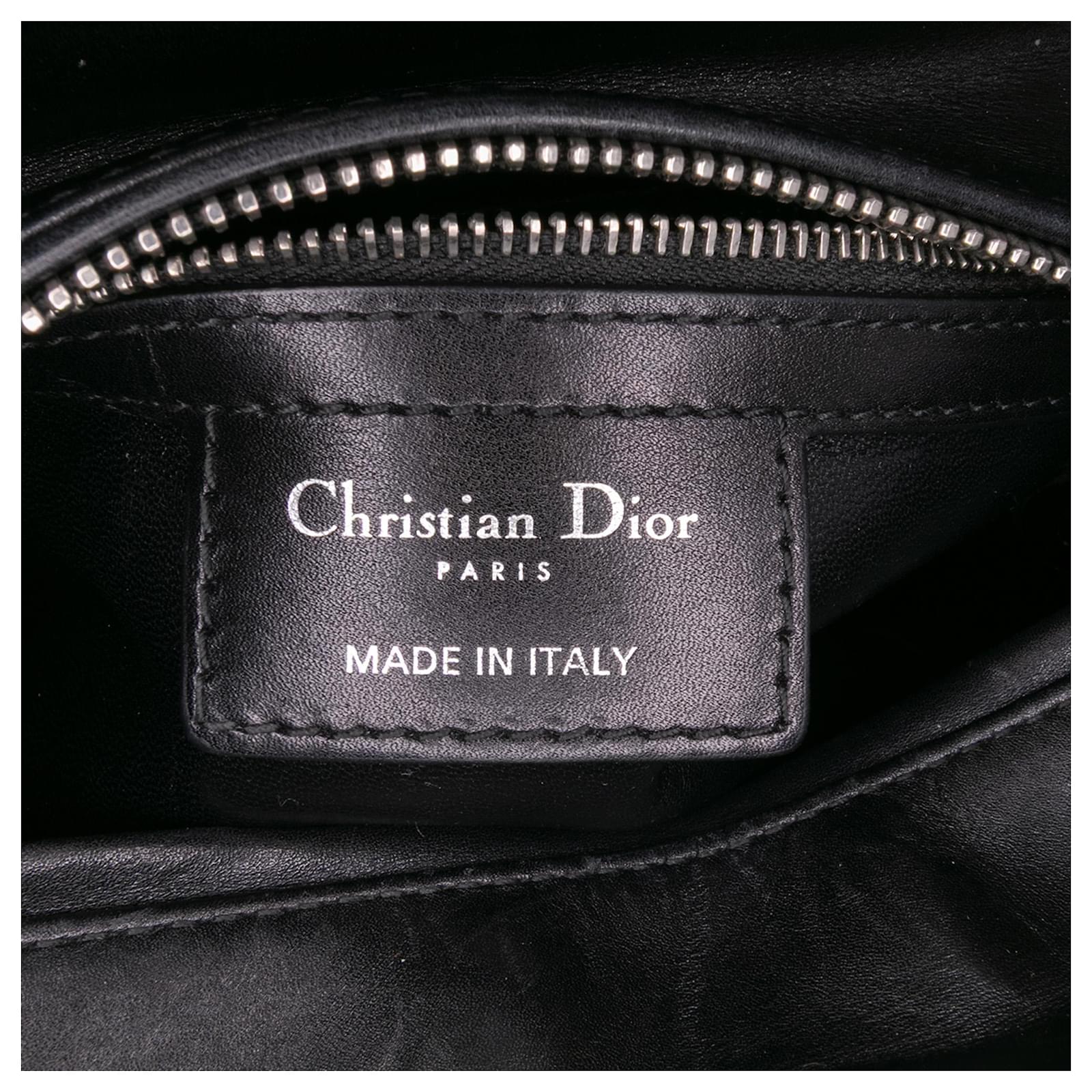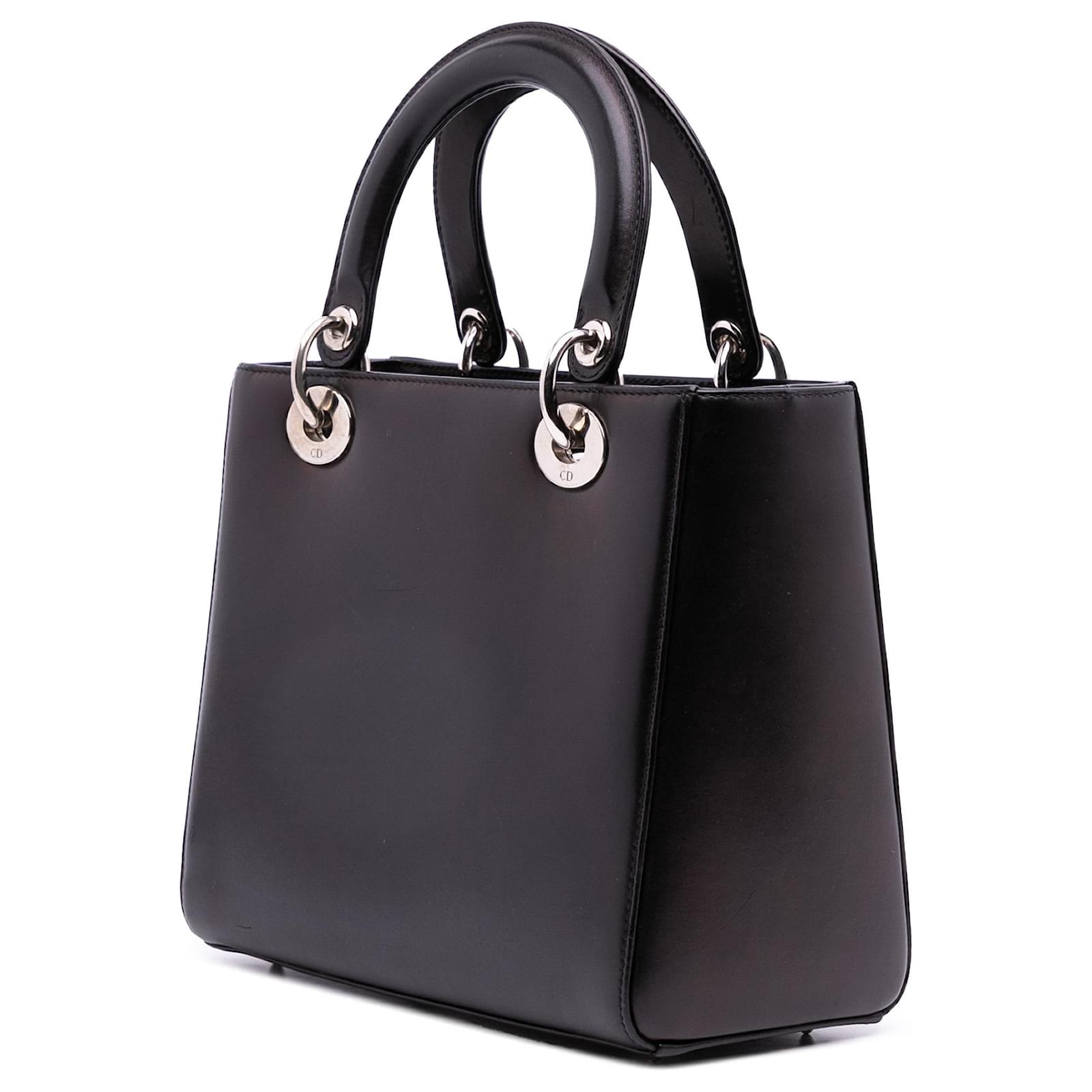 The Lady Dior features a leather body, flat leather top handles, a detachable flat shoulder strap, a top zip closure, and an interior zip pocket. It carries a B+ condition rating.