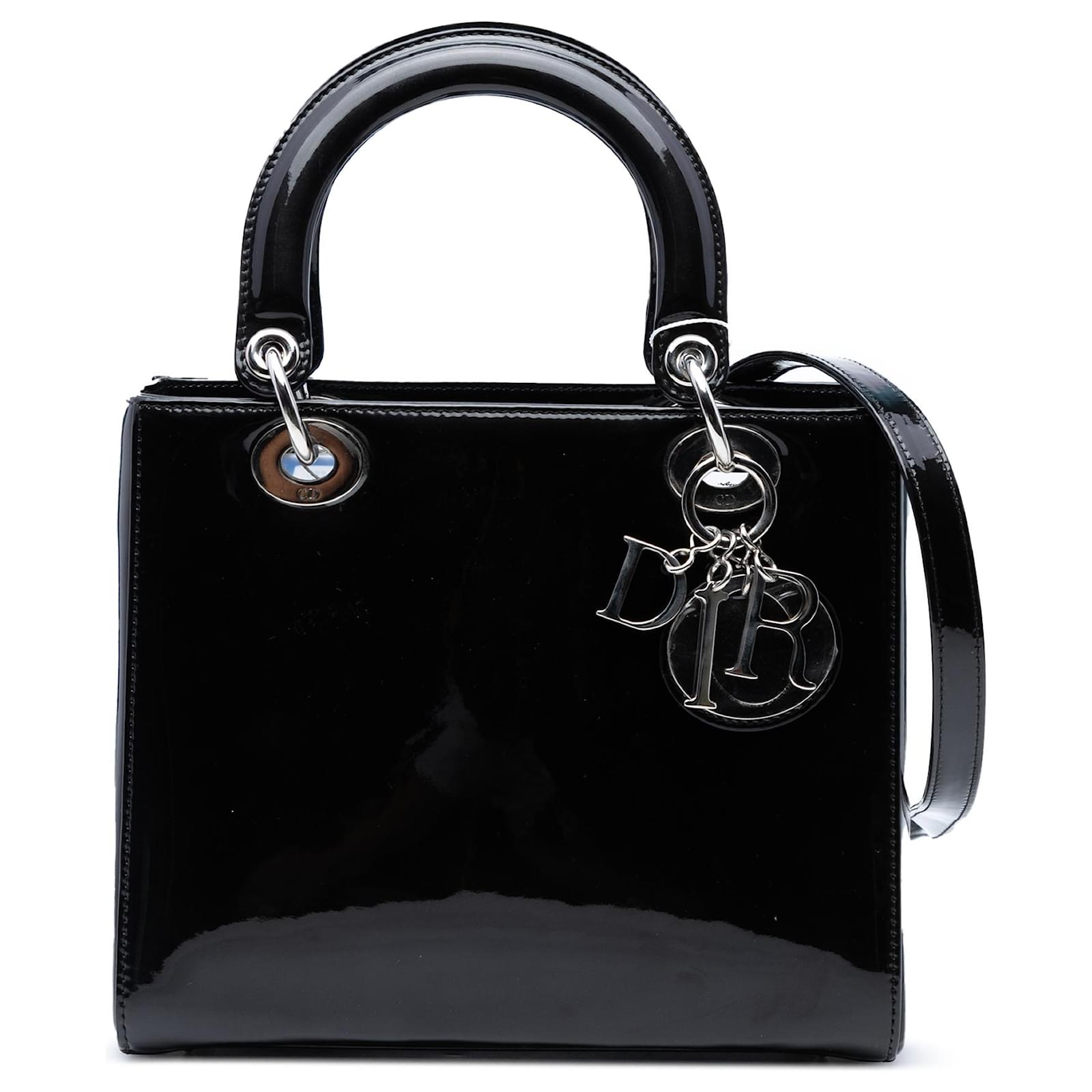 The Lady Dior features a patent leather body, flat leather top handles, a detachable flat leather shoulder strap, a top zip closure, and an interior zip pocket. It carries a B+ condition rating.