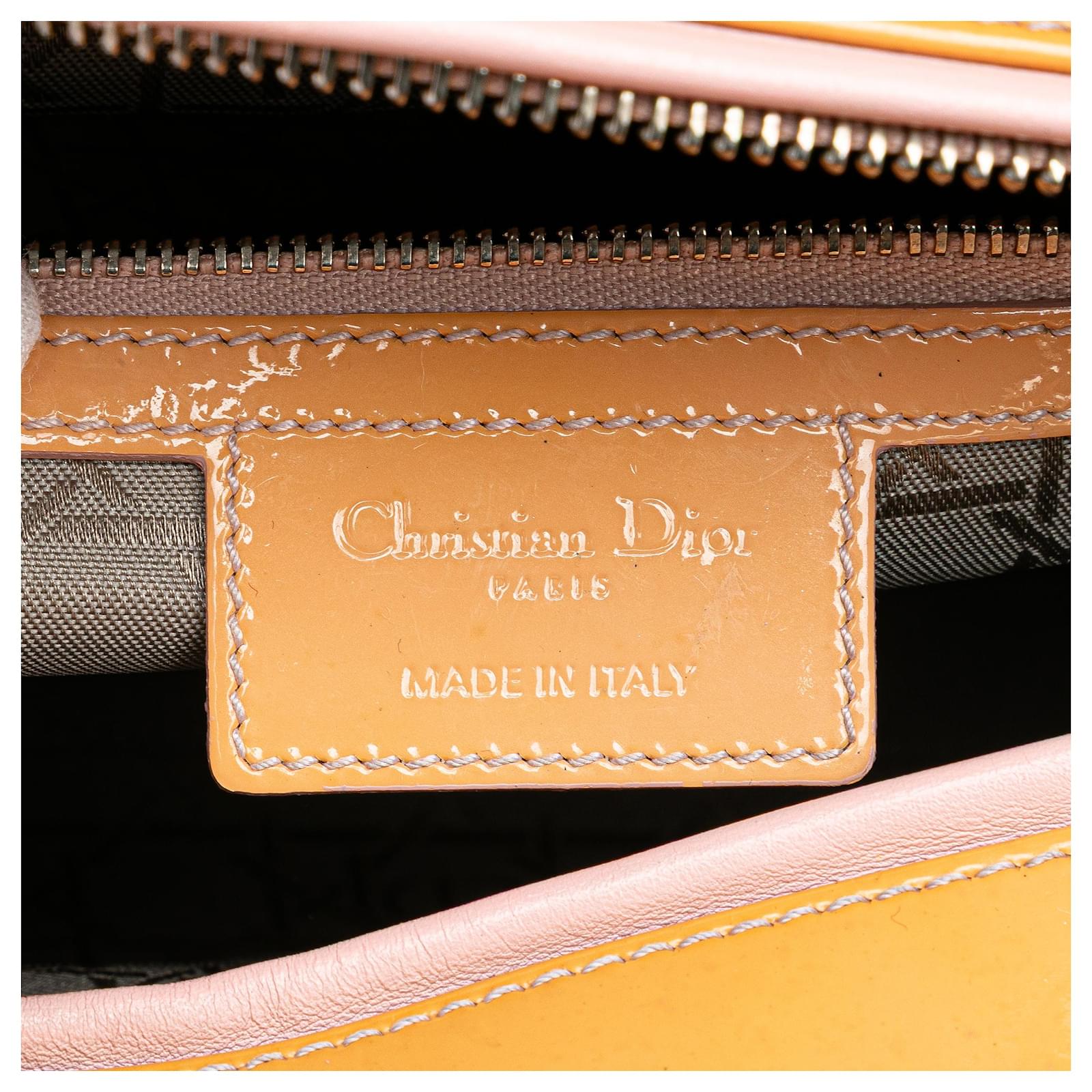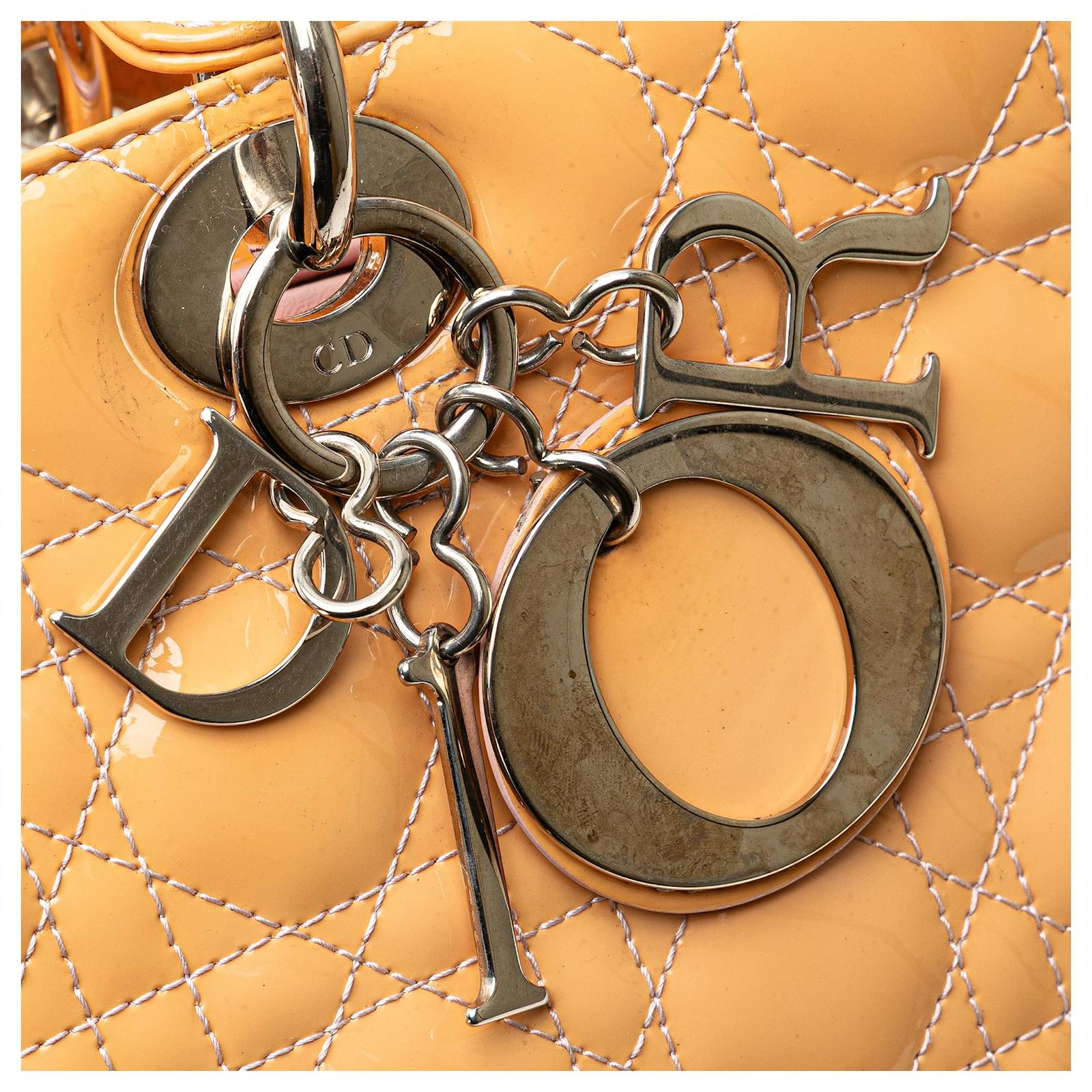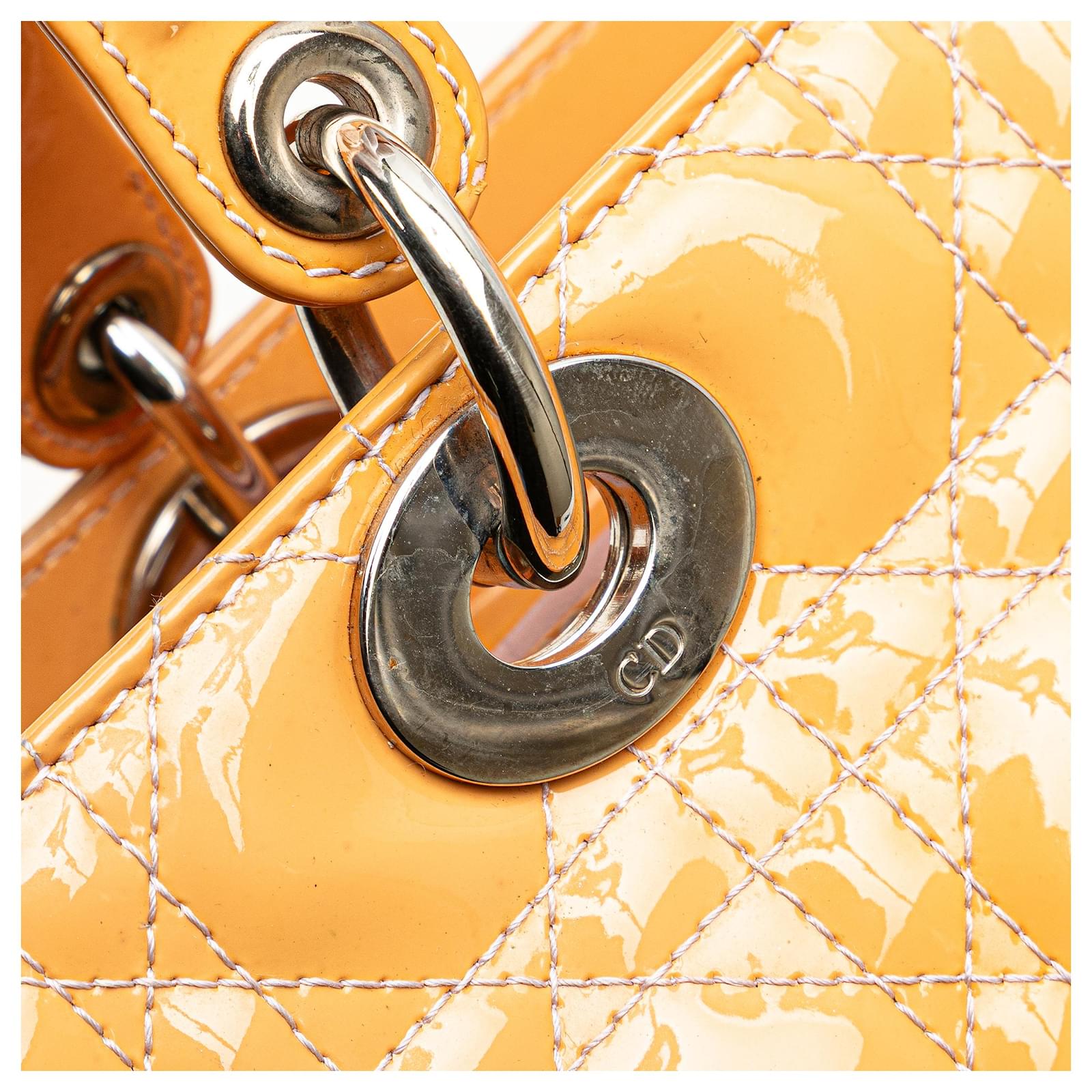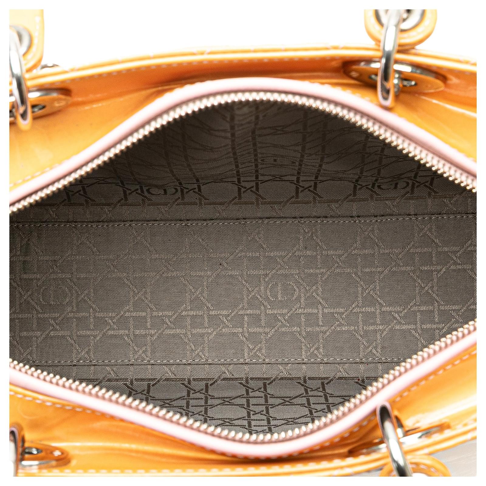 The Lady Dior features a patent leather body, flat leather handles, a detachable flat leather strap, a top zip closure, and an interior zip pocket. It carries a B+ condition rating.