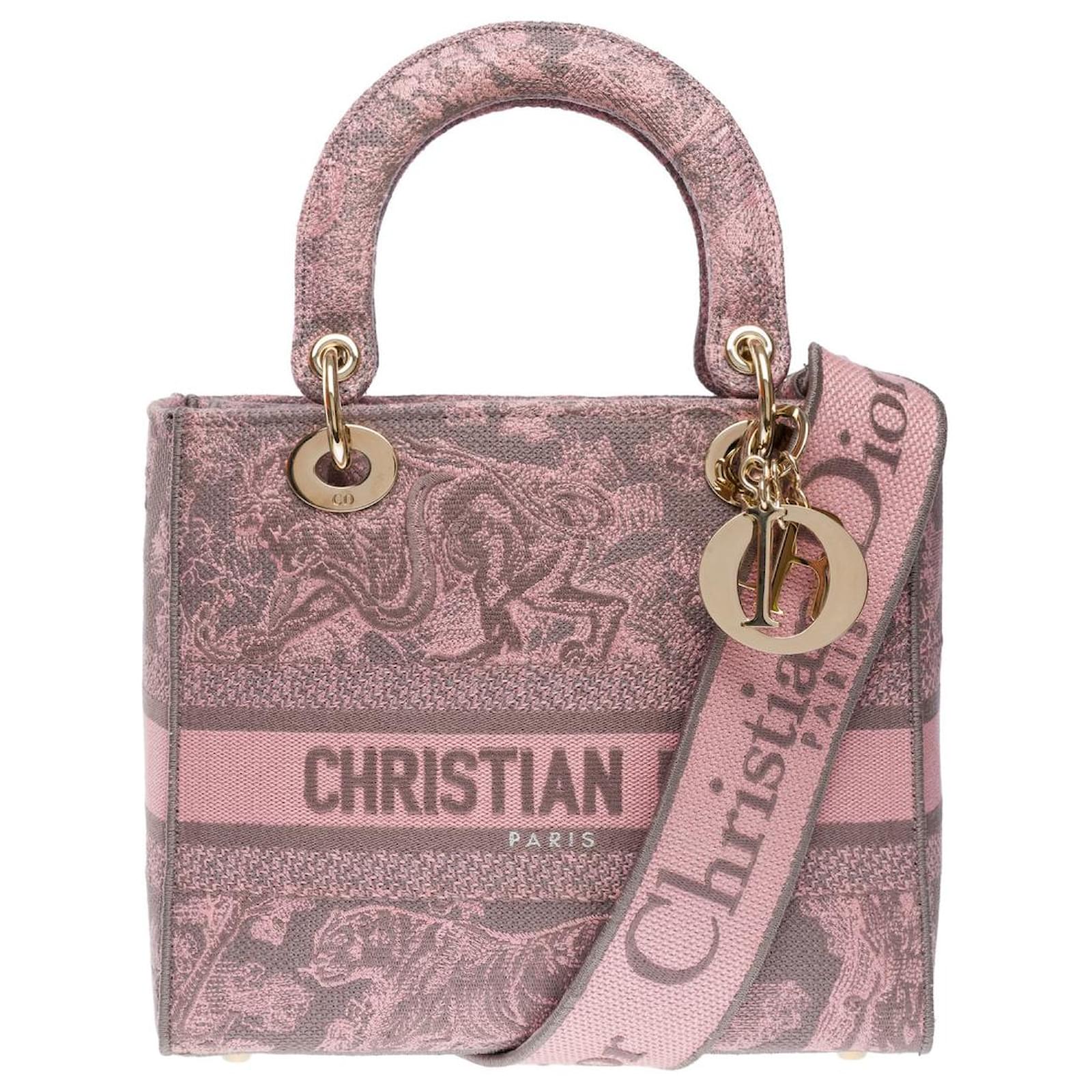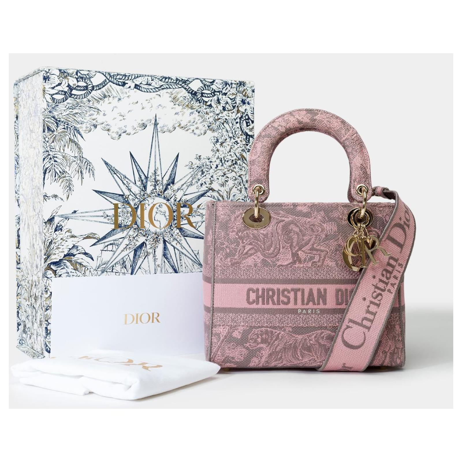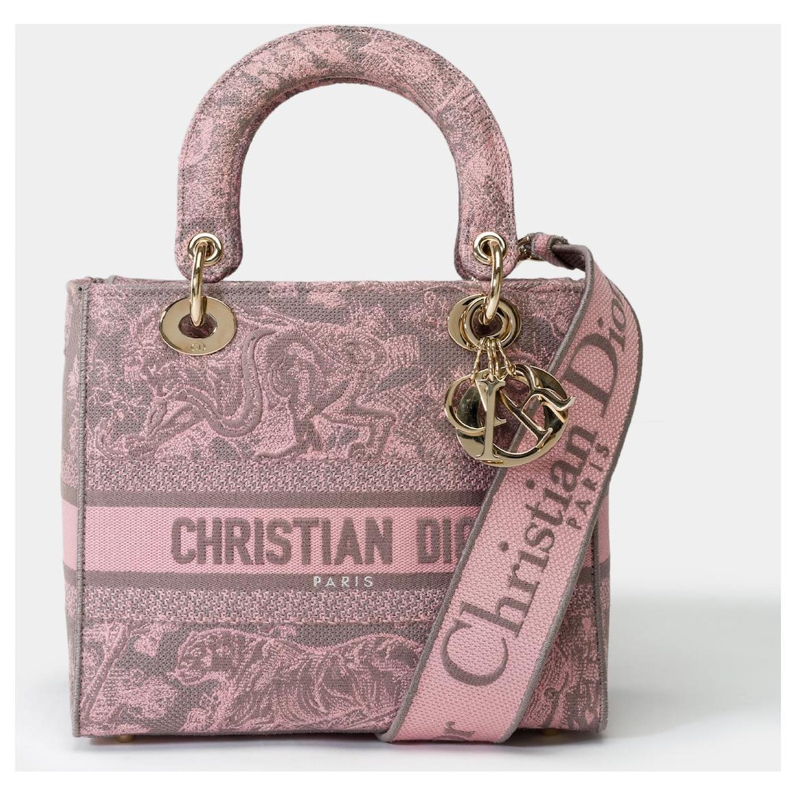 The Lady D-Lite bag embodies classic elegance combined with the modernity of the Dior house. This creation is entirely embroidered with the pink Reverse Toile de Jouy pattern, showcasing the house's iconic motif through a play of inverted colors. The front is punctuated by the signature Christian Dior Paris, while the thick D.I.O.R. charms in gold metal enhance and illuminate its silhouette. Featuring a wide embroidered, reversible, and removable shoulder strap, this medium Lady D-Lite bag can be carried by hand or crossbody.