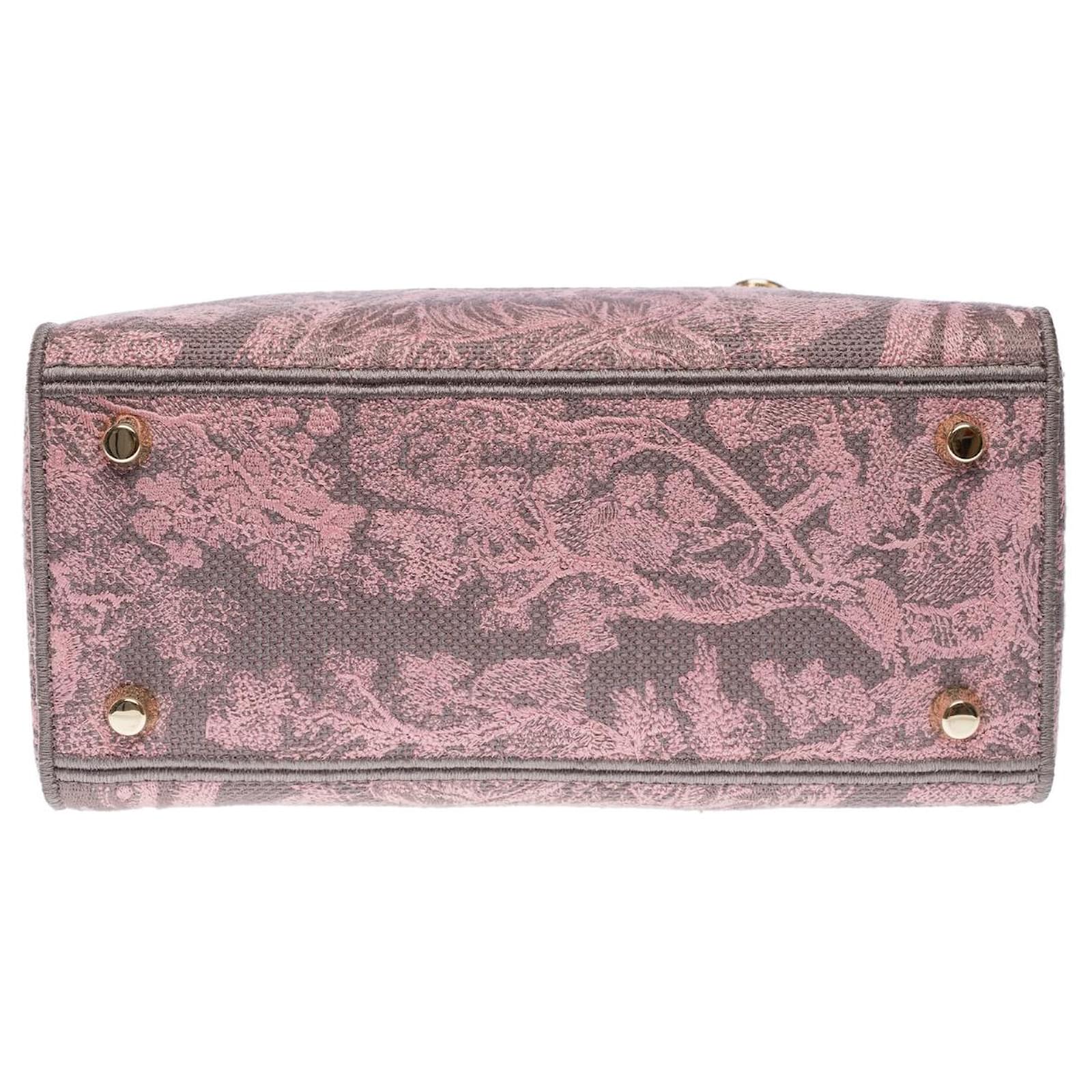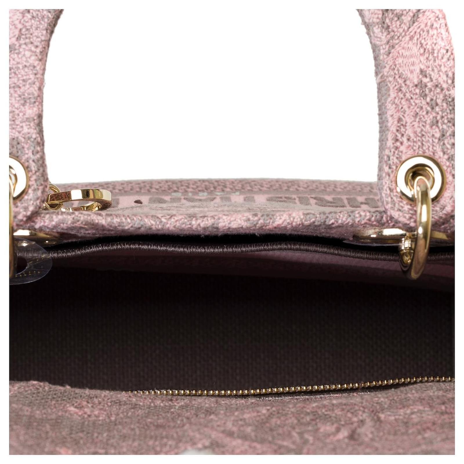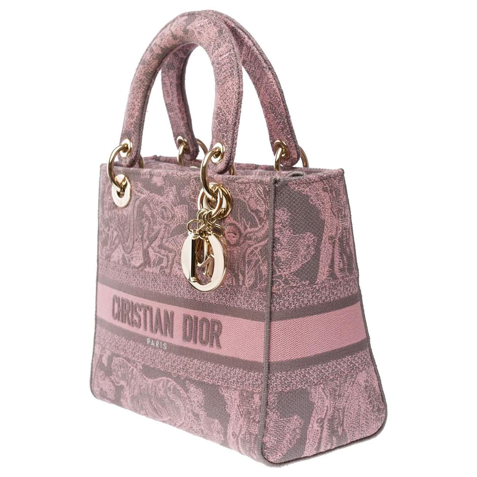 The Lady D-Lite bag embodies classic elegance combined with the modernity of the Dior house. This creation is entirely embroidered with the pink Reverse Toile de Jouy pattern, showcasing the house's iconic motif through a play of inverted colors. The front is punctuated by the signature Christian Dior Paris, while the thick D.I.O.R. charms in gold metal enhance and illuminate its silhouette. Featuring a wide embroidered, reversible, and removable shoulder strap, this medium Lady D-Lite bag can be carried by hand or crossbody.