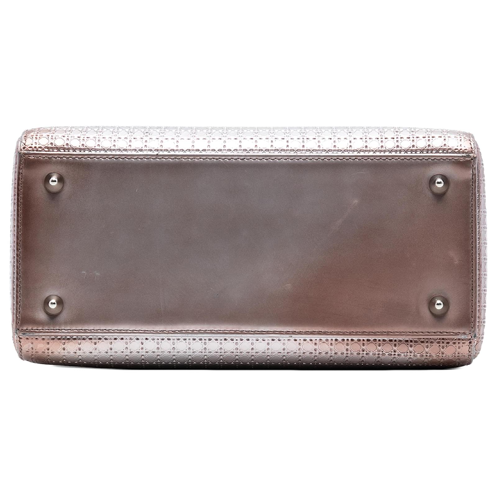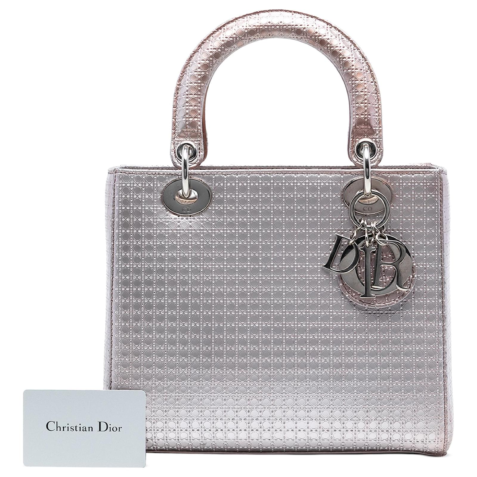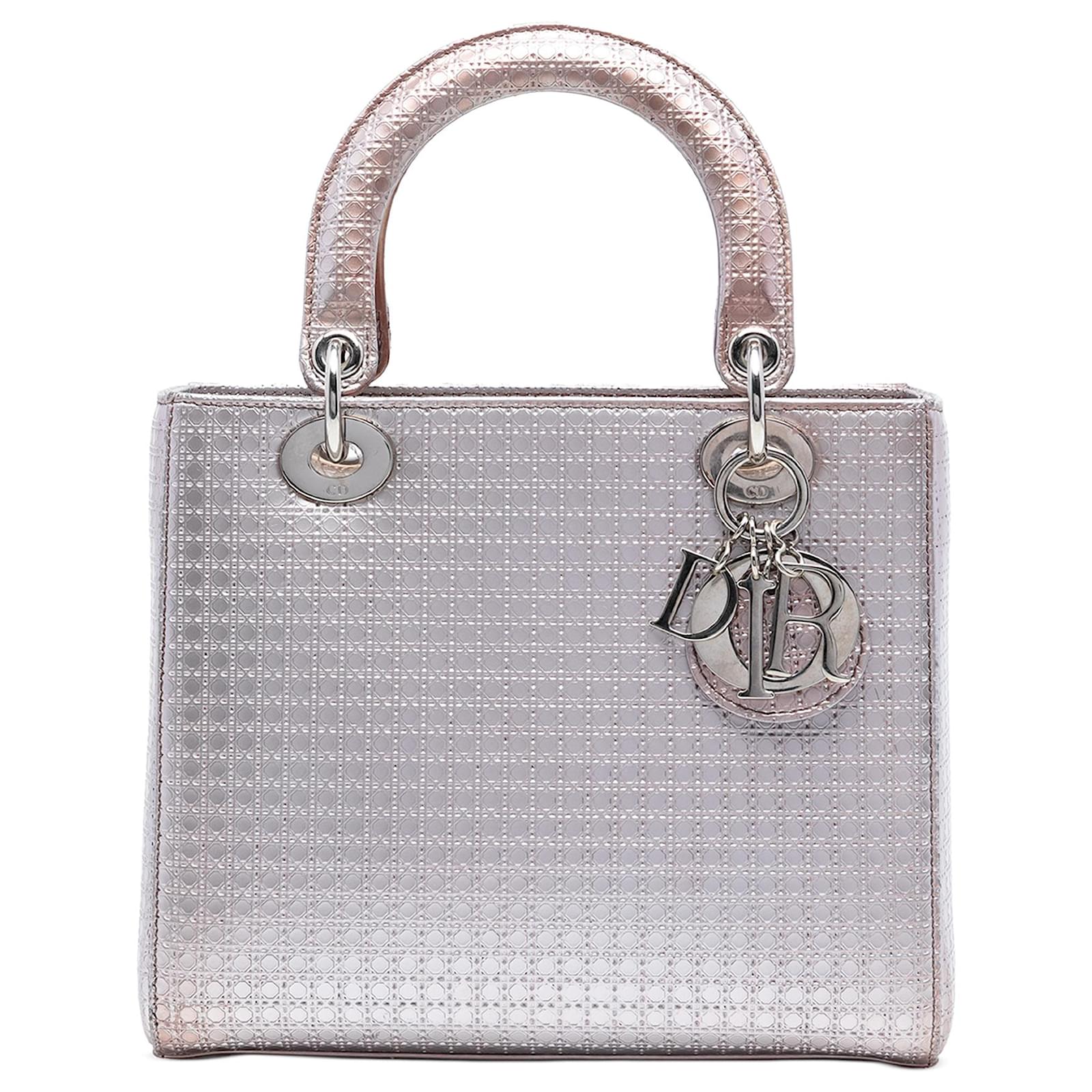 The Lady Dior features a quilted metallic patent leather body, flat leather handles, a detachable strap, a top zip closure, and an interior zip pocket. It carries a B+ condition rating.
