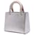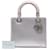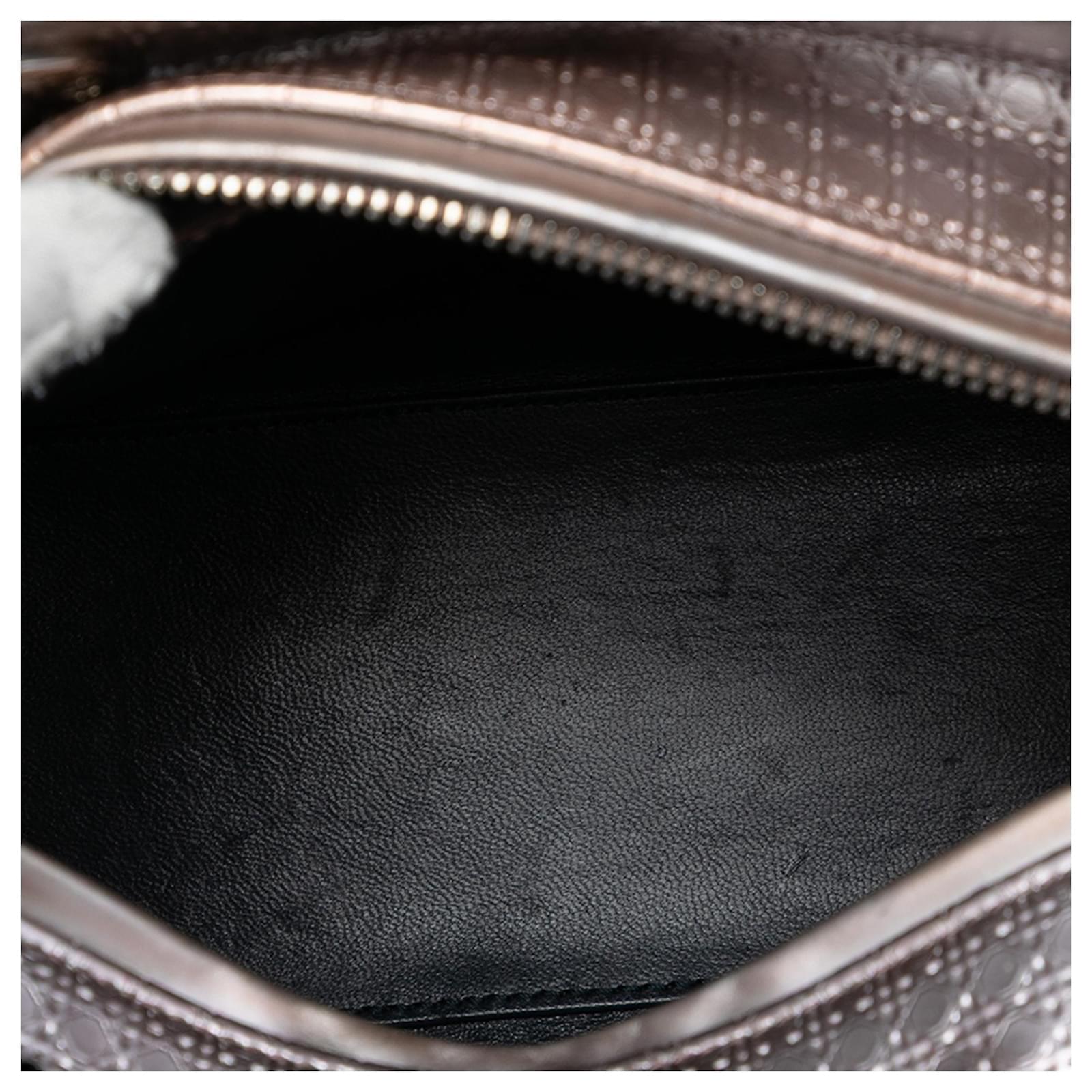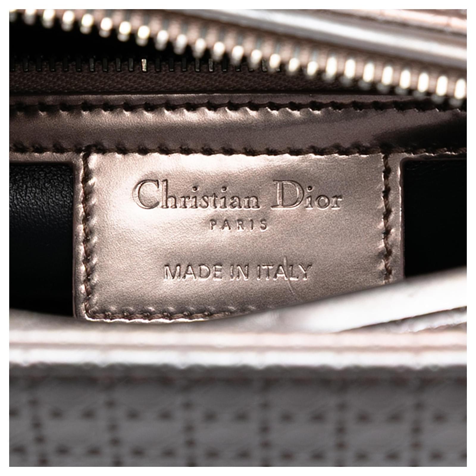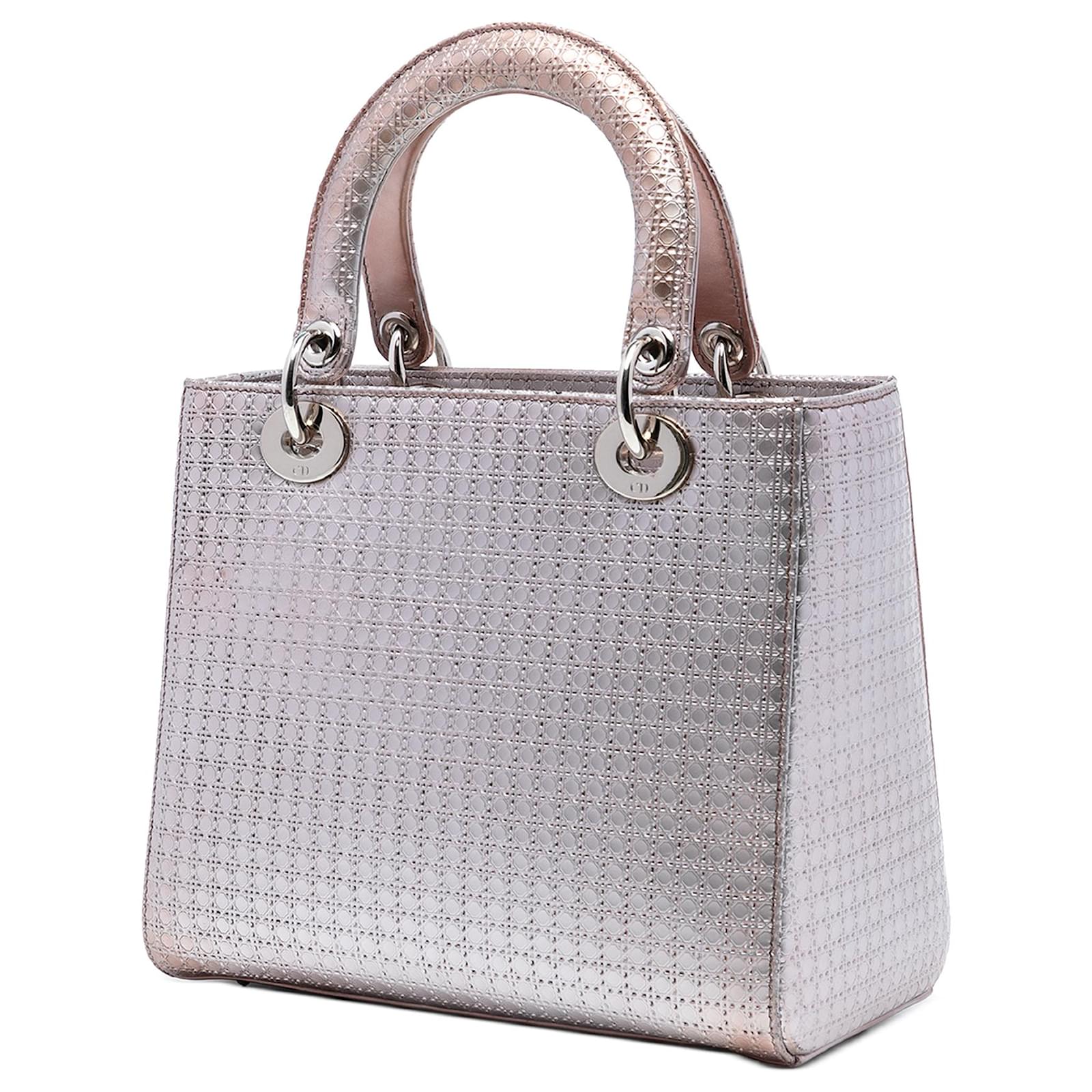 The Lady Dior features a quilted metallic patent leather body, flat leather handles, a detachable strap, a top zip closure, and an interior zip pocket. It carries a B+ condition rating.