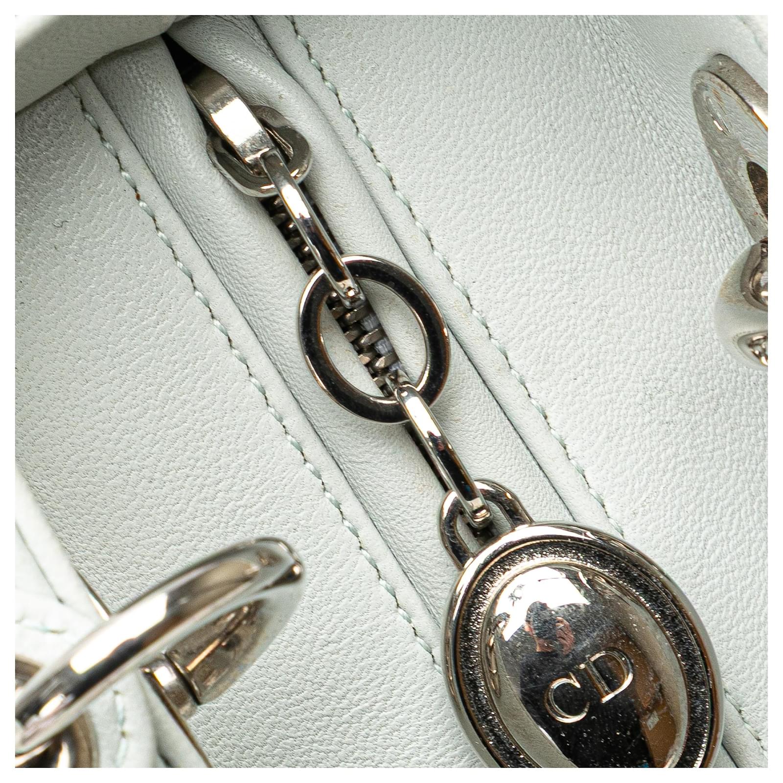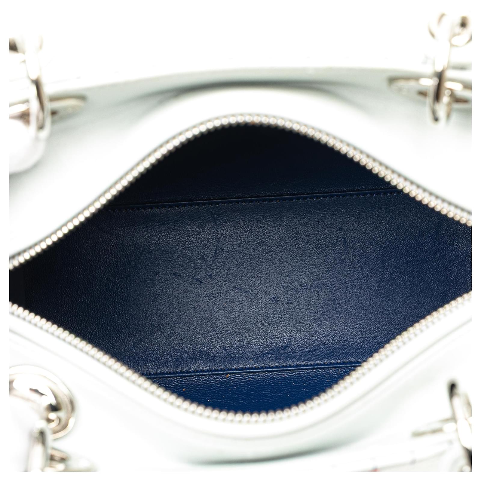 The Lady Dior satchel features an embroidered leather body, flat leather handles, a detachable flat leather strap, a top zip closure, and an interior zip pocket. It carries a B+ condition rating.