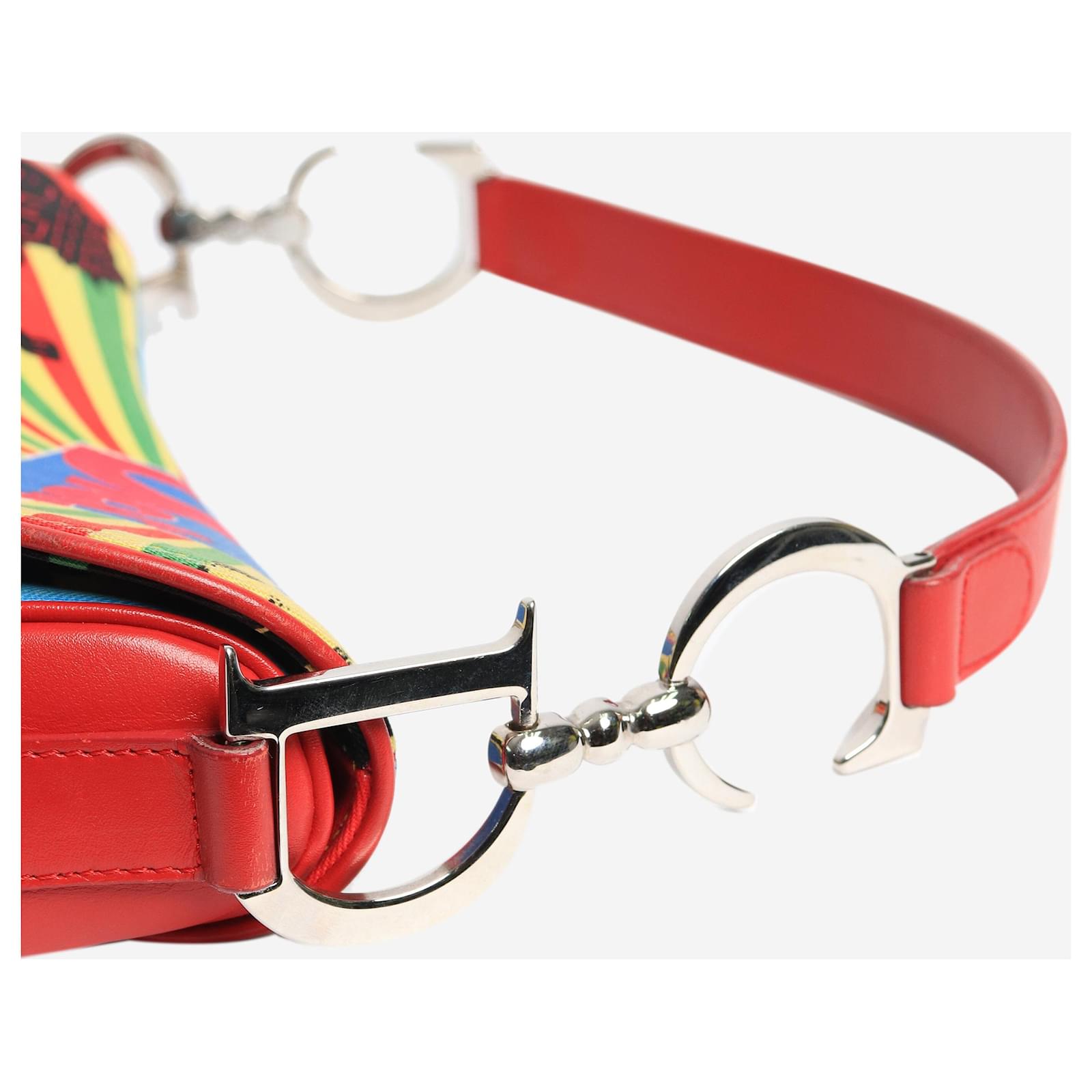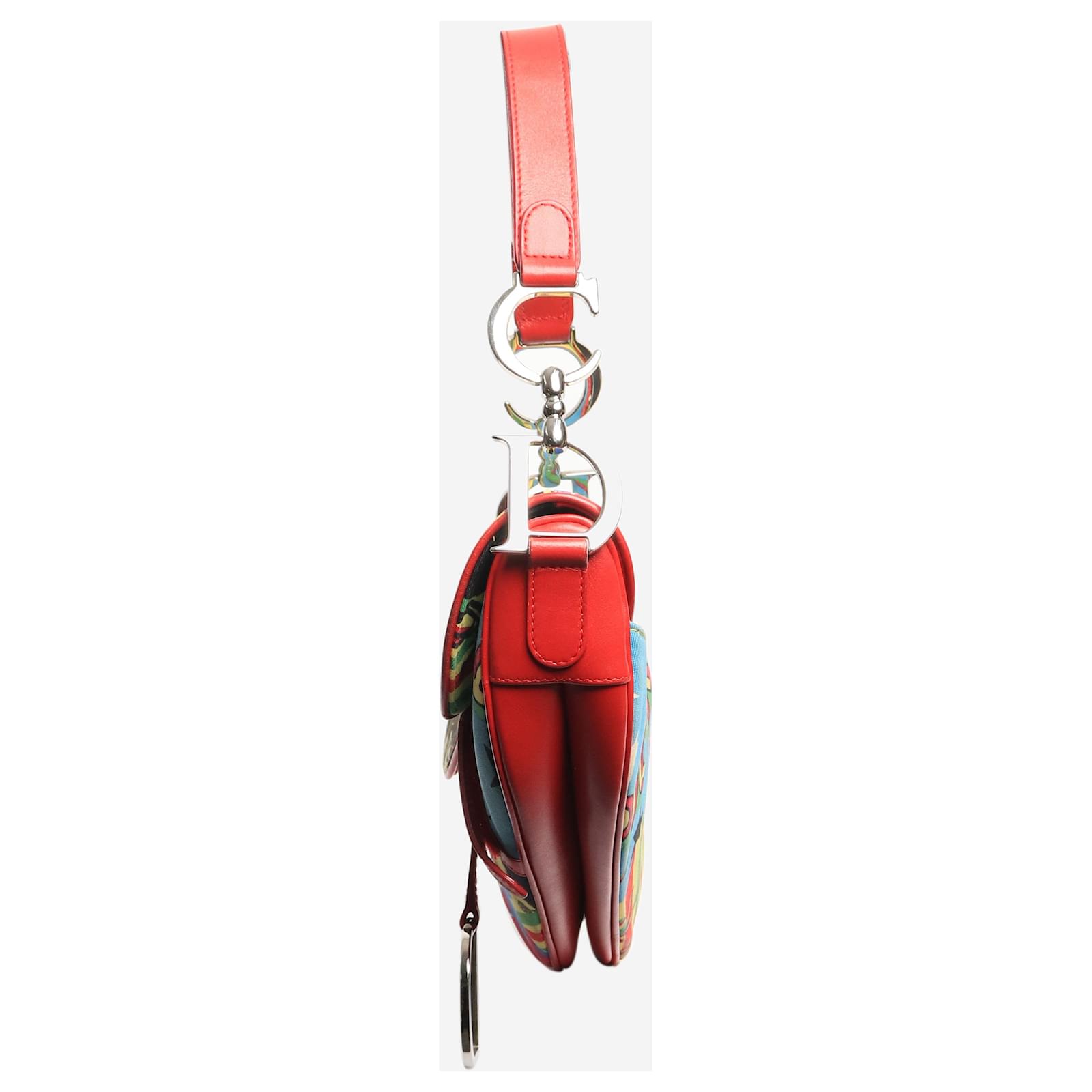 Christian Dior multicolour vintage 2003 Bob Marley Saddle bag with silver hardware. This bag has a flap closure. Main compartment with an interior zipped pocket. Outer slip pocket at the rear. Signature D ring on the flap and CD hardware linking the strap to the bag.