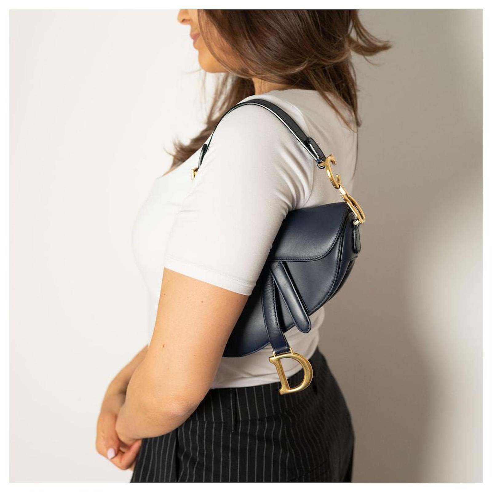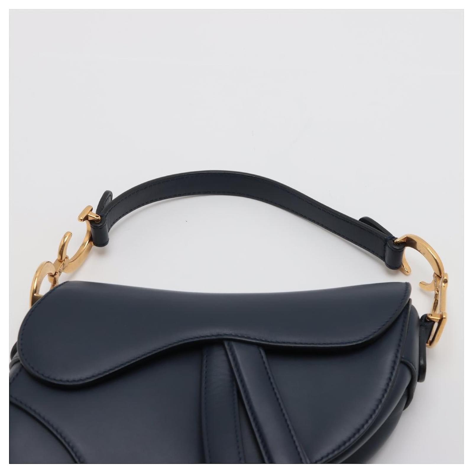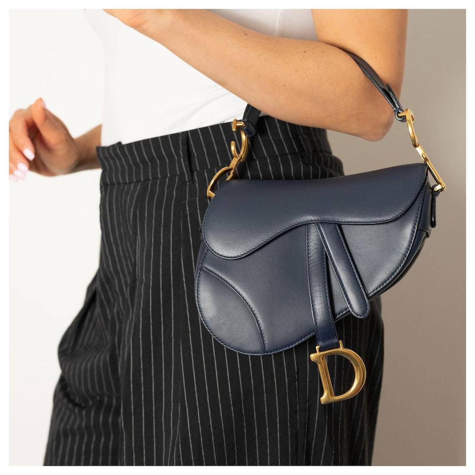 Introducing the Dior Saddle Mini Ultrasmooth Calfskin Leather Handbag in a sophisticated navy hue, a rare find that effortlessly combines elegance with modern flair. In excellent condition, this handbag showcases the iconic saddle silhouette, complete with a striking gold-tone 'D' charm that adds a touch of opulence. Its compact size makes it an ideal choice for evening wear or chic outings, allowing you to carry your essentials with style. 100% authenticity guaranteed, this piece exemplifies Dior's commitment to timeless design and craftsmanship, making it a worthy addition to any luxury collection.