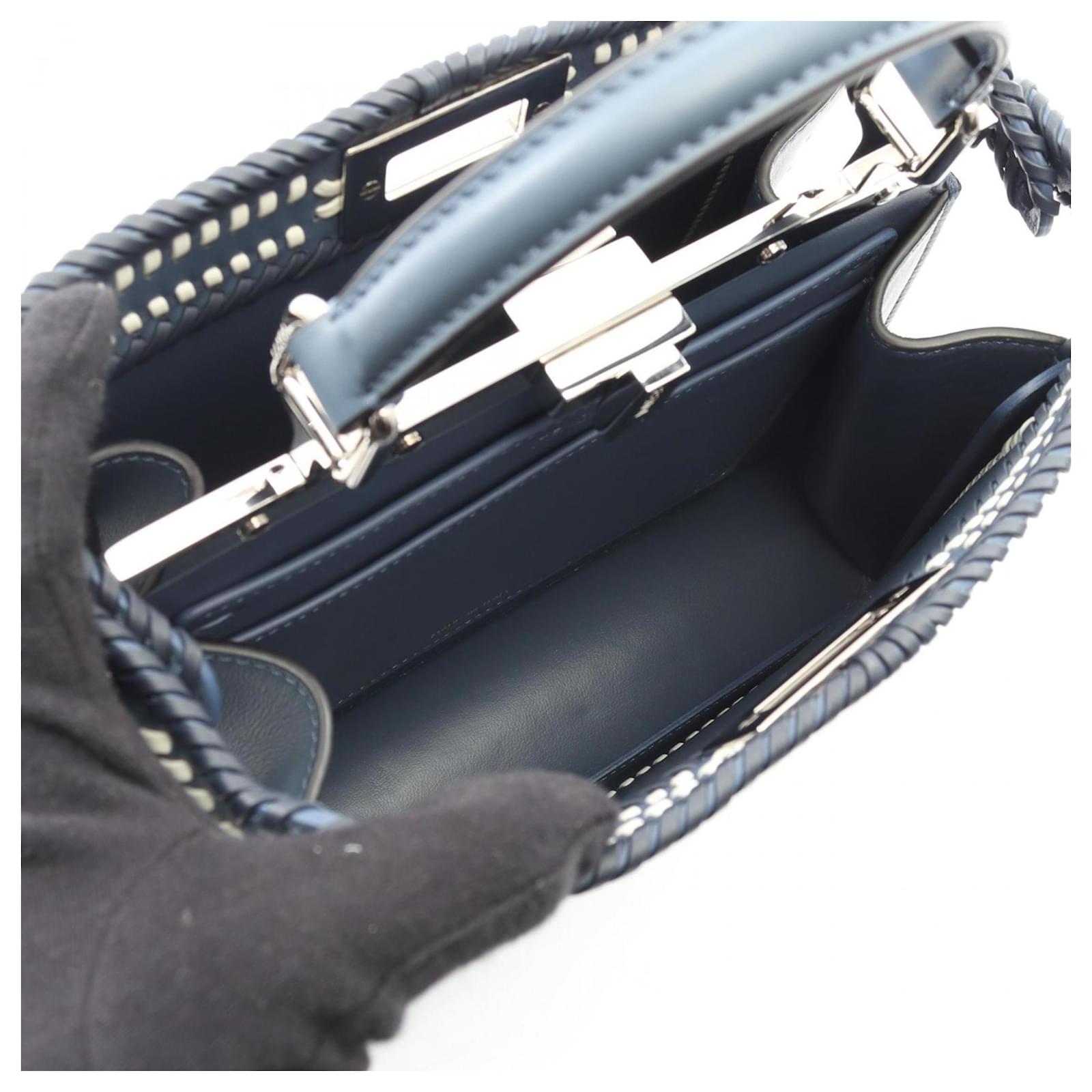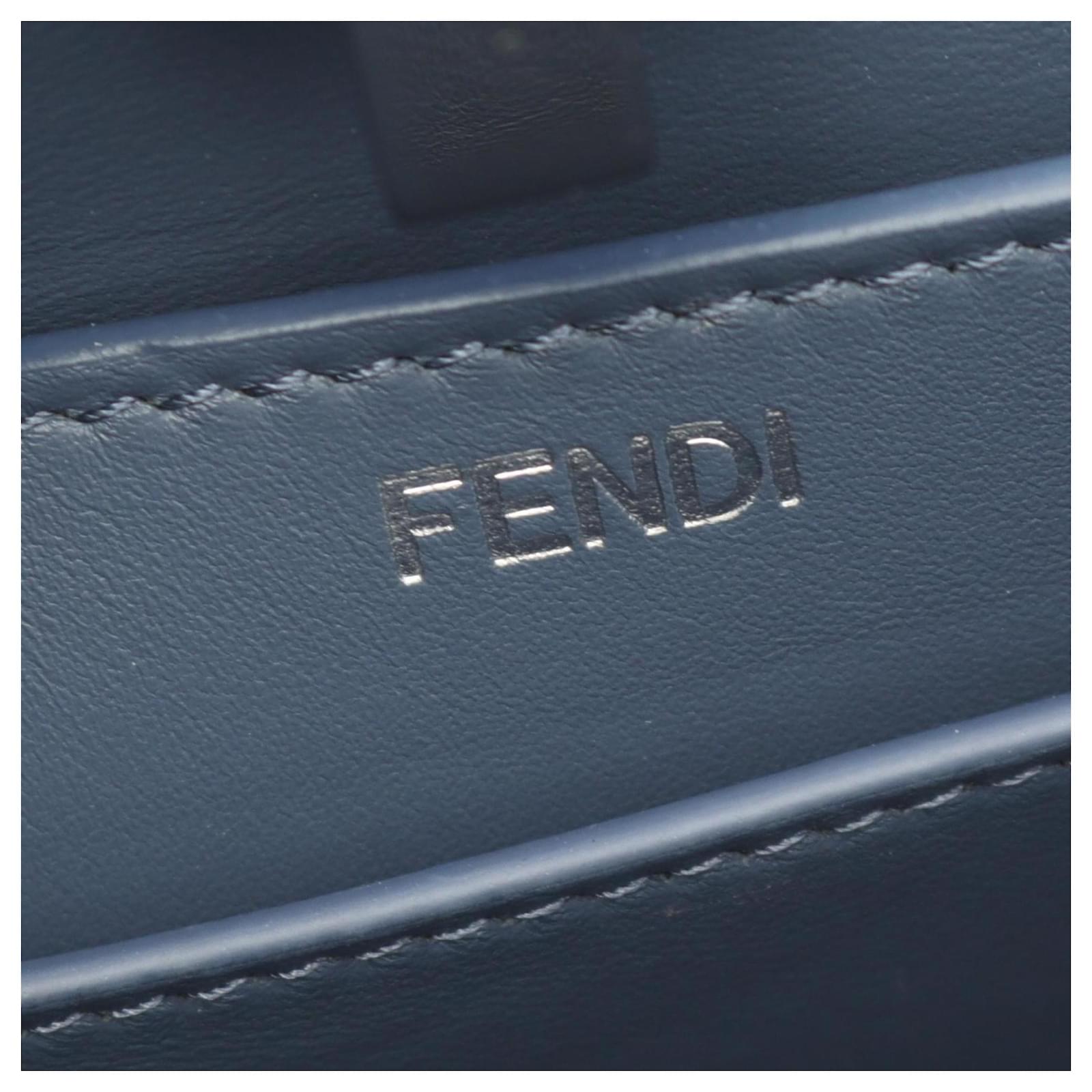This Fendi Peekaboo I See You Small Handbag is designed in a blend of blue, navy, and white leather, offering a stylish yet practical accessory for any outfit. Measuring 20 cm by 26 cm, this handbag is ideal for carrying essentials while maintaining a compact form.