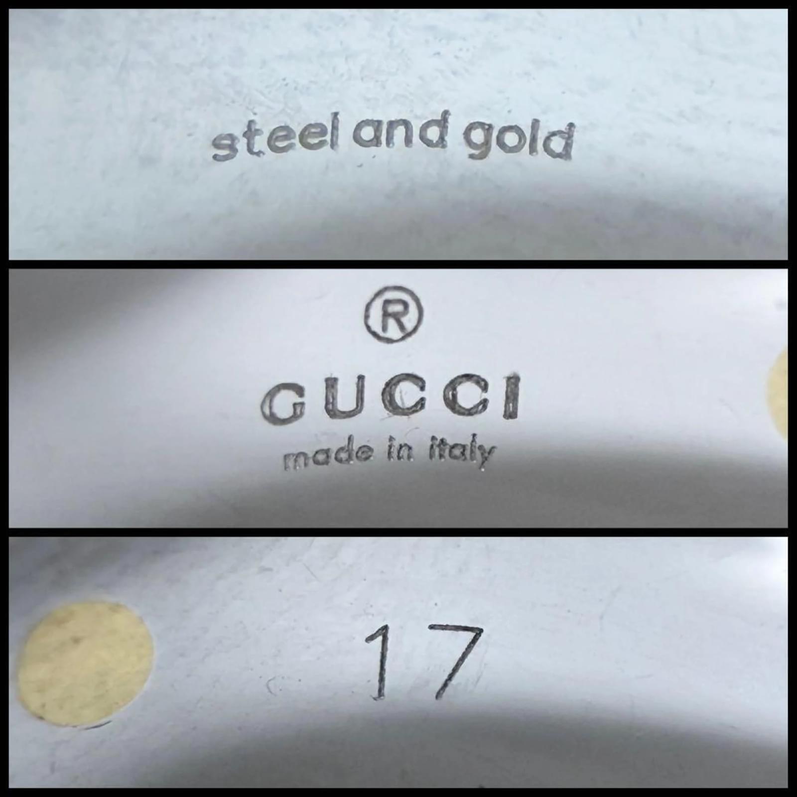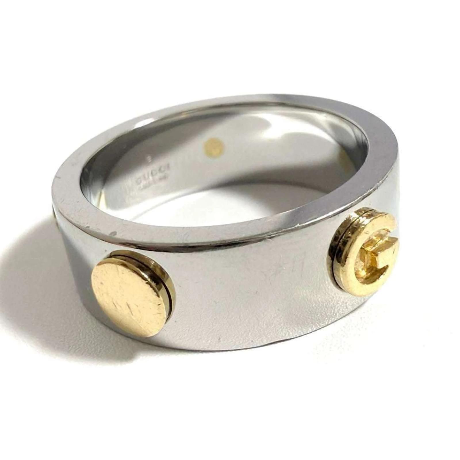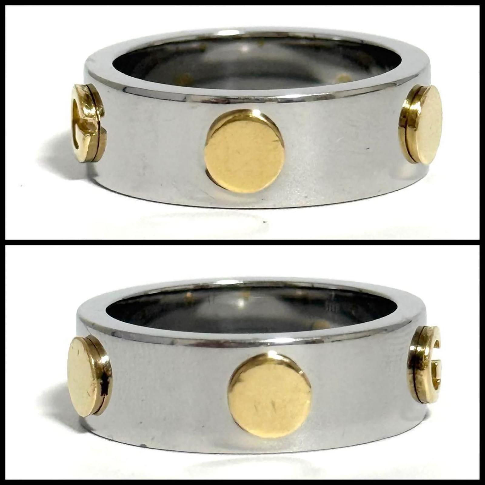 This Gucci men's combination ring features a design that blends stainless steel and gold, creating a sophisticated look. It is available in a Japanese size 16, which corresponds to a US size 8. The ring is classified as used but is in very good condition, with only slight traces of use, including minor scratches and dirt. It is important to review the provided images for a clear understanding of the item's condition. No additional accessories are included with the purchase.