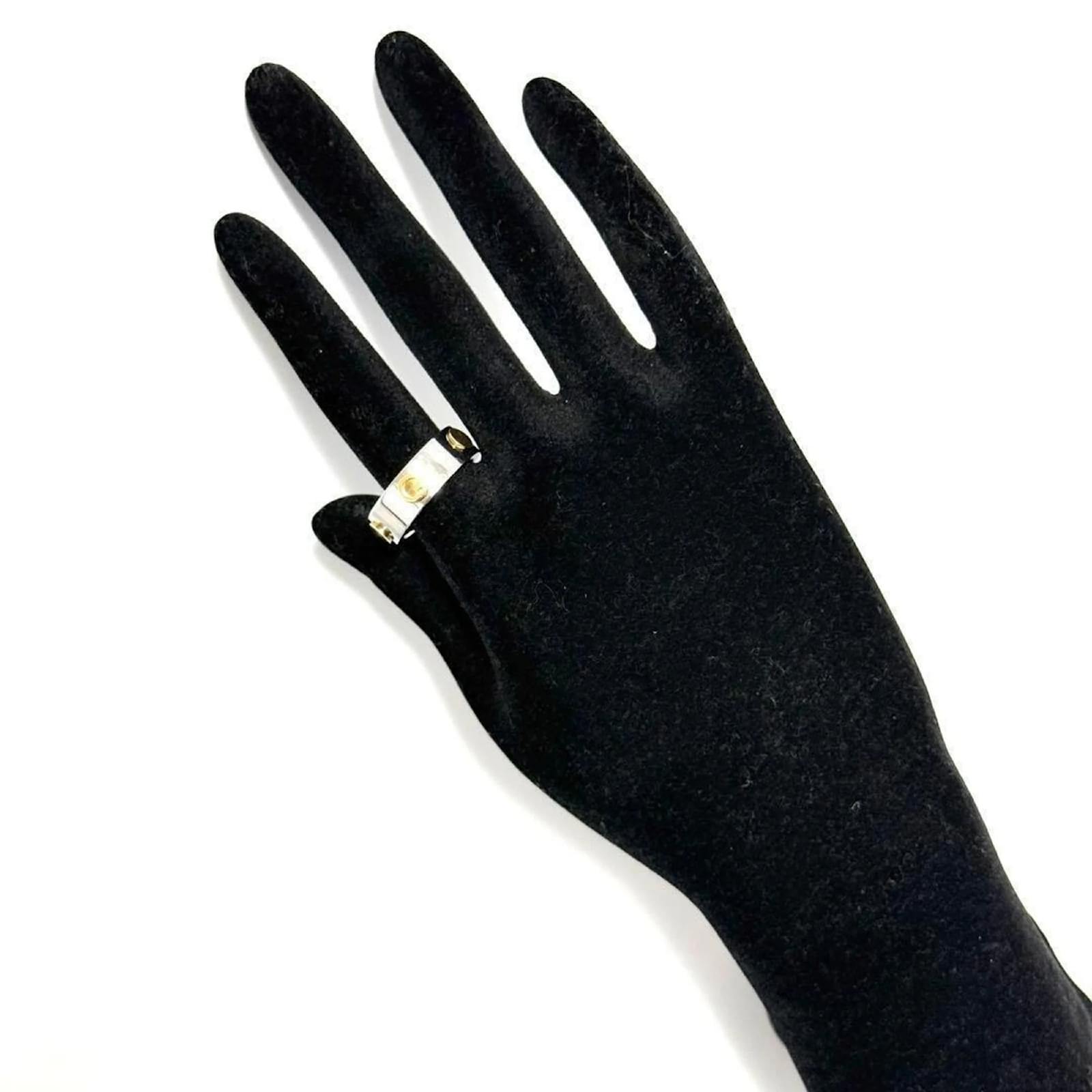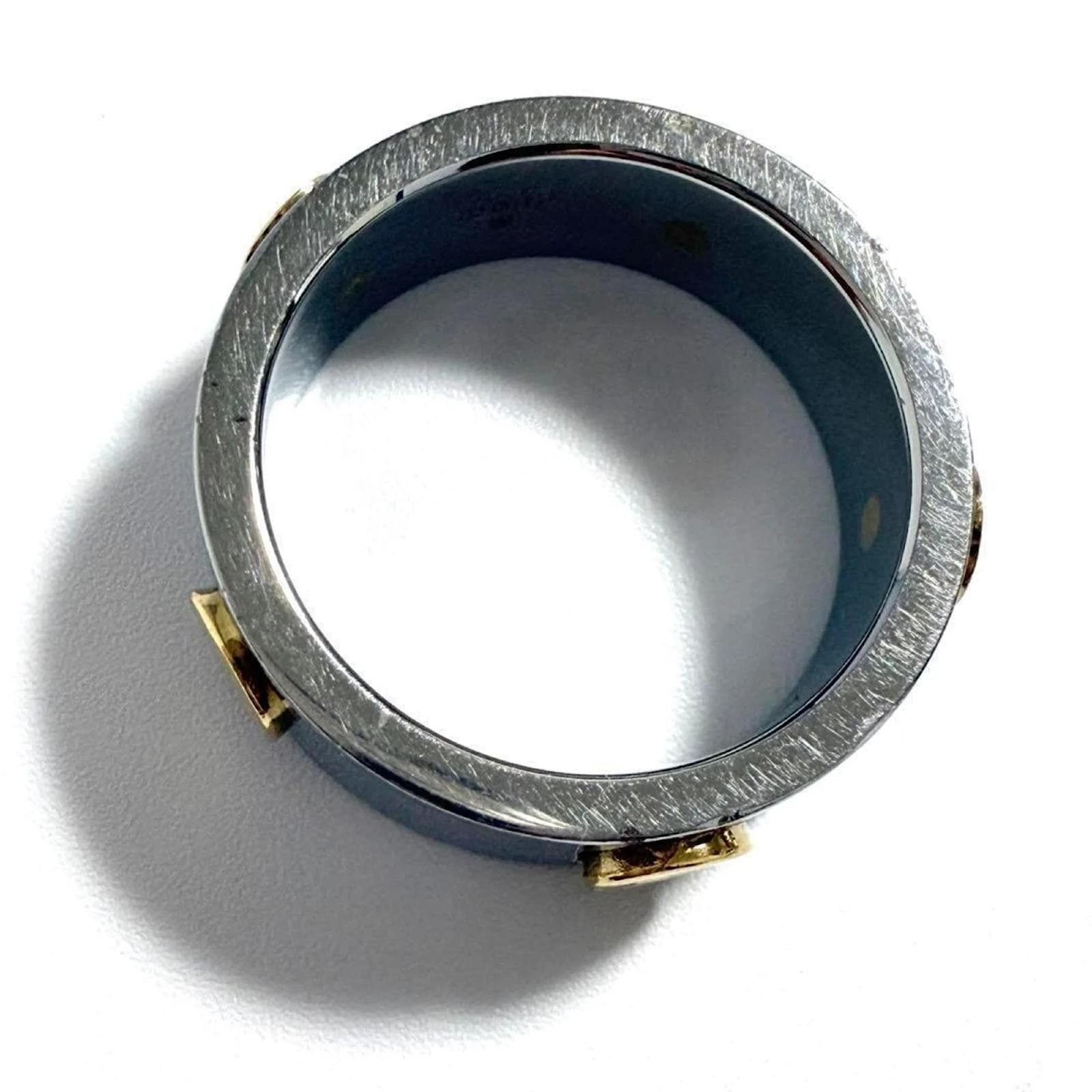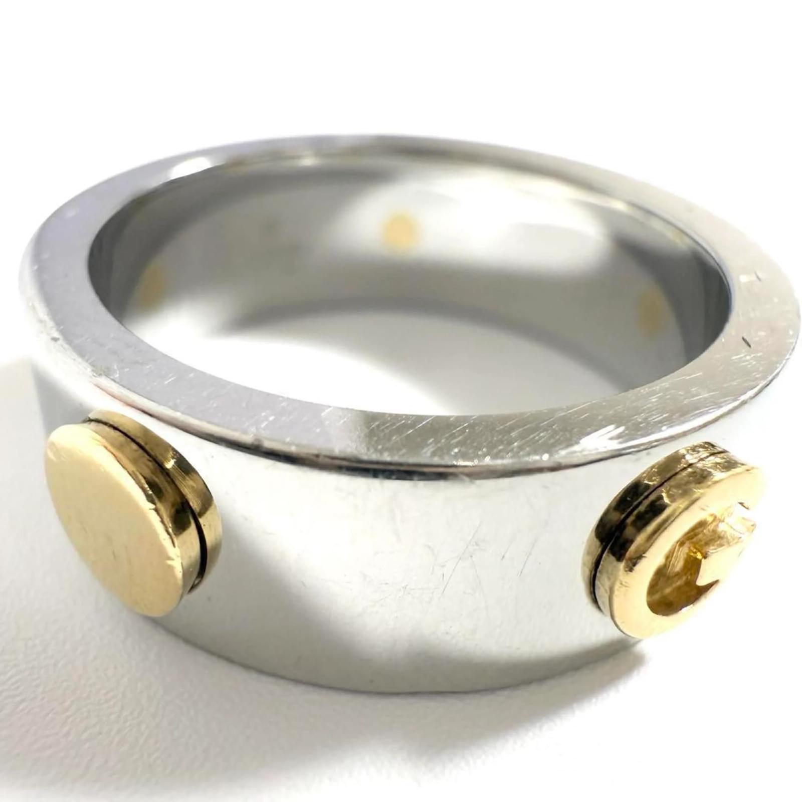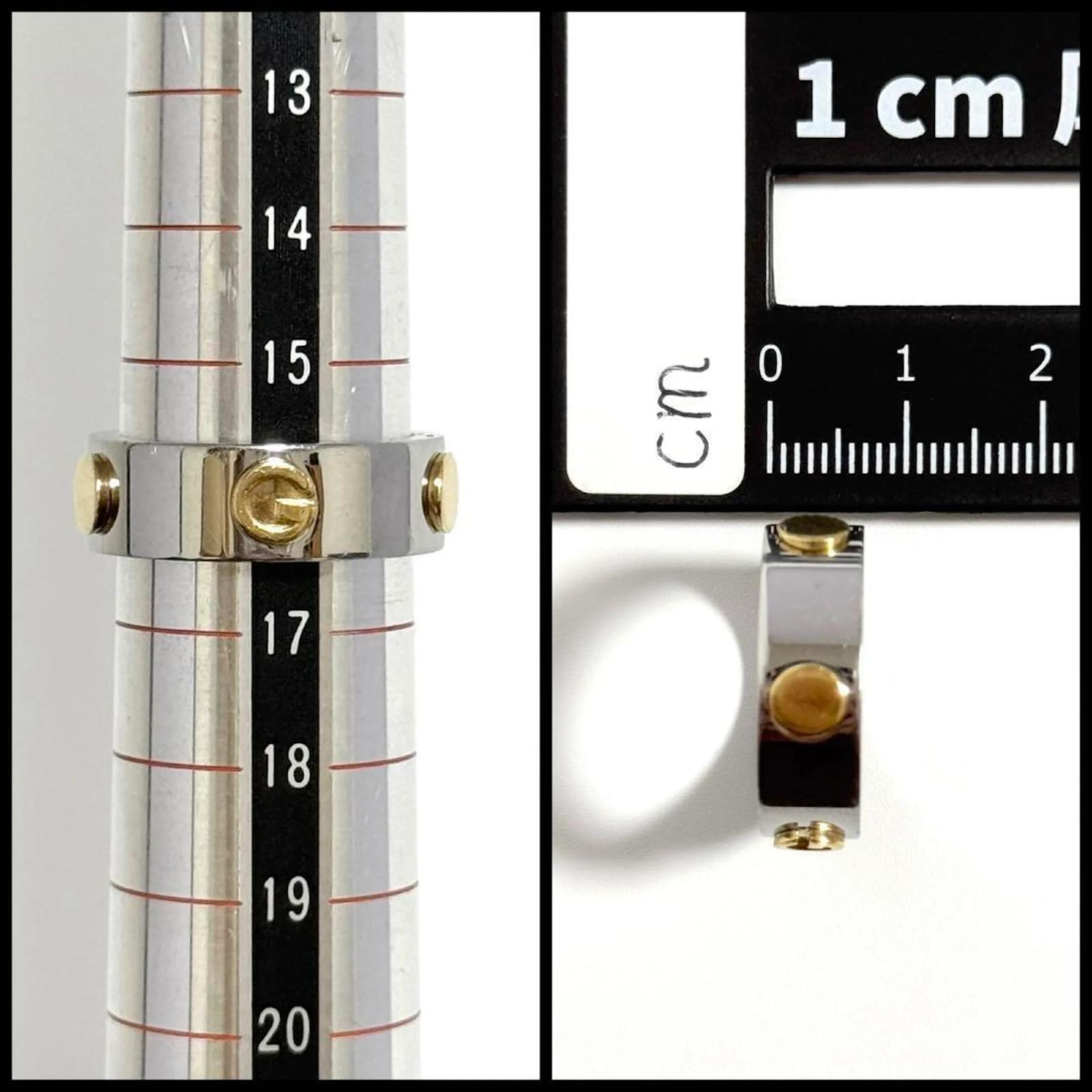 This Gucci men's combination ring features a design that blends stainless steel and gold, creating a sophisticated look. It is available in a Japanese size 16, which corresponds to a US size 8. The ring is classified as used but is in very good condition, with only slight traces of use, including minor scratches and dirt. It is important to review the provided images for a clear understanding of the item's condition. No additional accessories are included with the purchase.