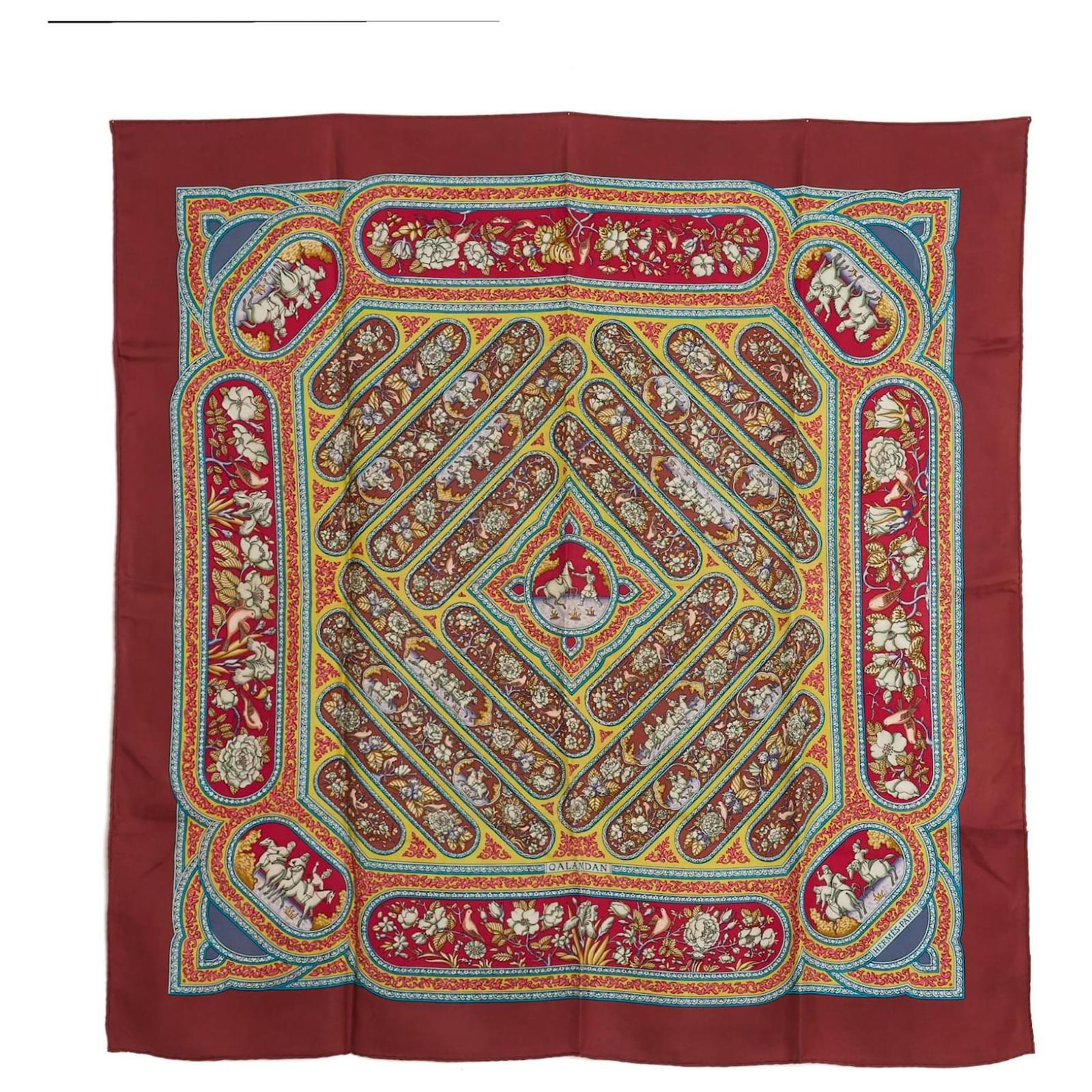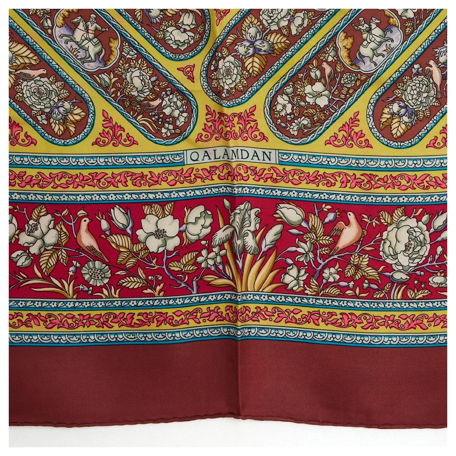 Hermès square scarf 90 in silk twill, Qalamdan pattern by Catherine Baschet, published in 1990 and reissued in 2000 (probably like this one), in shades of orange and yellow-green, with burgundy edges and background. Width 90 cm x length 90 cm approximately. The square is vintage and shows some minor signs of use but remains in very good condition, the rolled edges are still well puffed and the burgundy color is still very fashionable.