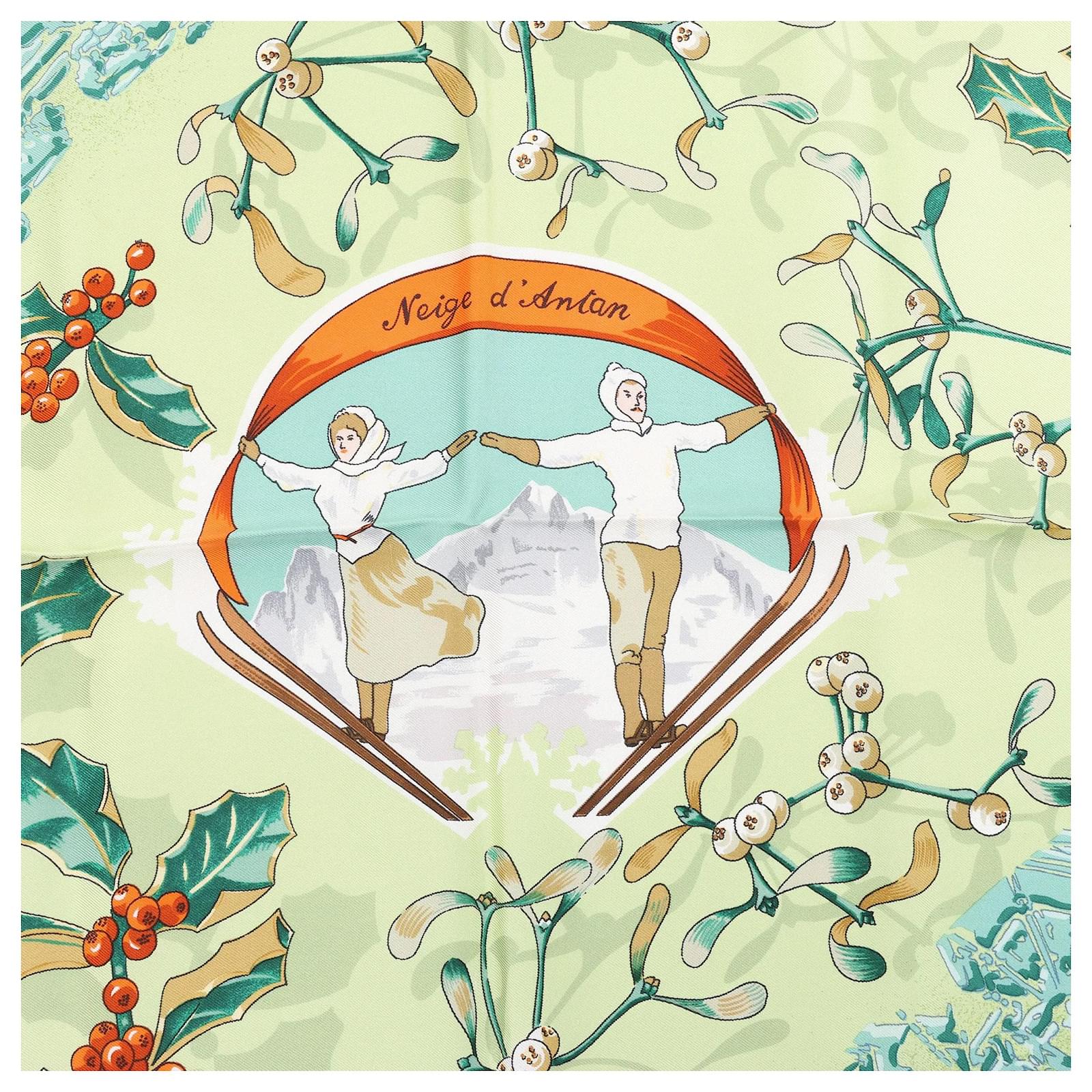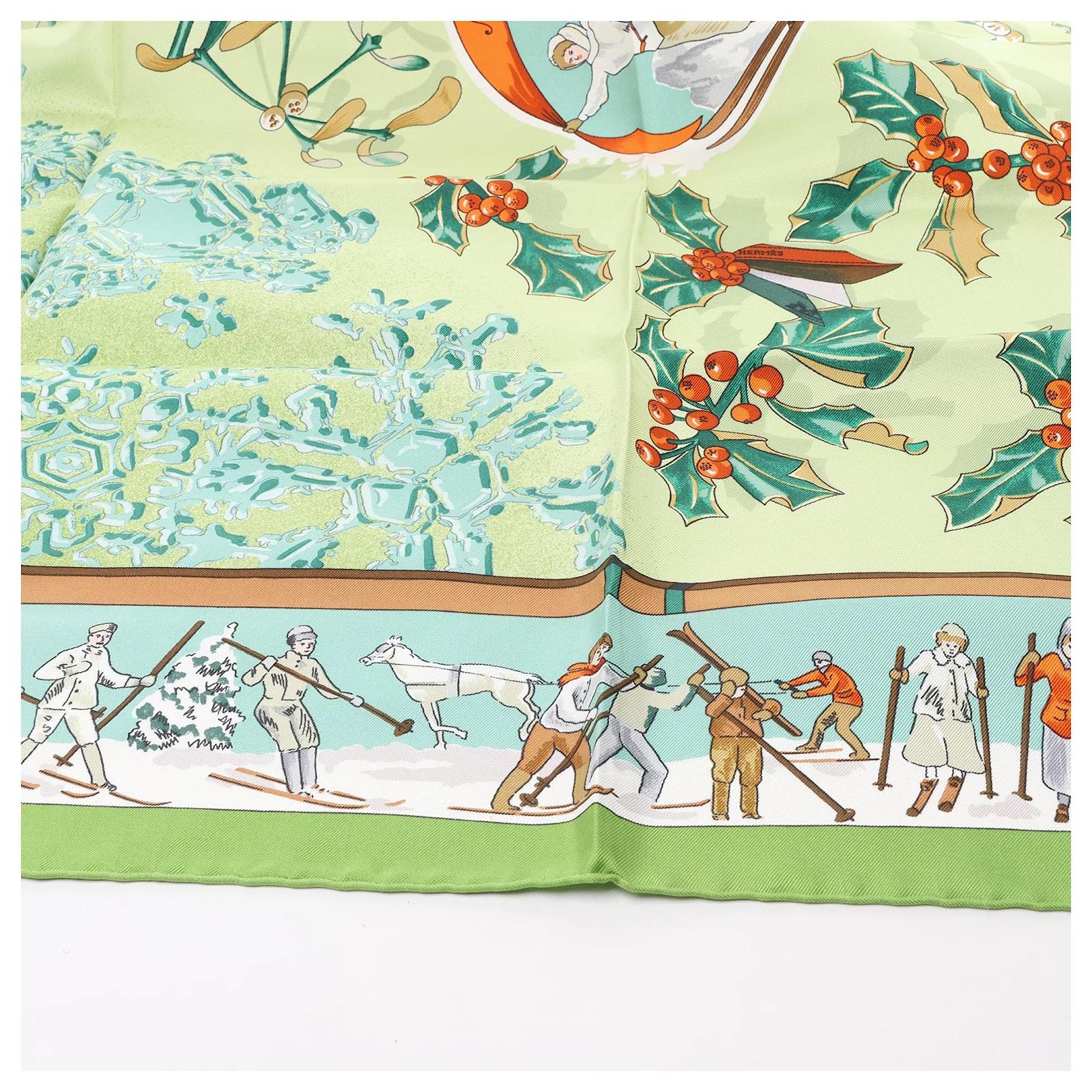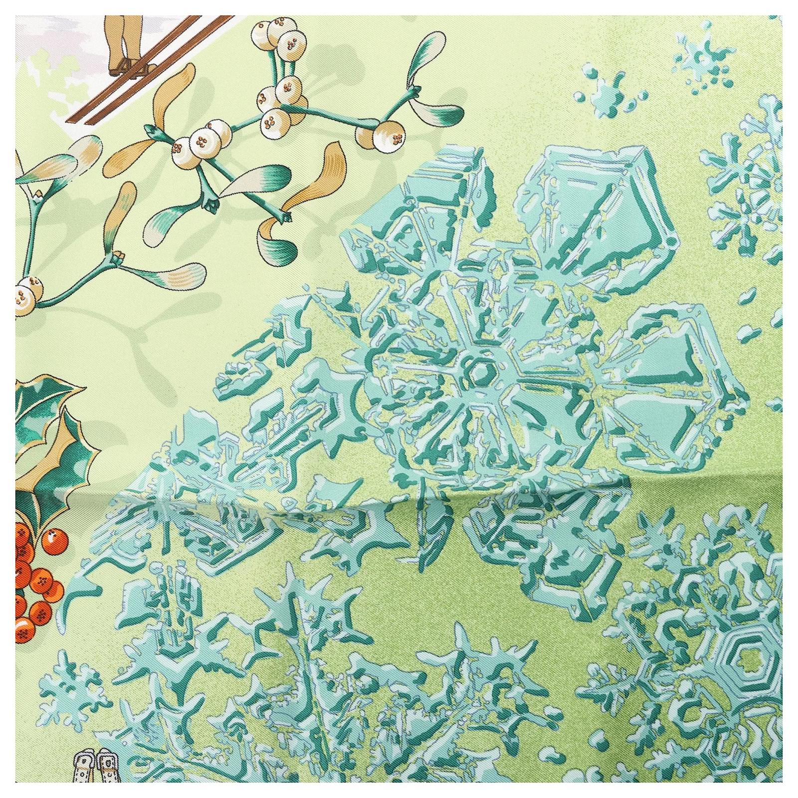 The Hermès Carré 90 "Neige d'Antan" Silk Scarf in Green captures winter’s charm