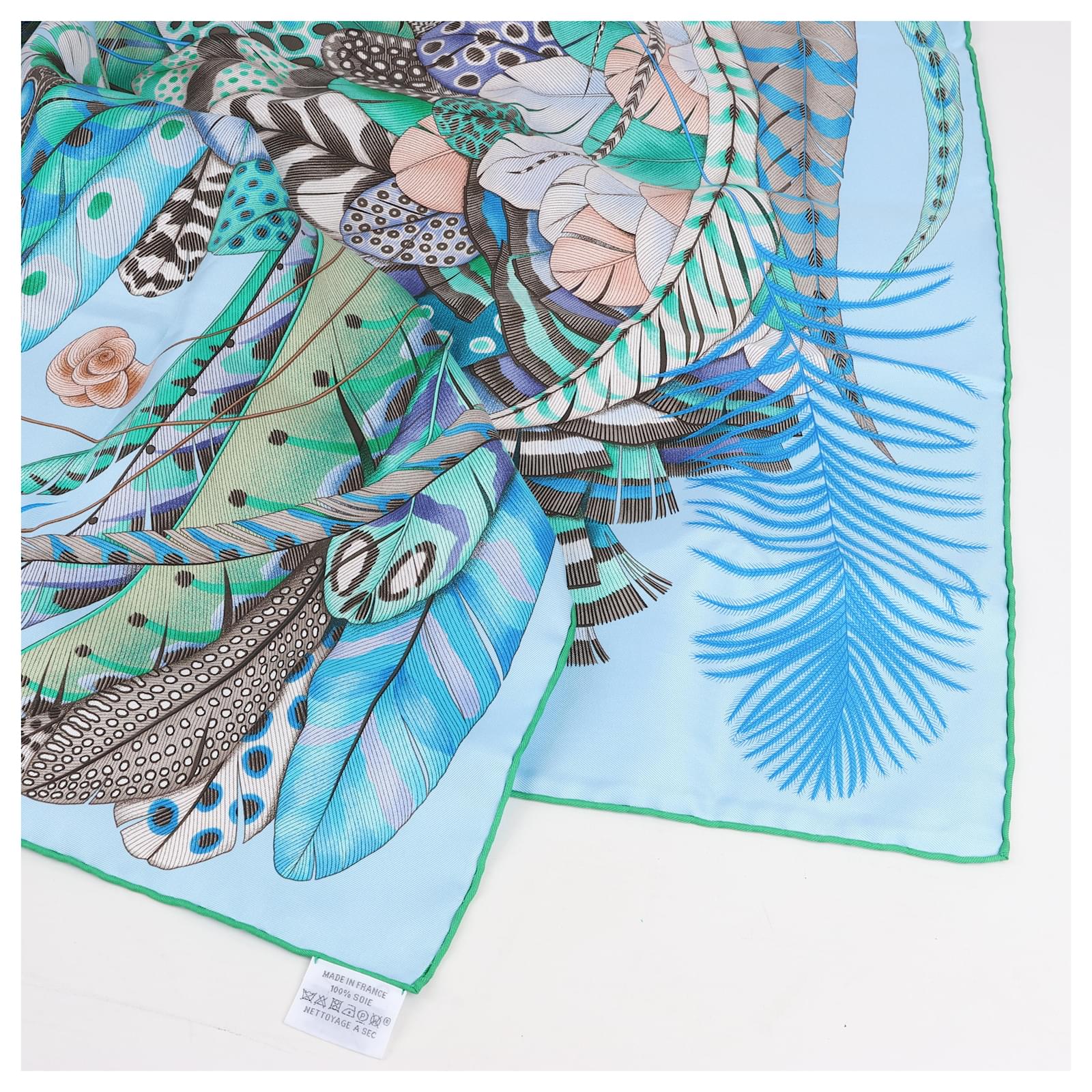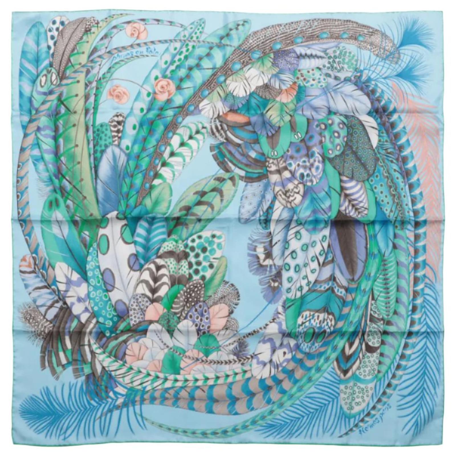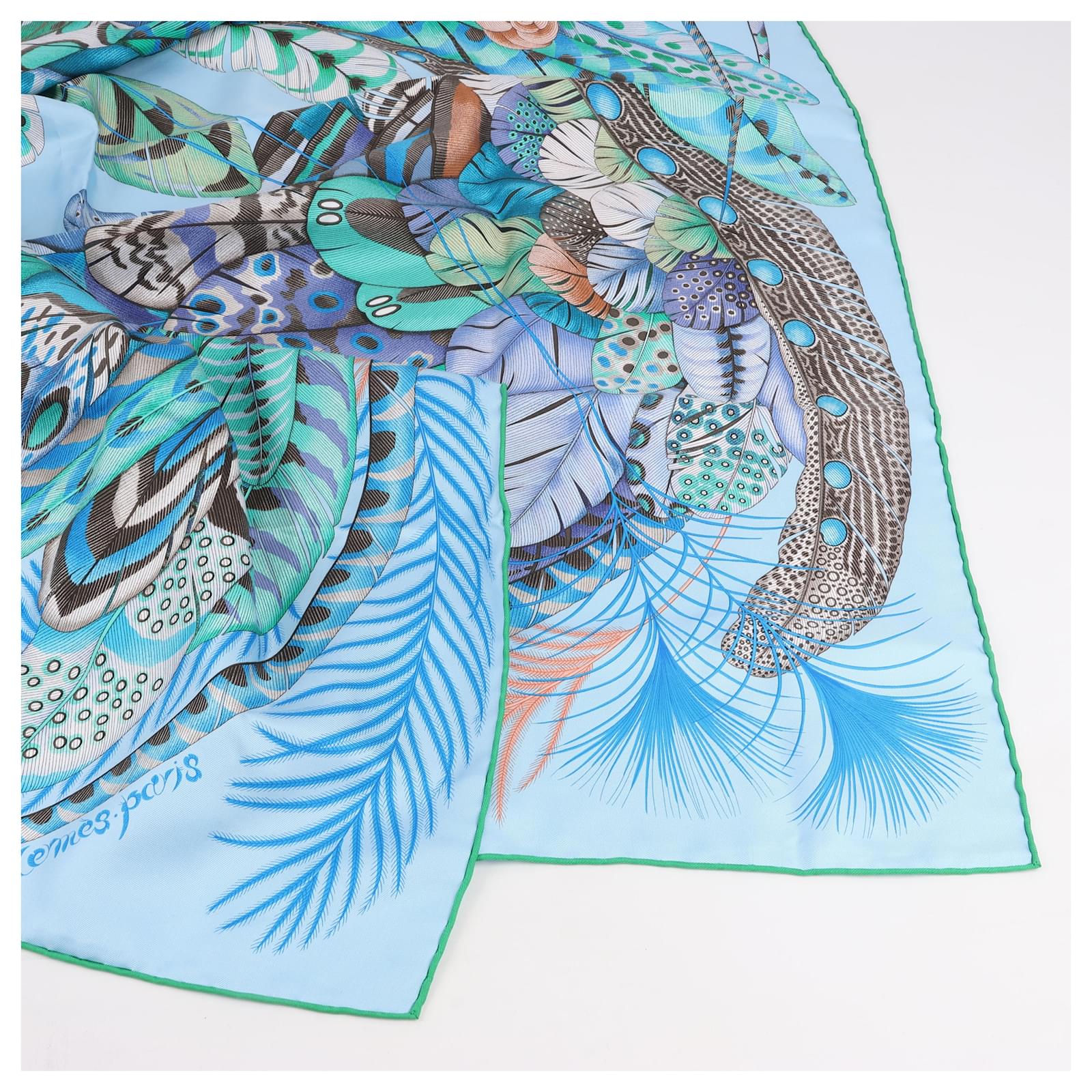 Hermès Carré 90 "PLUMES EN FETE" 100% Silk Scarf in Blue
