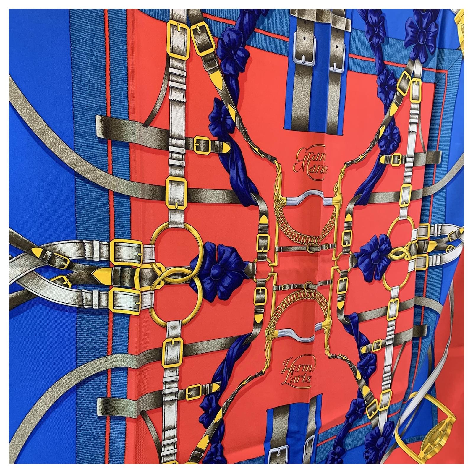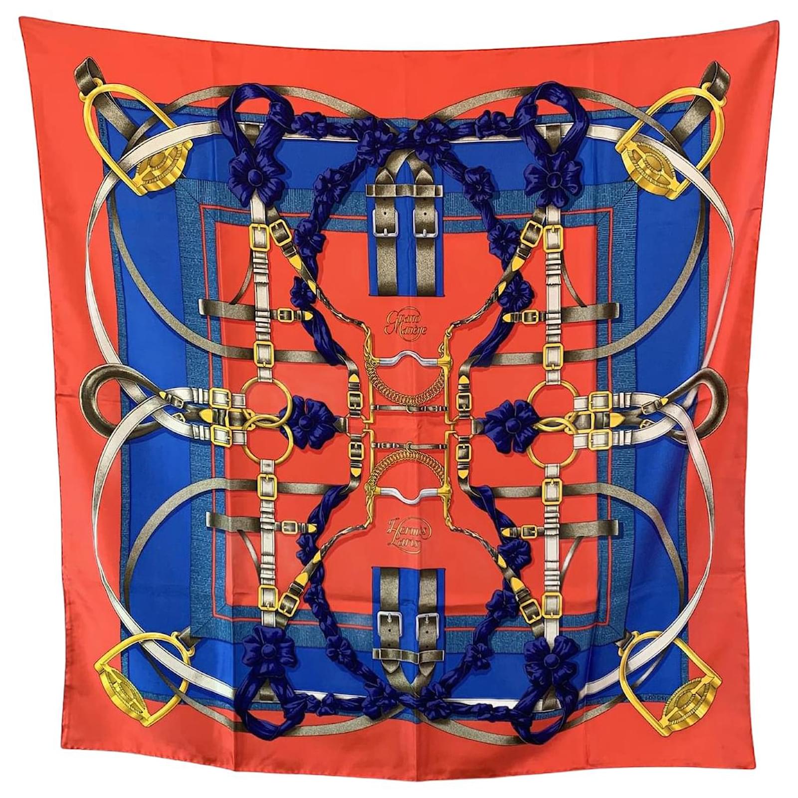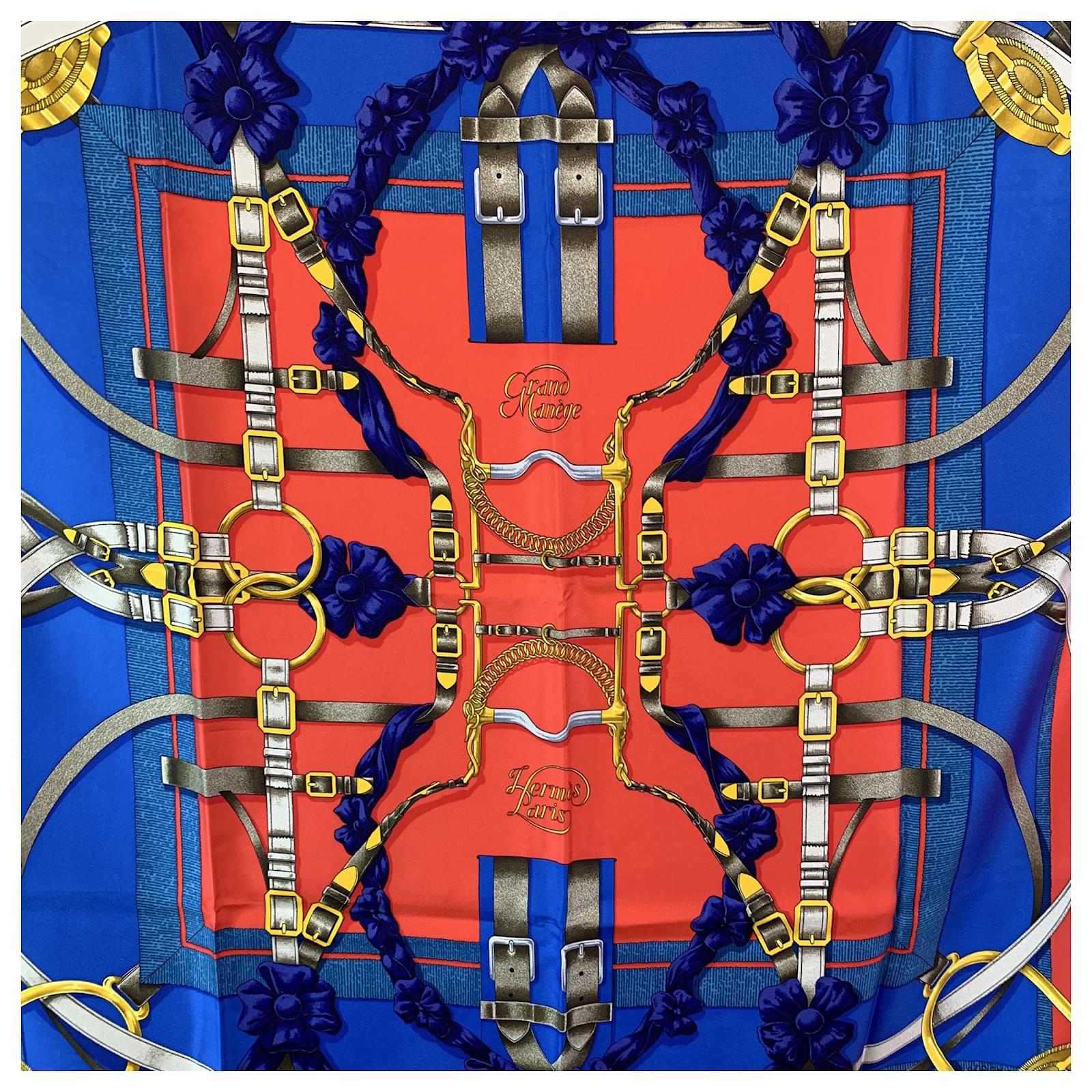 Transport yourself to a world of elegance and movement with the HERMÈS 'Grand Manège' Silk Scarf, a stunning creation by the legendary Henri d'Origny, first issued in 1990. This exquisite scarf captures the beauty of the equestrian world, where knotted fabrics, rosettes on the ears, reins, leather bridles, and stirrups seem to come alive, gracefully reinterpreting the traces left by arabesques in the sand. The delicate motifs and intricate details evoke a sense of fluidity and grace, as if each element is in motion, telling a story of harmony between horse and rider. The scarf features a vibrant mix of blue, yellow, red, and white, with each color chosen to reflect the liveliness of the scene. The hand-rolled hem adds a touch of craftsmanship that Hermès is renowned for, and the design is completed with the iconic 'Hermès Paris' logo and copyright symbol printed in the first upper quadrant, ensuring its authenticity. Measuring 35 x 35 inches (88.9 x 88.9 cm), this scarf is the perfect size to wear in a variety of styles, whether around the neck, tied as a headscarf, or draped as an accessory. The 'Grand Manège' is not just a scarf; it's a celebration of the equestrian lifestyle, timelessly captured in silk, and an elegant addition to any collection. Condition A - EXCELLENT Gently used. Hermes composition tag is still attached. Please check the photos carefully and ask if you need to know more details or if you have any doubts. Details MATERIAL: Silk COLOR: Red MODEL: Carre 90 GENDER: Women COUNTRY OF MANUFACTURE: France FEATURES: Multifunctional PATTERN: Solid YEAR MANUFACTURED: 1990-1999 BOX? No Measurements SCARF HEIGHT: 35 inches - 88.9 cm SCARF WIDTH: 35 inches - 88.9 cm
