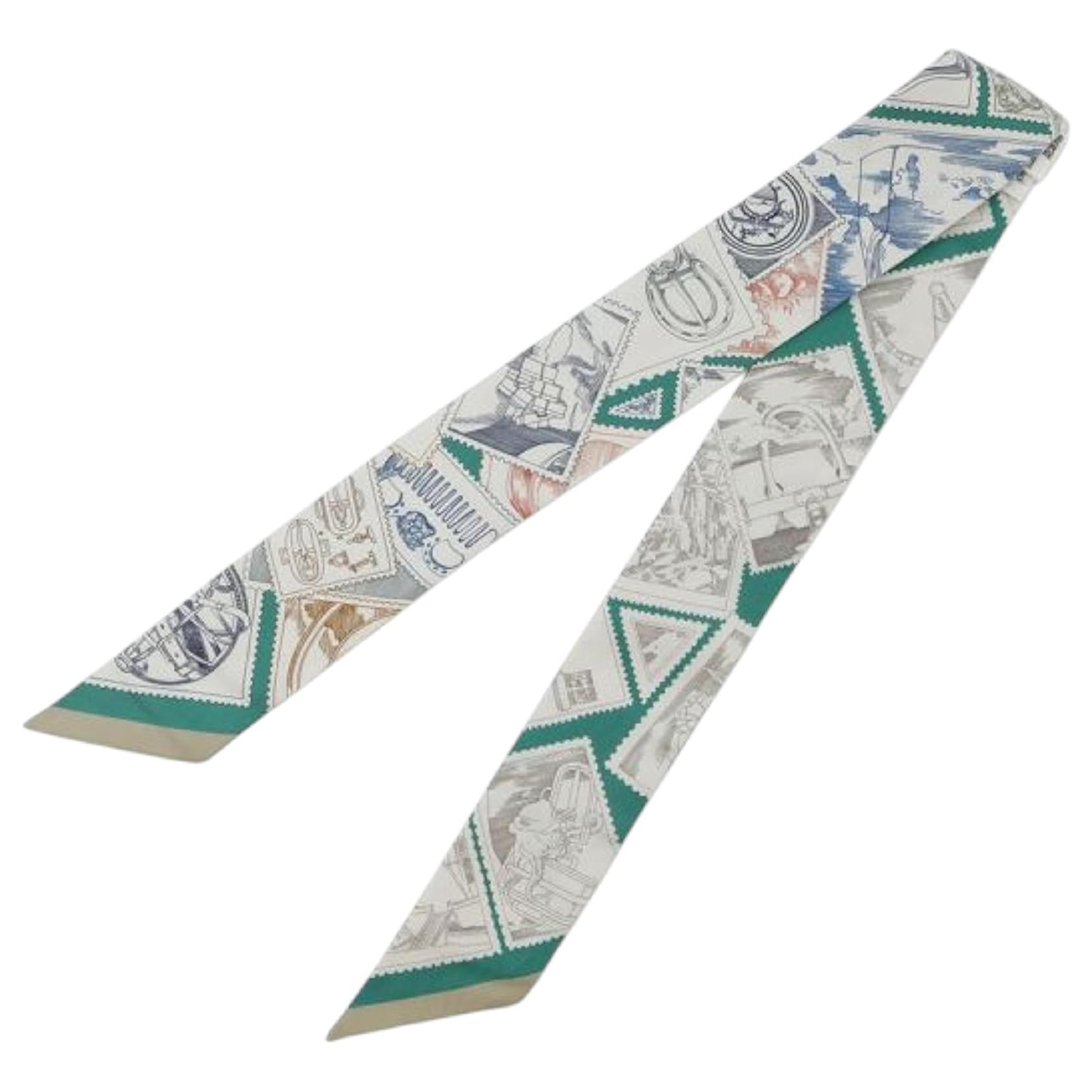 This twilly scarf features the Le Philateliste du Faubourg print on 100% silk. It carries an A condition rating.