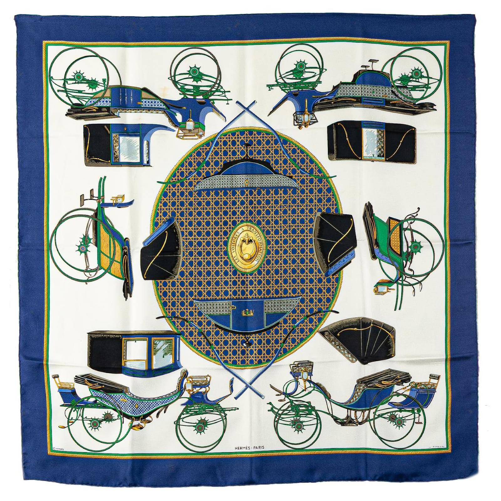 The Les Voitures A Transformation scarf features a print on 100% silk. It carries a B+ condition rating.