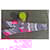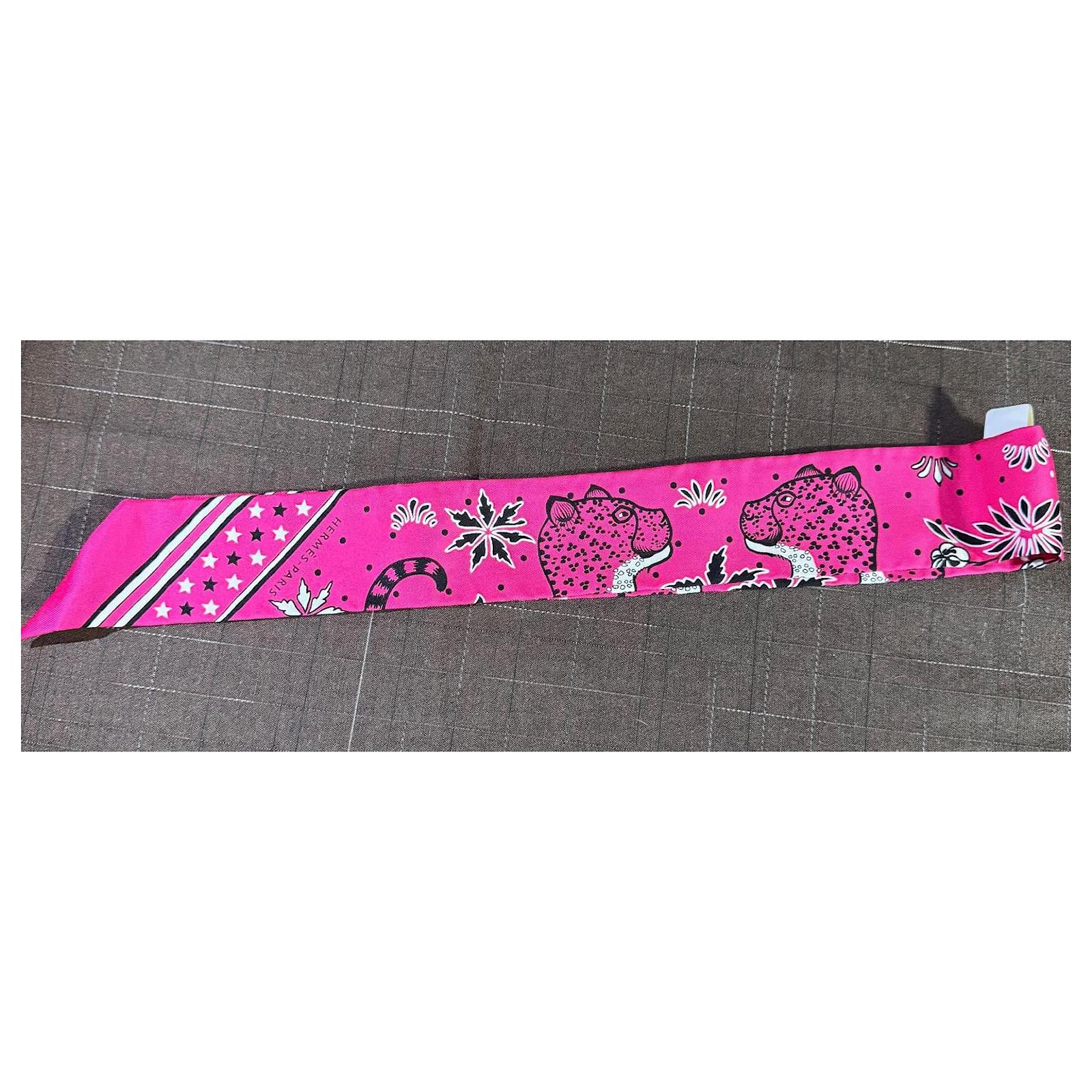 Authentic Hermès Twilly in 100% silk, featuring a bright fuchsia pink pattern with white and black accents.