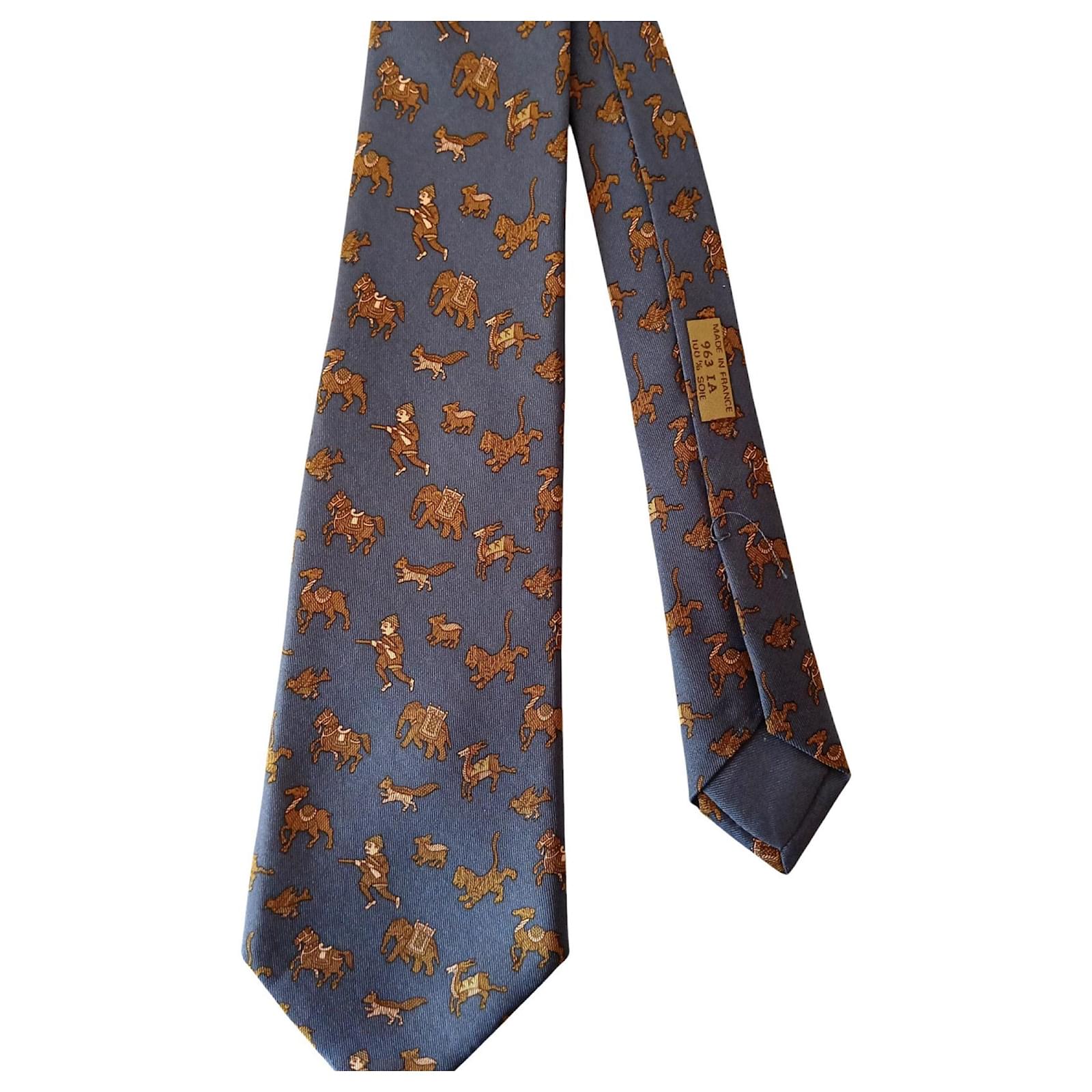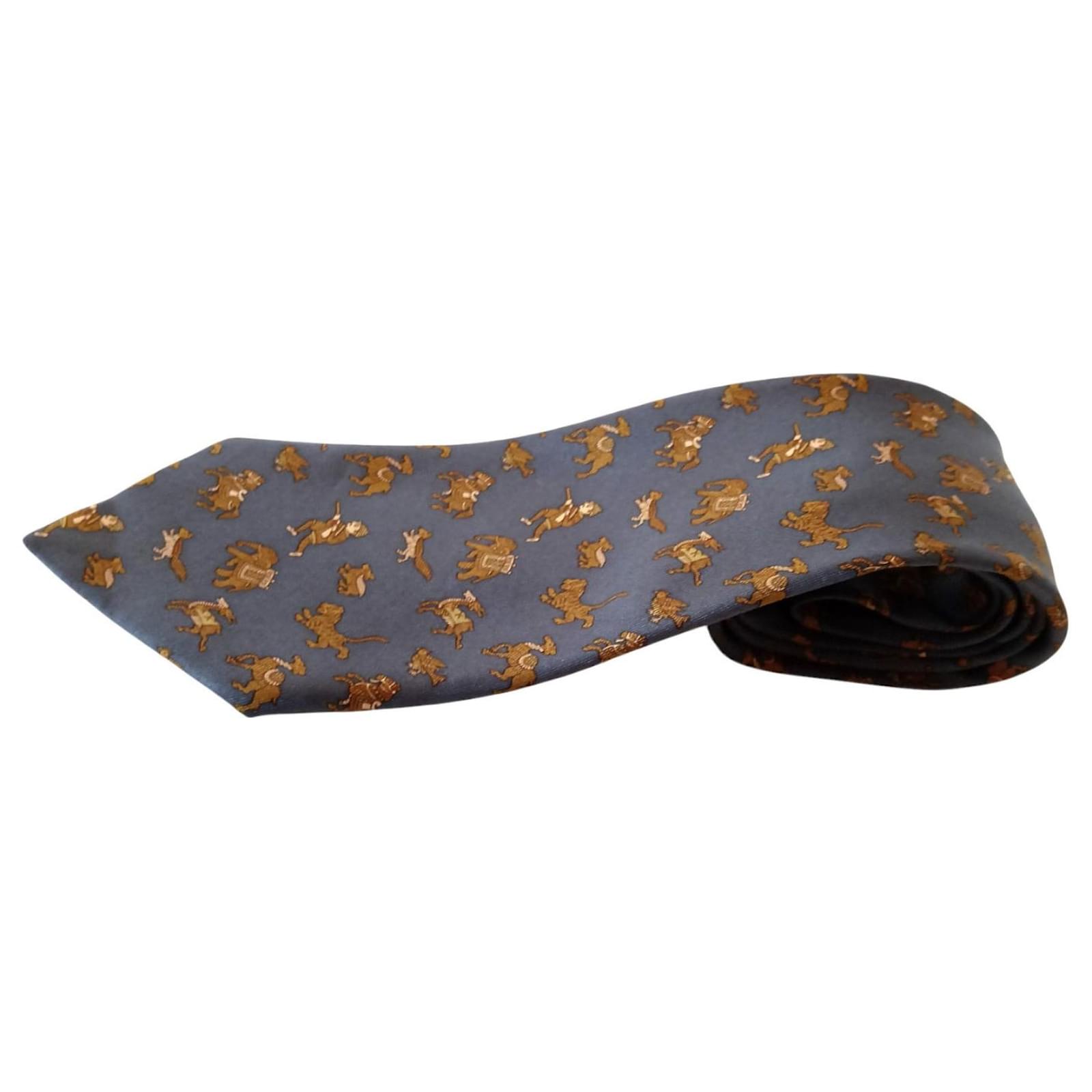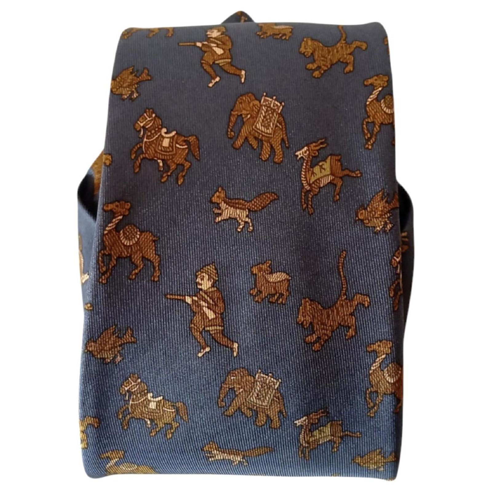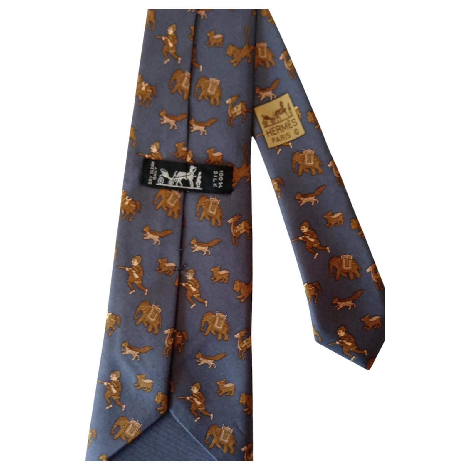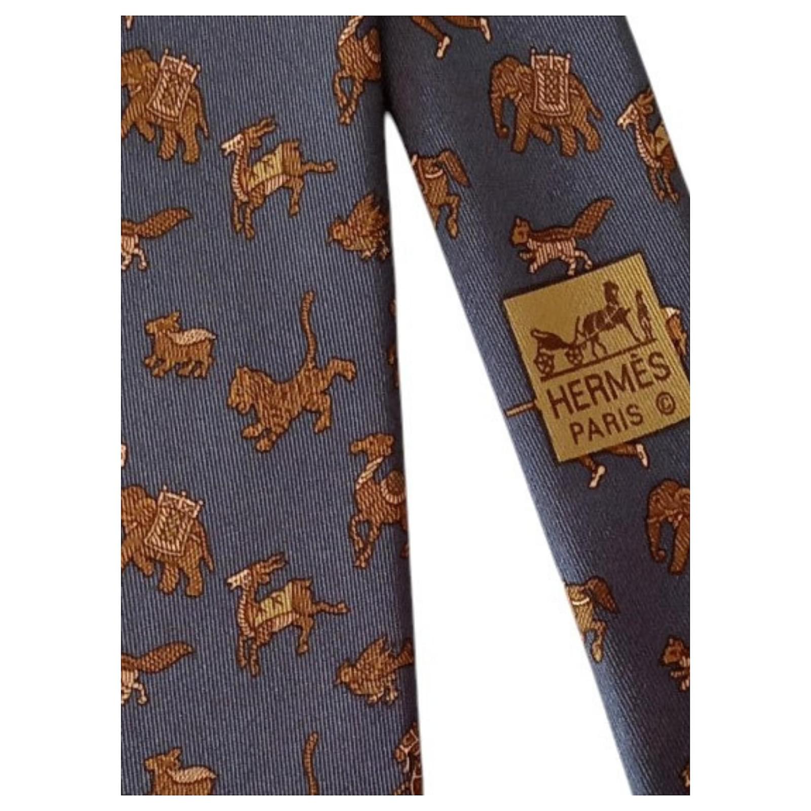 100% silk Hermés tie in gray with bronze elephants and hunters. It measures 9 cm at its widest point and is in very good condition.