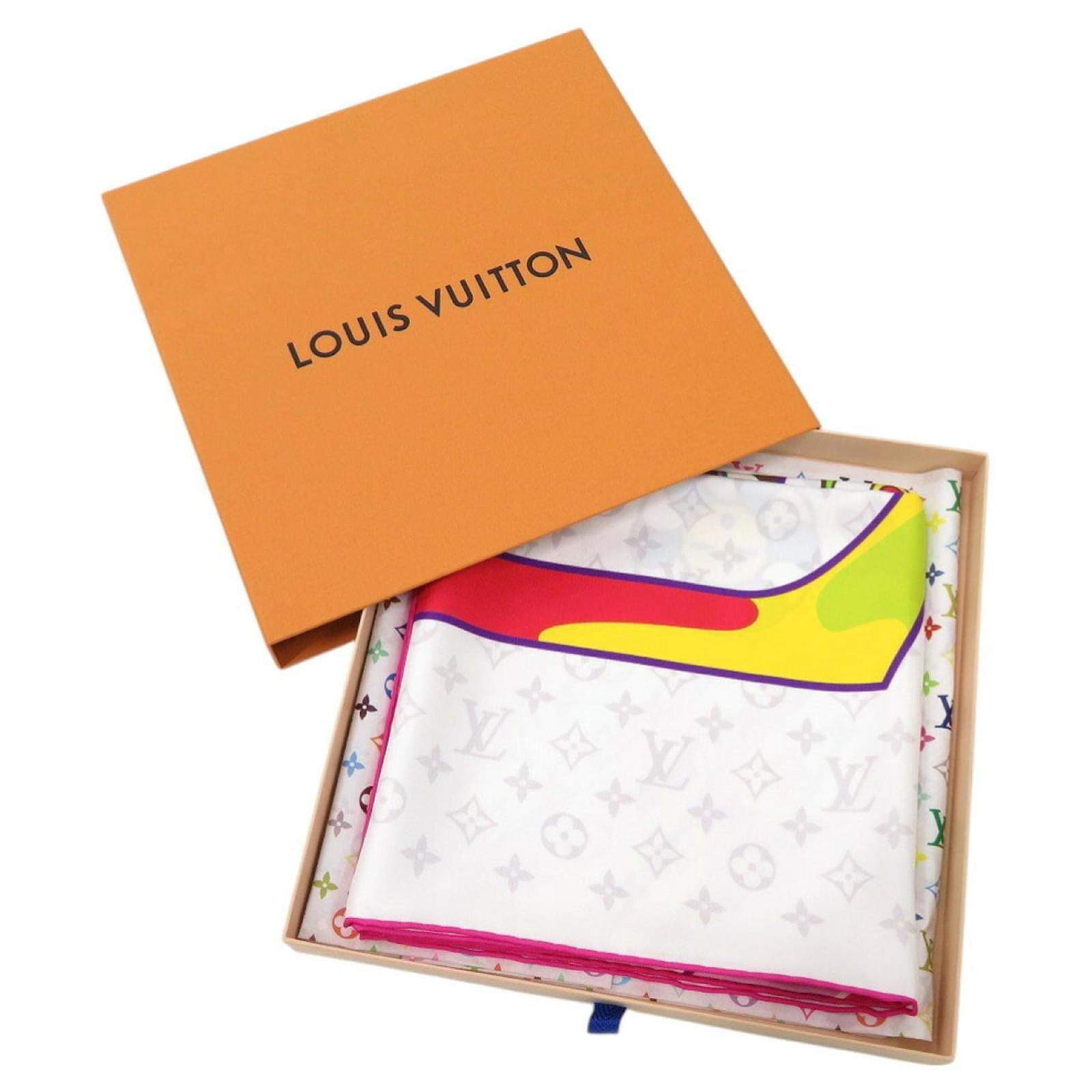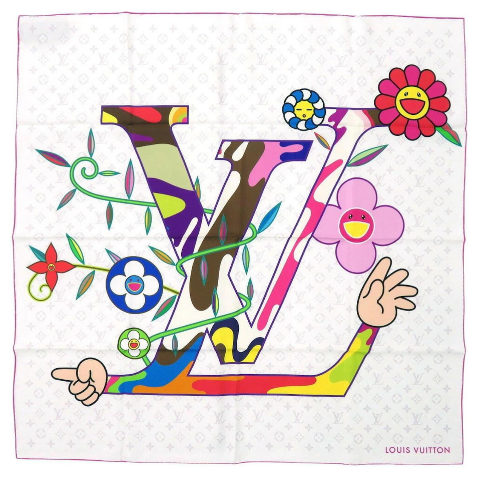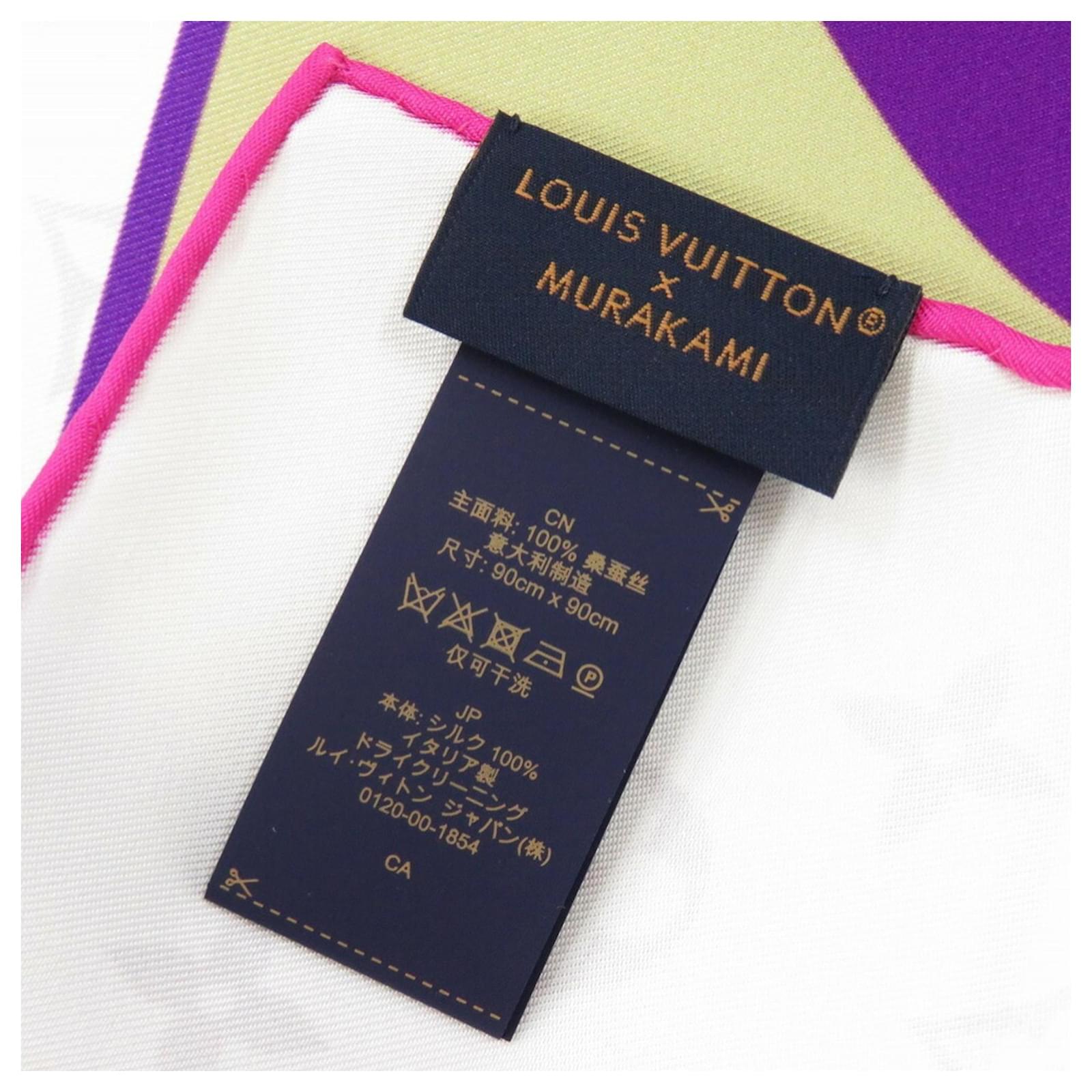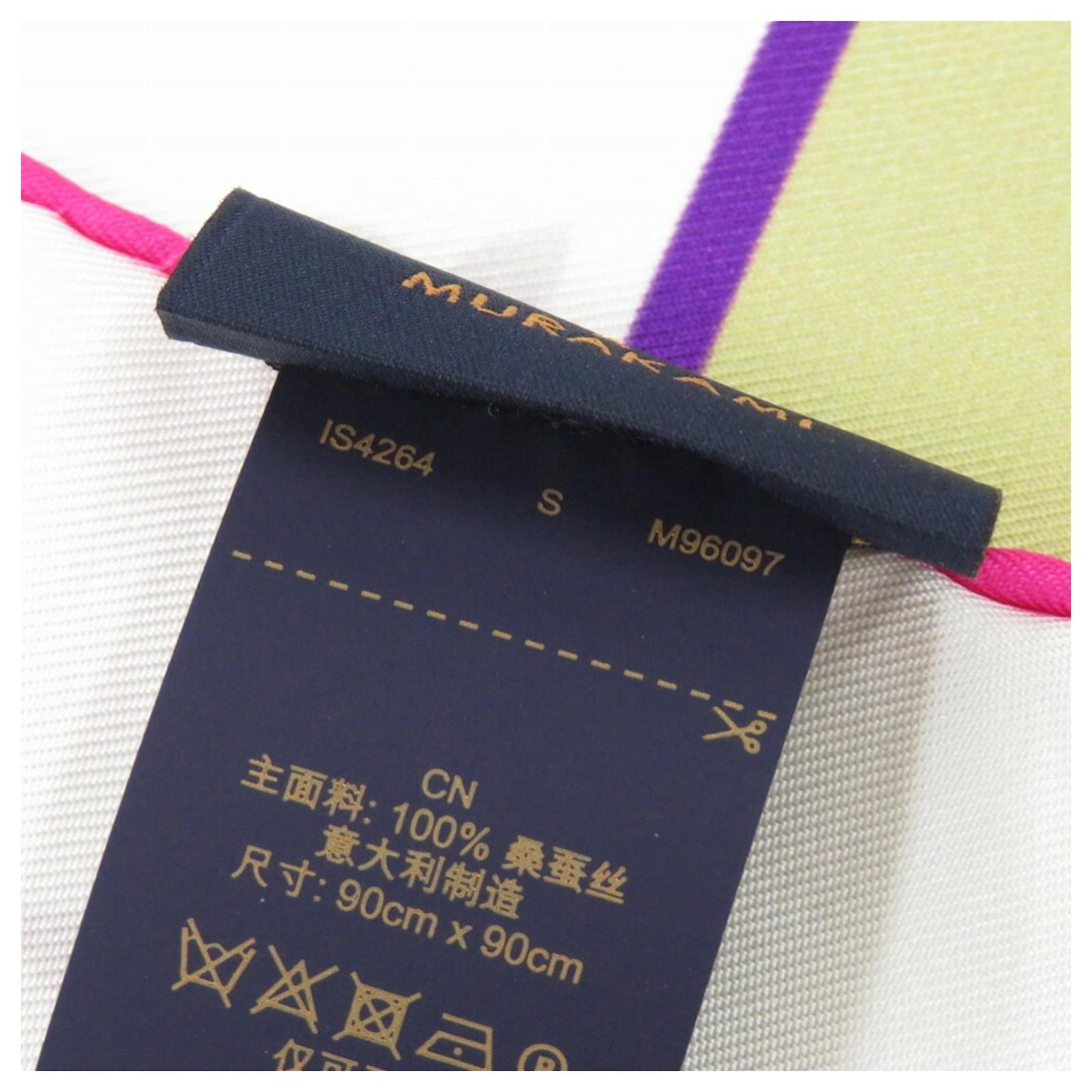This Louis Vuitton LV x TM Carre 90 scarf features a design collaboration with Takashi Murakami, showcasing a blend of brown, pink, and white colors on a silk fabric. Originating from Italy, this item is in used condition but rated as "like new" with insignificant traces of use, scratches, and dirt. The scarf comes with its original box, and potential buyers are encouraged to review the images for a detailed view of the item's condition and included accessories.