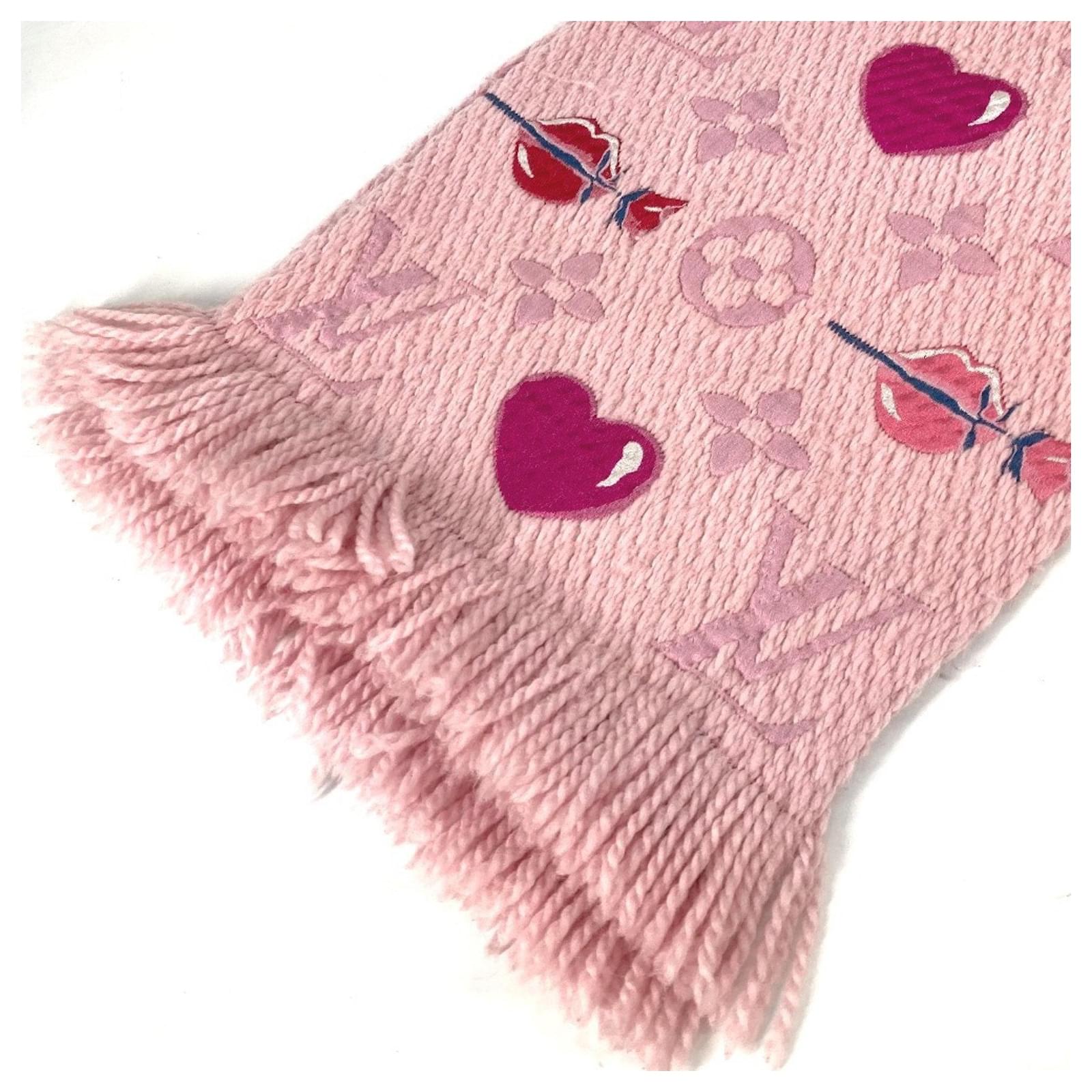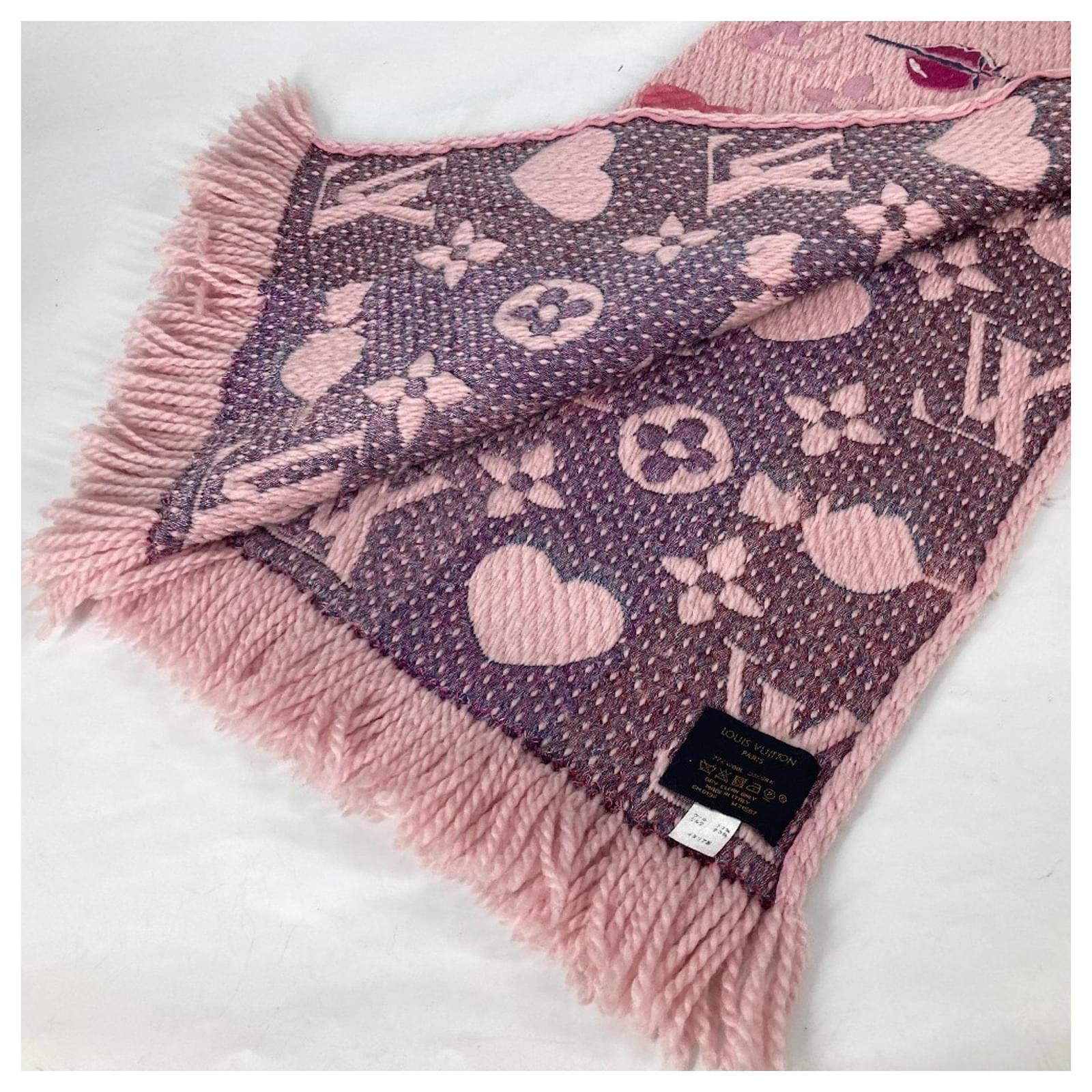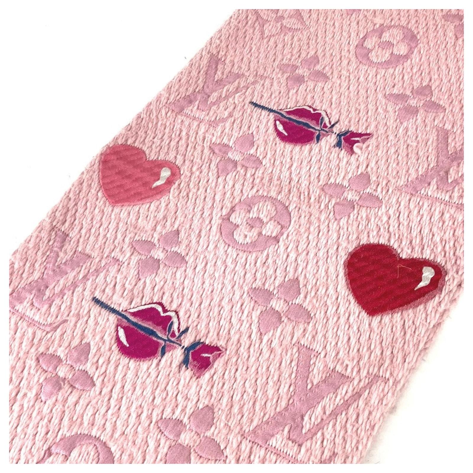 This Louis Vuitton stole, model M71587, features a vibrant pink and red color scheme and is crafted from a blend of wool and silk. Measuring 1.52 meters by 30 centimeters, it is designed for women and showcases a distinctive heart lip fringe detail.
