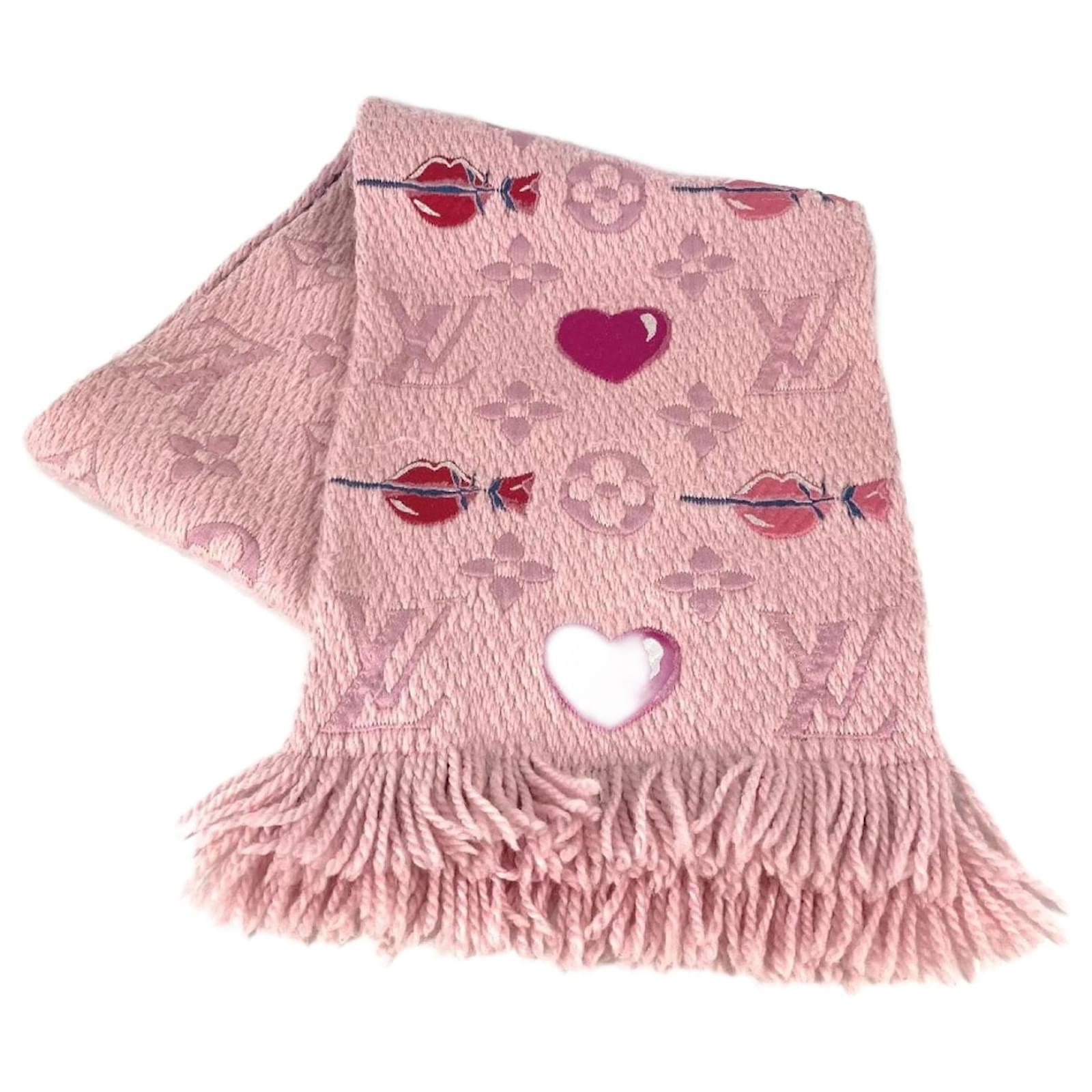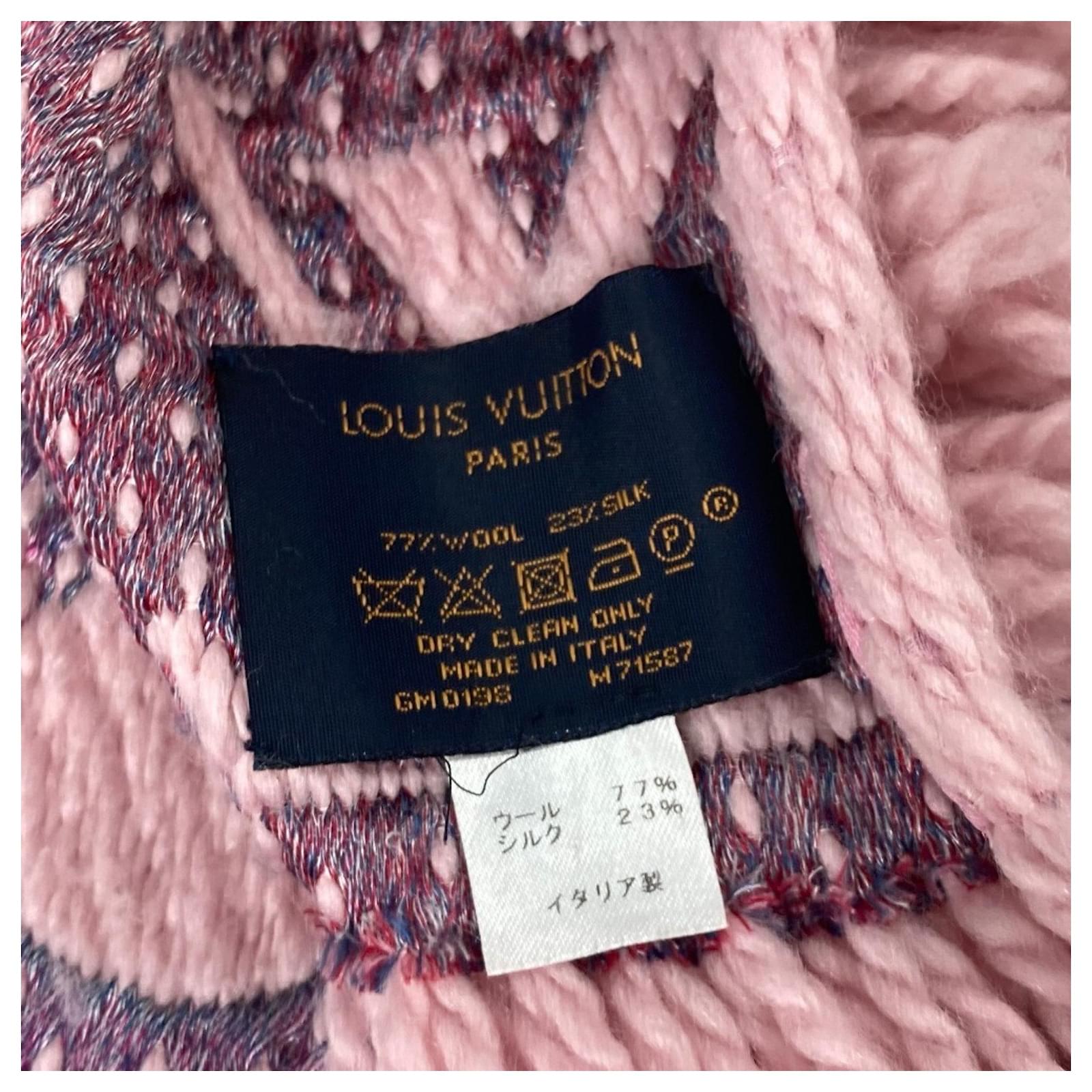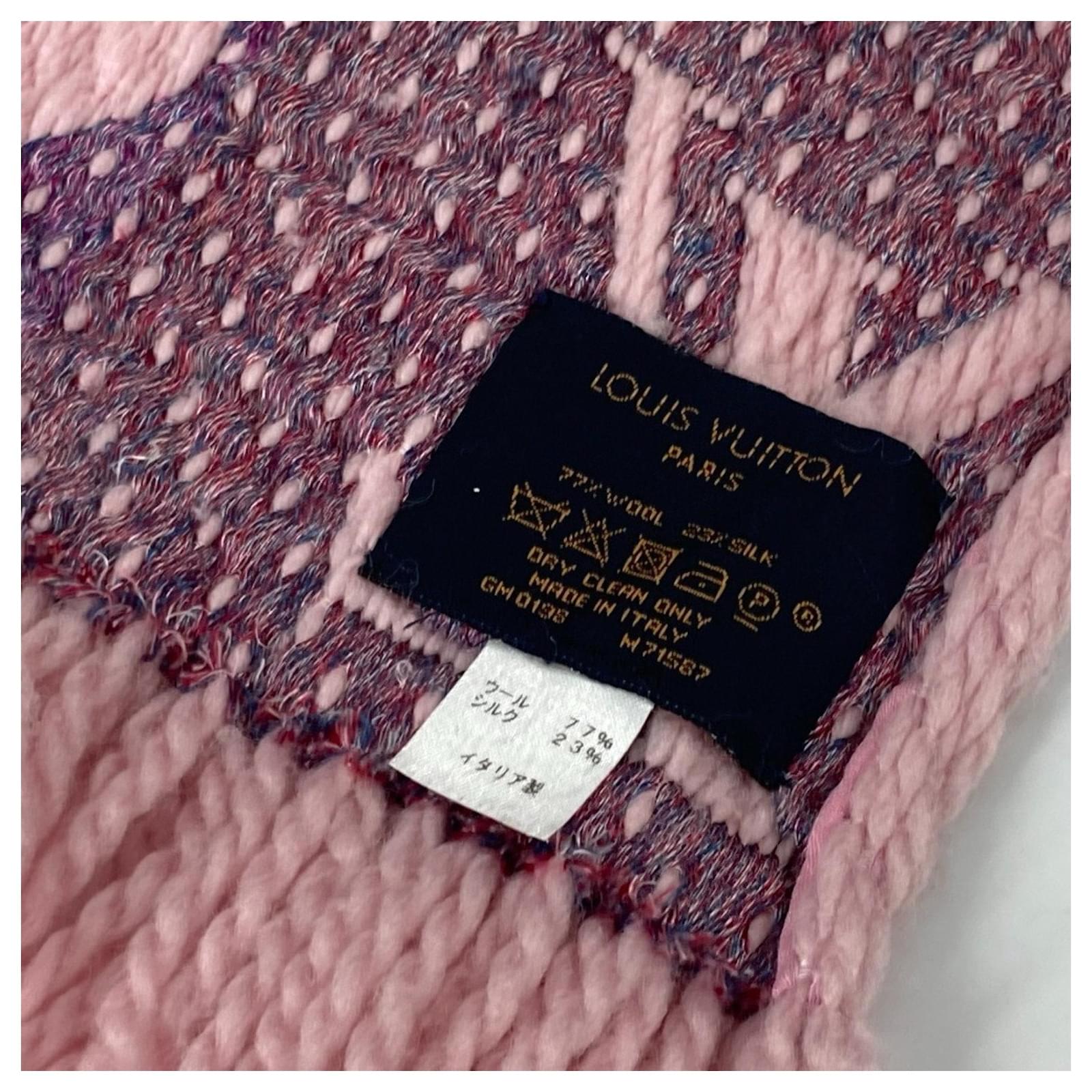 This Louis Vuitton stole, model M71587, features a vibrant pink and red color scheme and is crafted from a blend of wool and silk. Measuring 1.52 meters by 30 centimeters, it is designed for women and showcases a distinctive heart lip fringe detail.