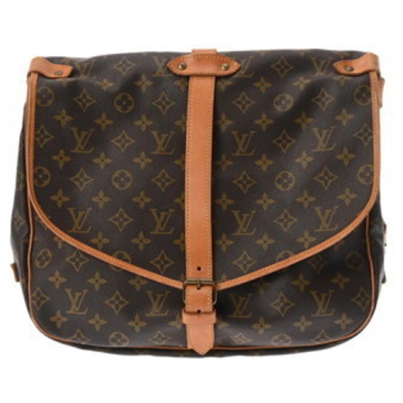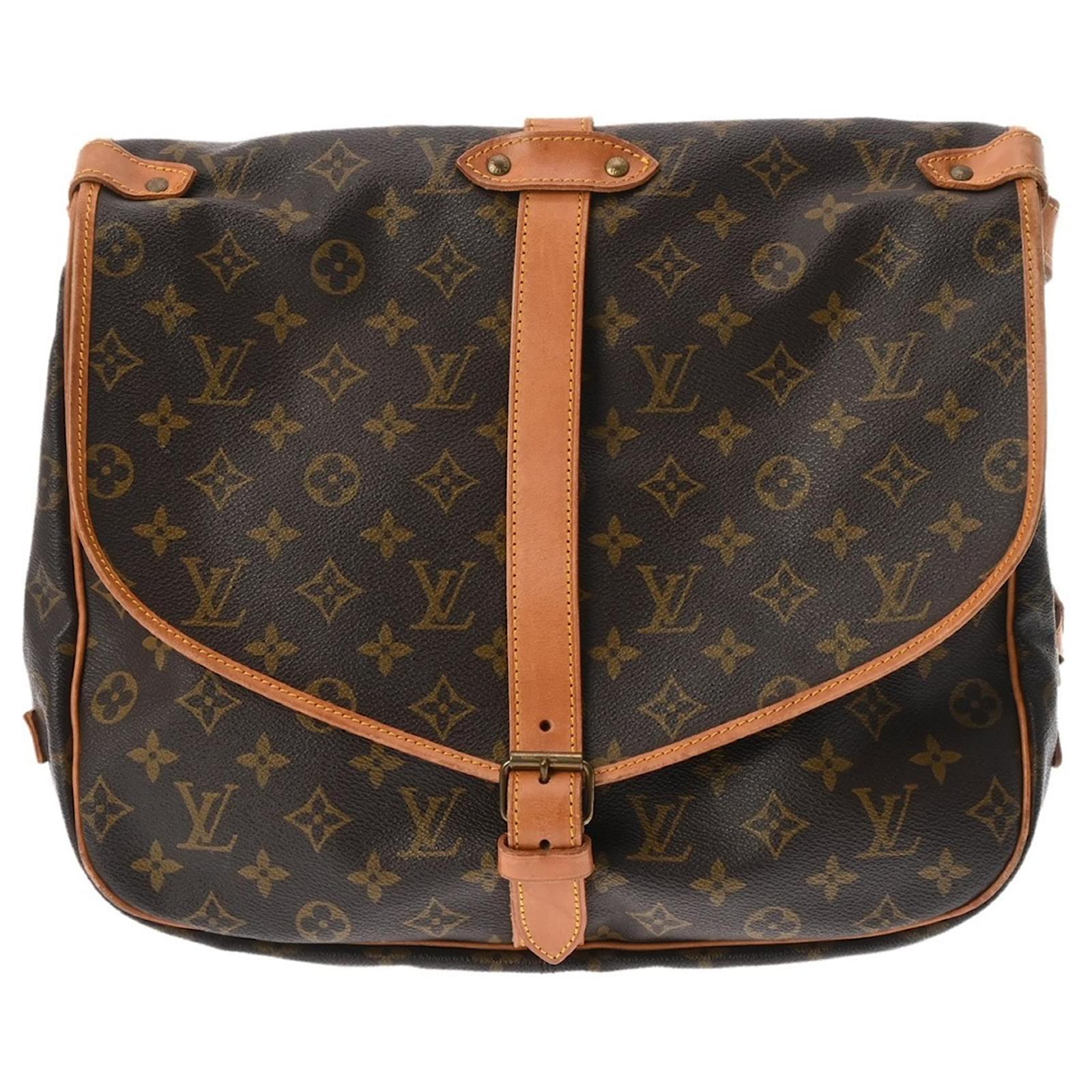 The Louis Vuitton Monogram Saumur 35 is a used women's shoulder bag, crafted from durable monogram canvas in a color palette of blue and brown. Measuring 27 cm in height, 35 cm in width, and 25 cm in depth, this bag features a belt outer pocket for added functionality.