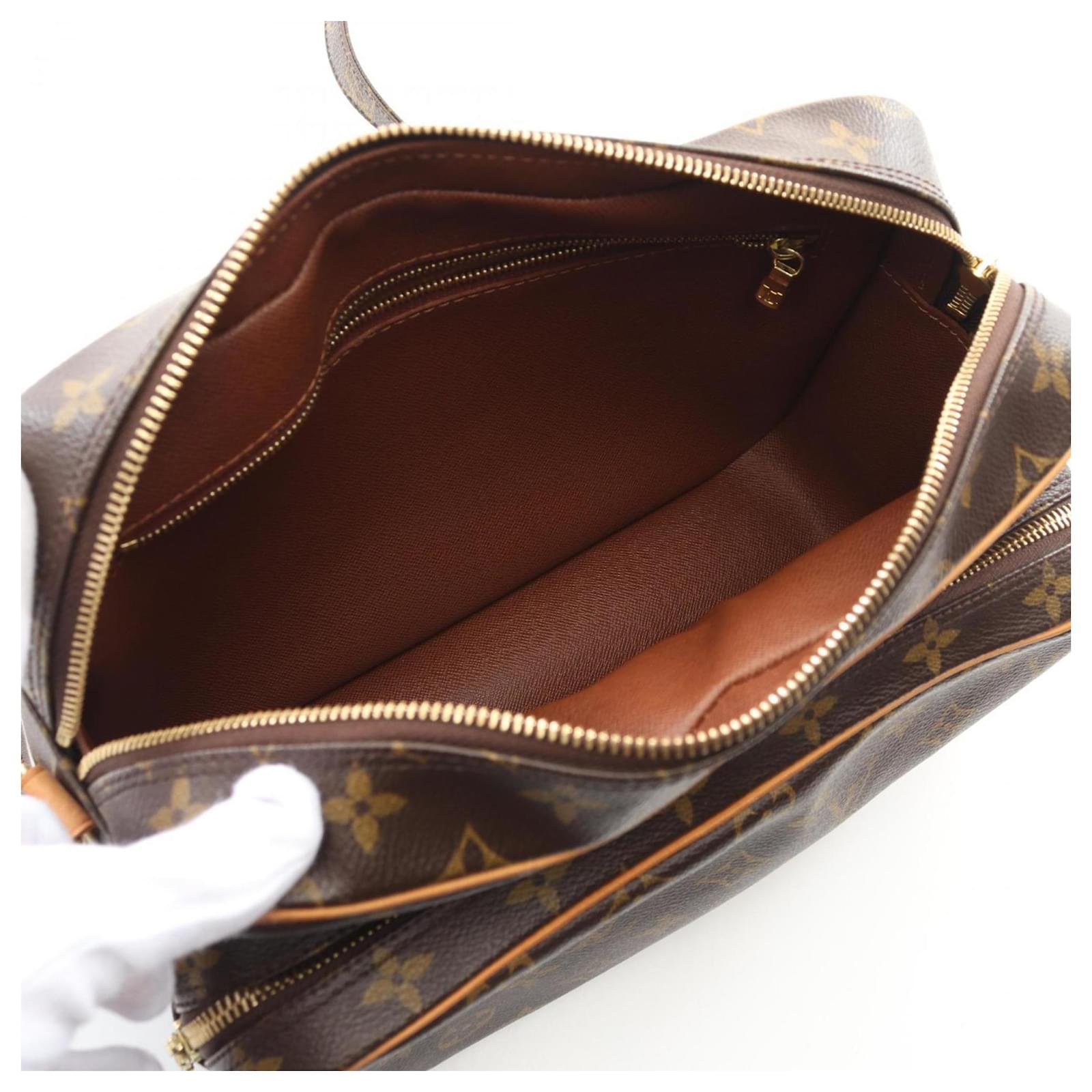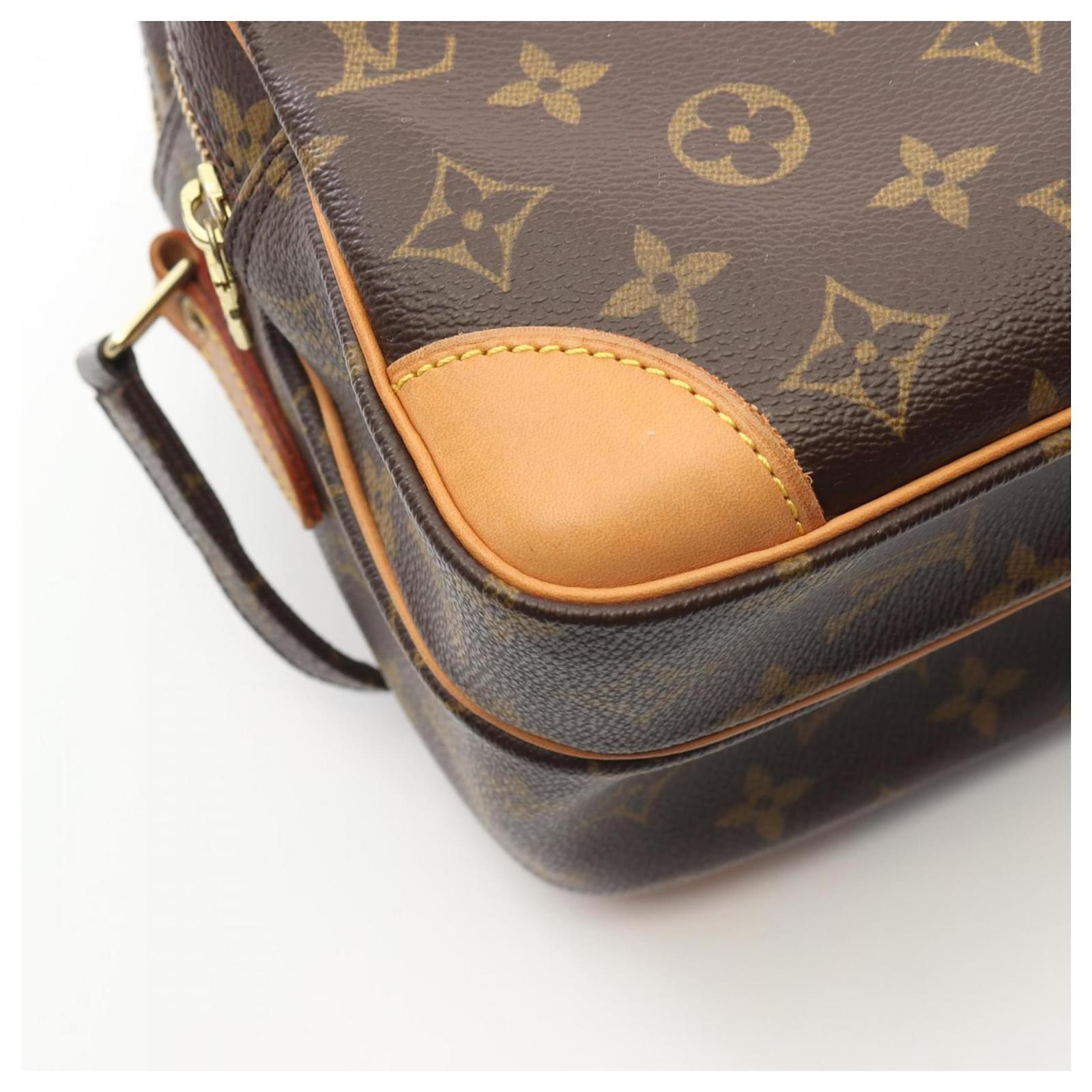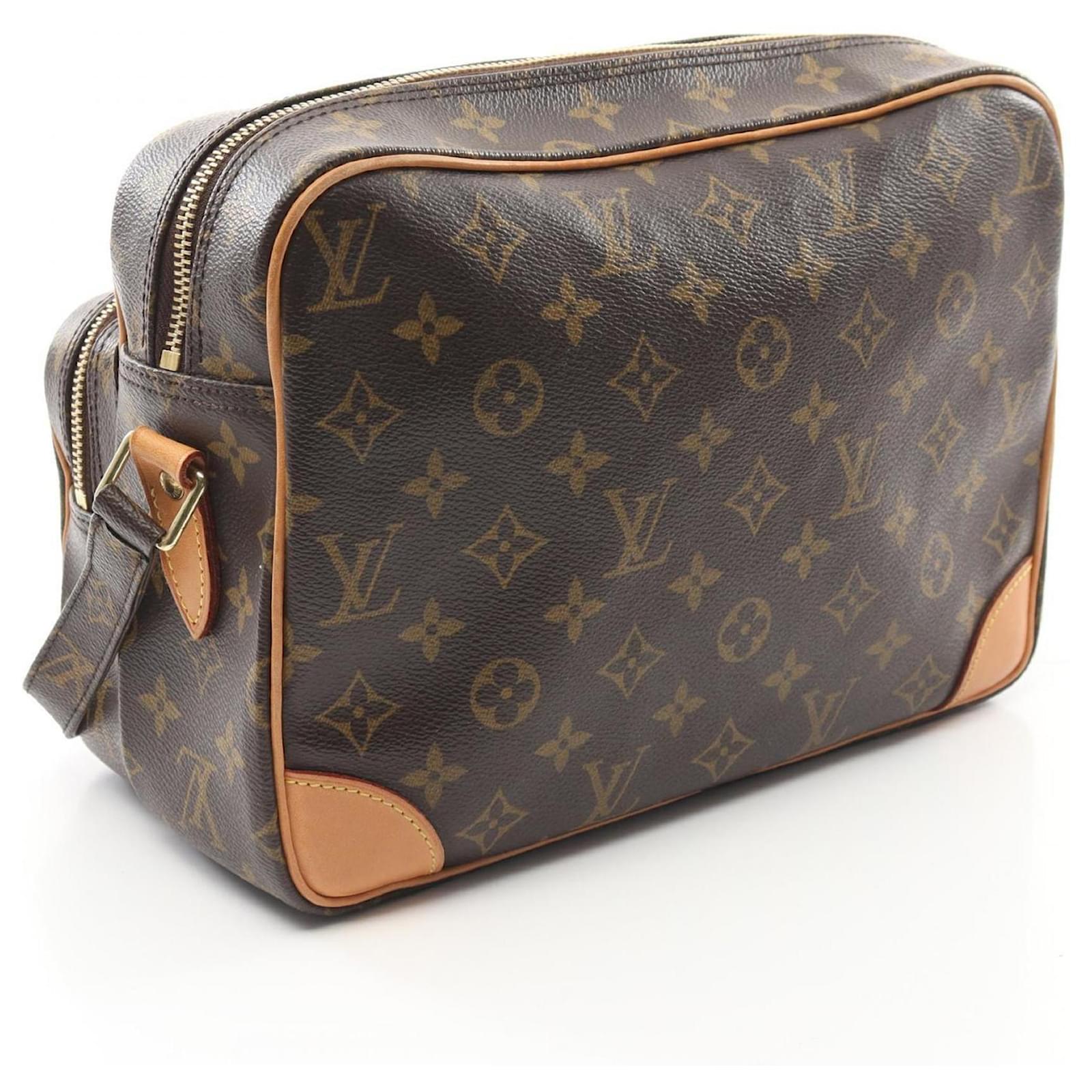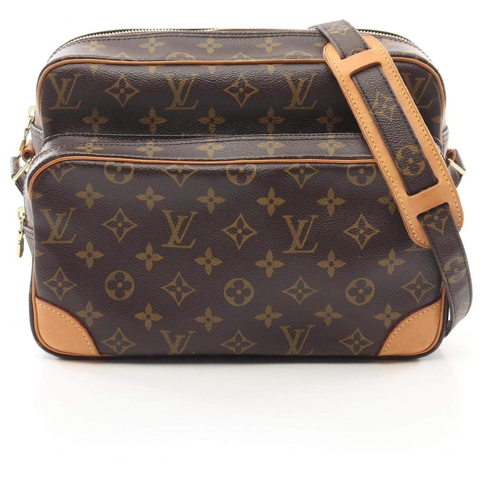 The Louis Vuitton Nile Shoulder Bag is crafted from a combination of coated canvas, PVC, and leather, featuring a classic brown color. With dimensions of 20cm x 28cm (7.87'' x 11.02''), this bag is designed for practicality and style.