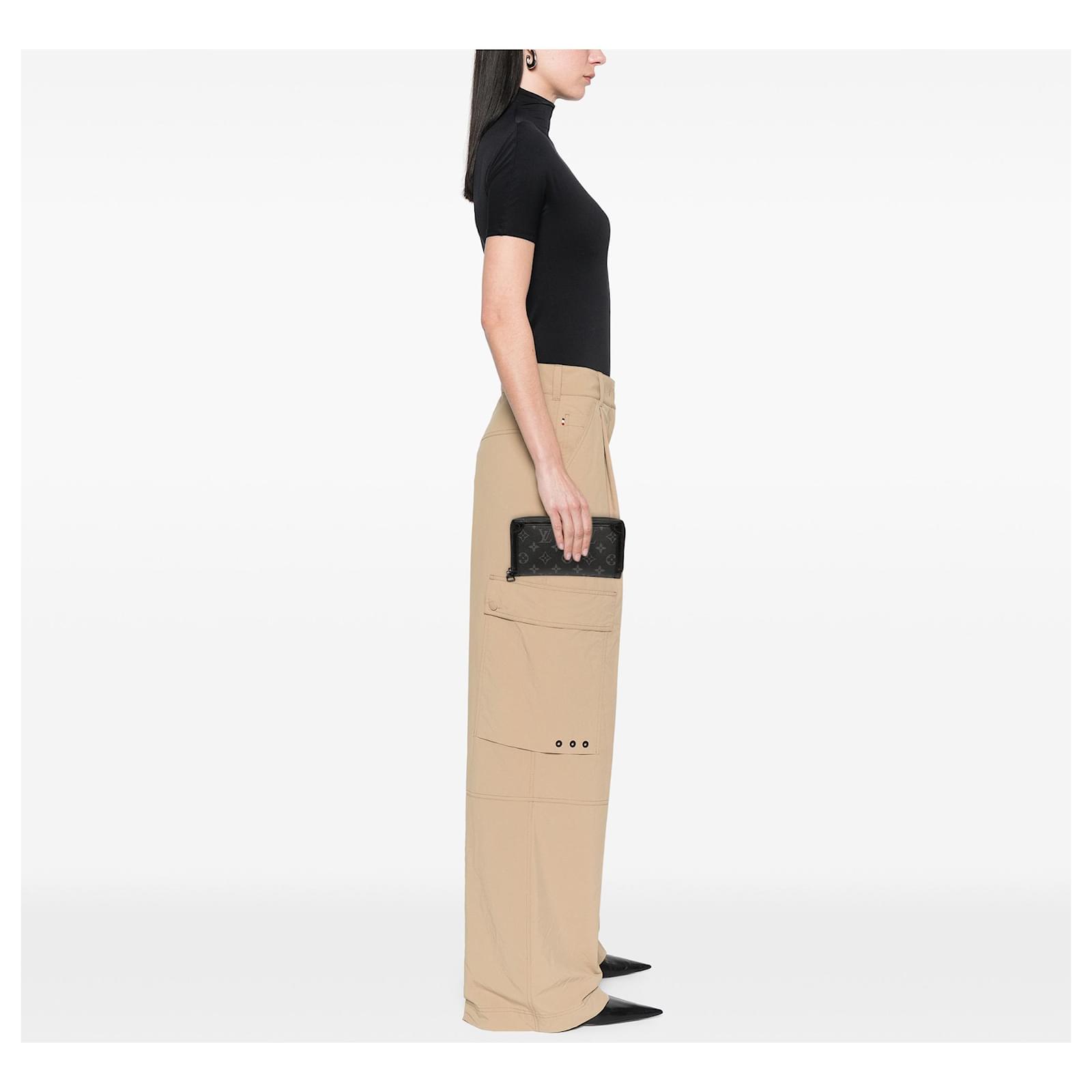This long wallet features a monogram eclipse canvas body with leather trim, a zip around closure, and interior zip and slip pockets. It carries a B+ condition rating.