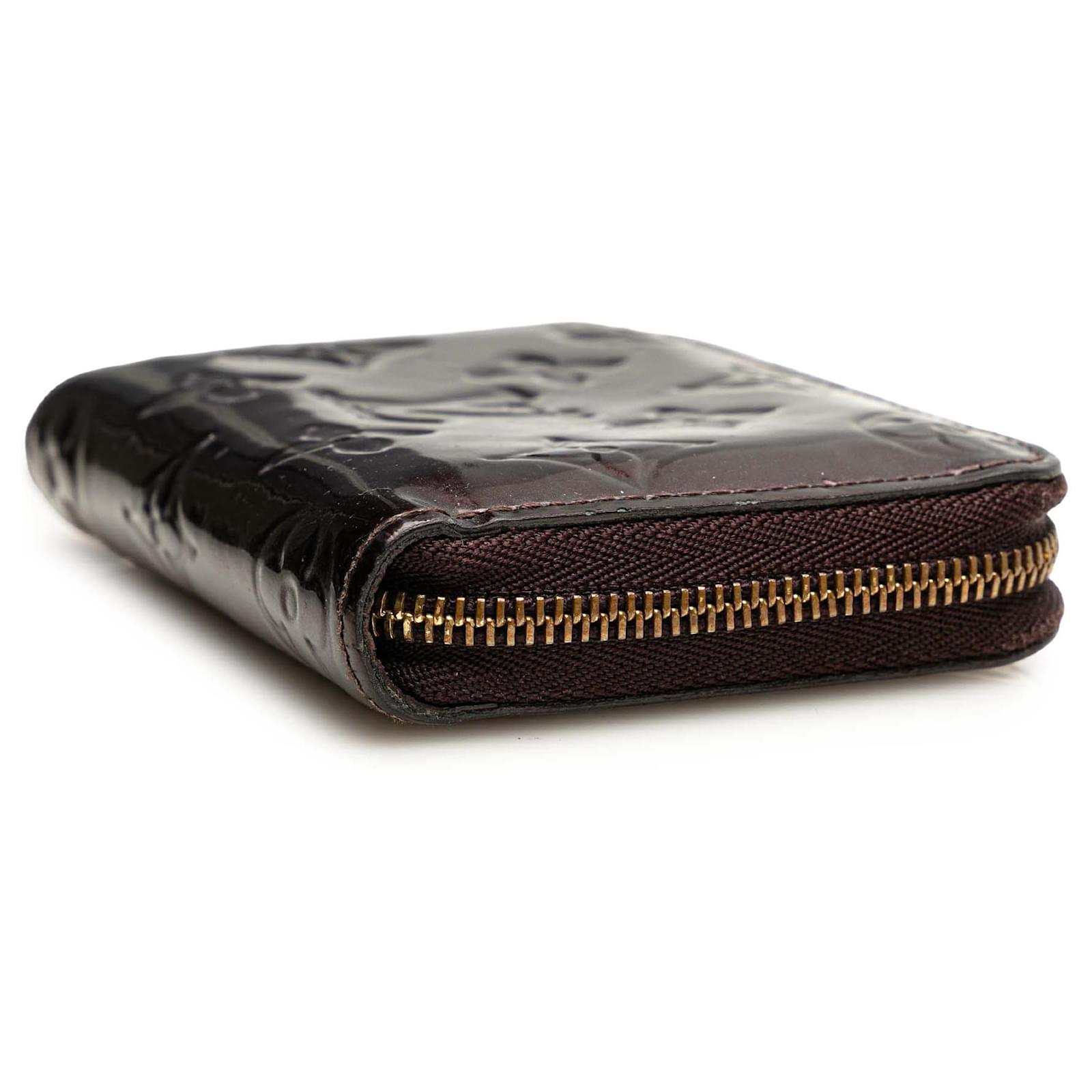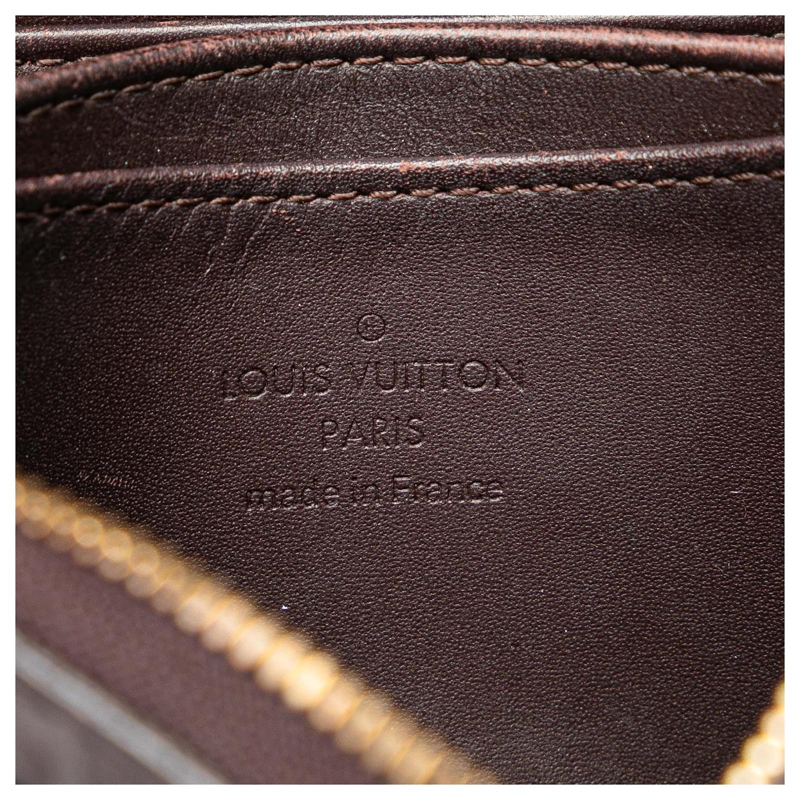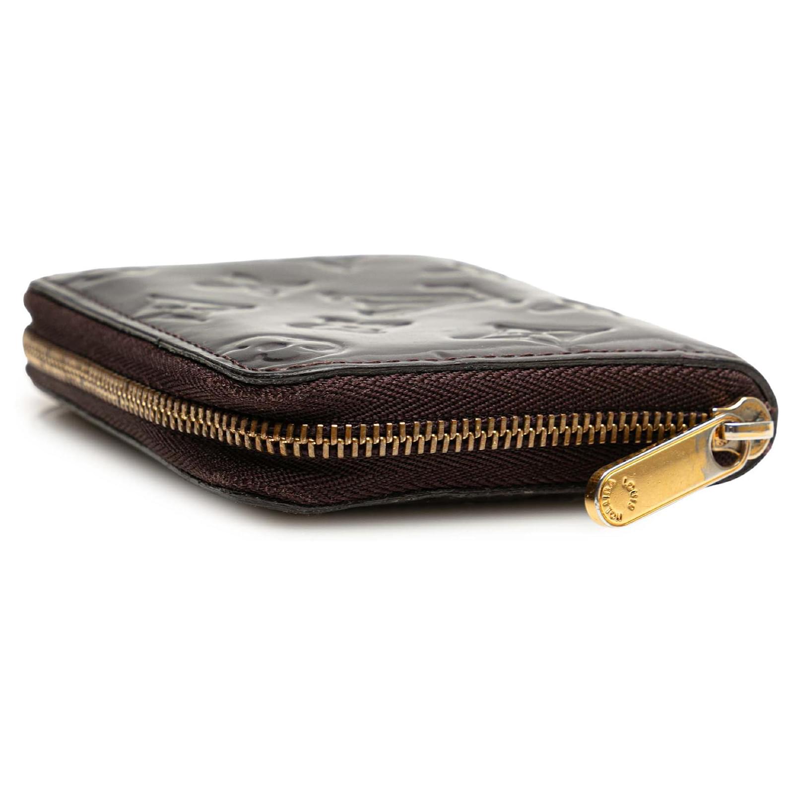 This coin purse features a monogram vernis leather body, an exterior zip closure, interior card slots, and open compartments. It carries a B+ condition rating.