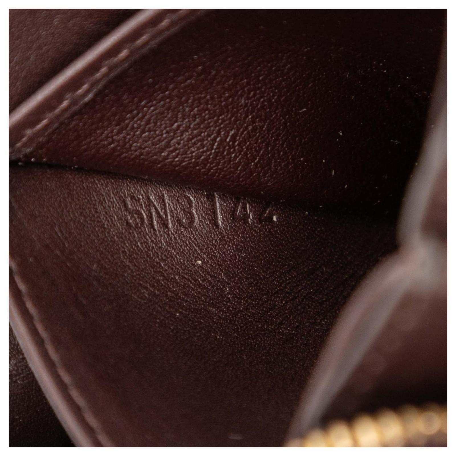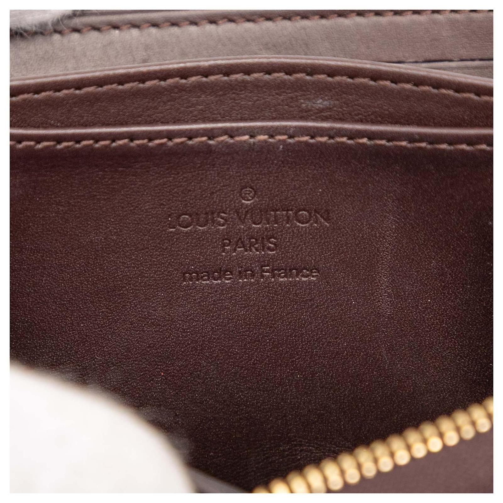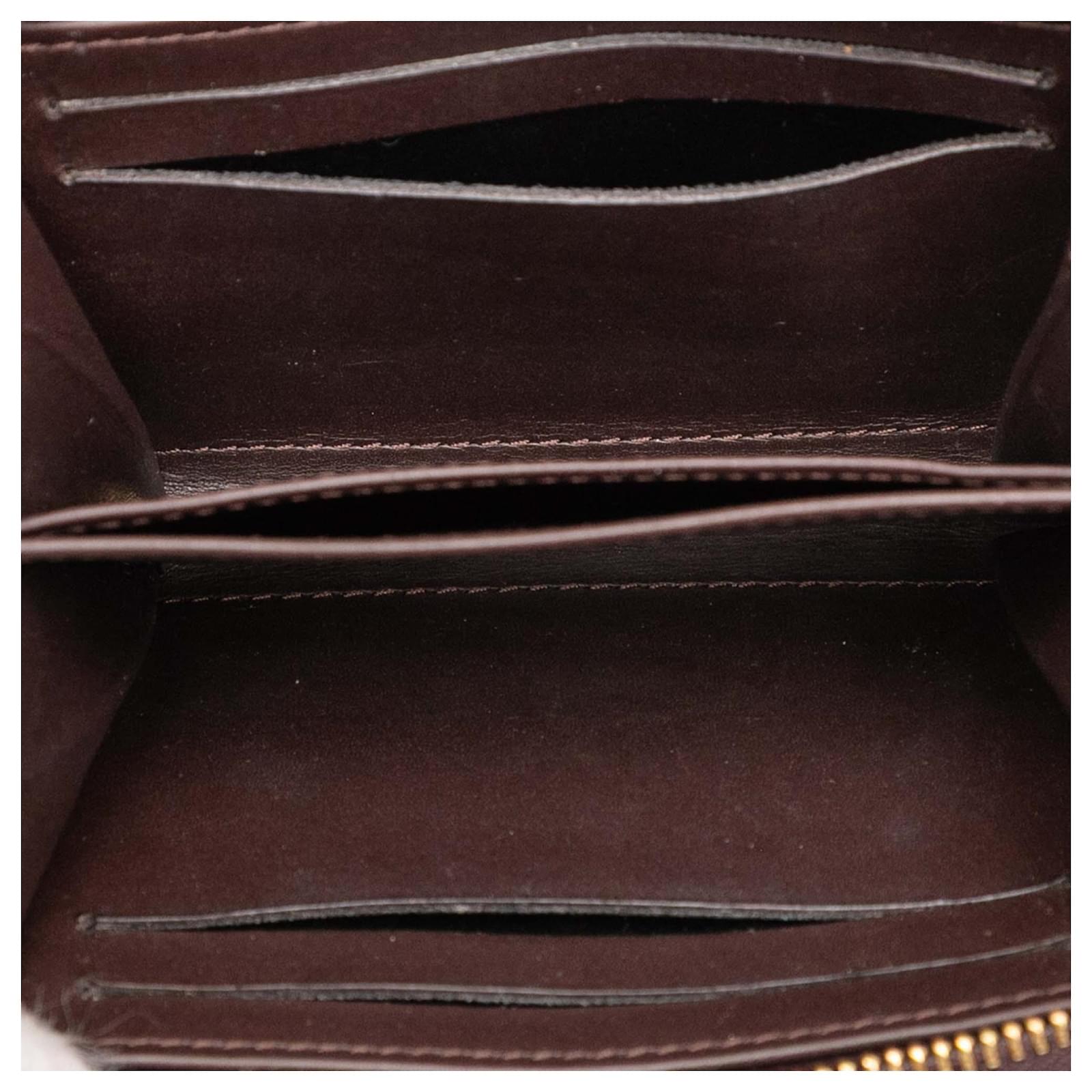 This coin purse features a vernis leather body, a zip around closure, and interior slip compartments. It carries a B+ condition rating.