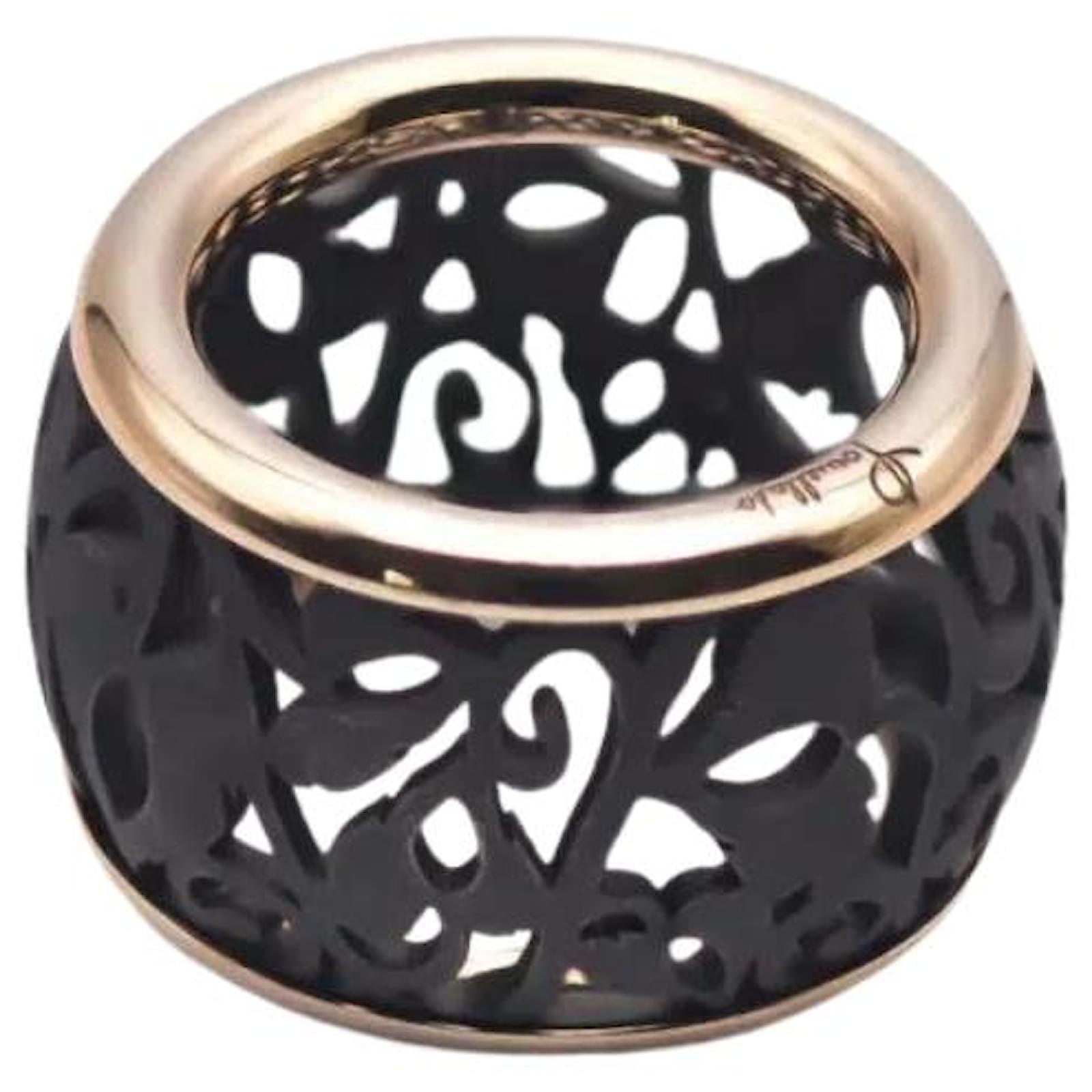 Pomellato Arabesque Ring: Pre-owned Pomellato Arabesque ring in 750/1000 rose gold and titanium composed of a wide slightly curved band of arabesque in titanium enhanced on each side by rose gold. The outer side of the rose gold ring features the Pomellato signature. A pre-owned piece of jewelry for women or men with a unique style. Condition: Very good condition for this pre-owned Pomellato ring for women. Slight traces on the titanium that are barely visible when worn. Details: - Rose Gold 750/1000 (18K) - Titanium - Width: 14mm - Ring size: 52 - Weight: 8.1 grams - Packaging and Certificates: - Unsigned box - Expert certificate issued by our partner expert - Certificate of authenticity.