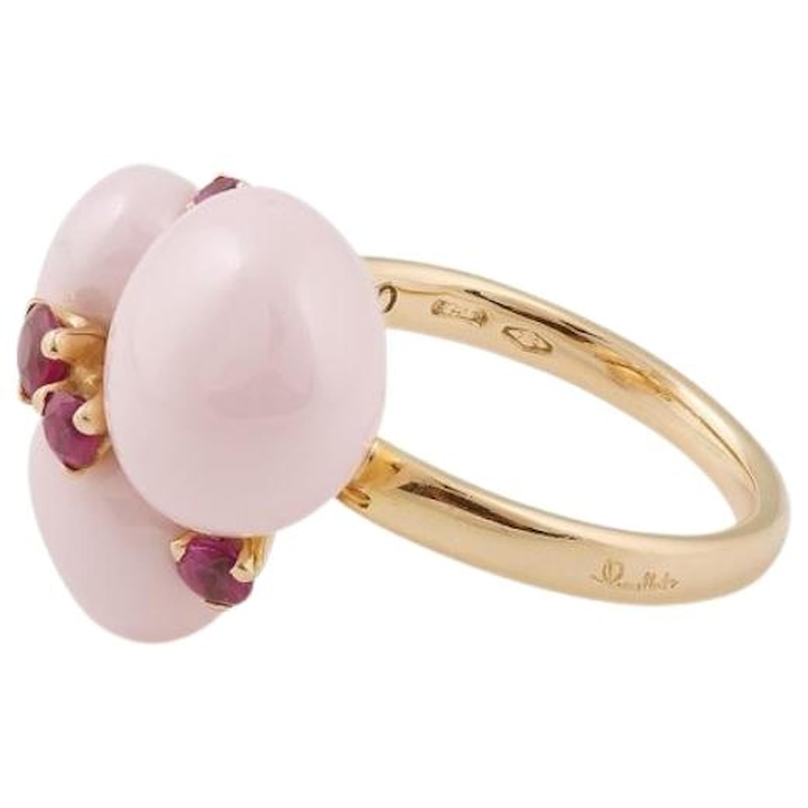 Capri Pomellato Ring: Pre-owned Capri Pomellato ring in 18K rose gold pink ceramic and pink sapphires: composed of a thin semi-domed ring of approximately 2 mm in rose gold topped with a set of 3 pink ceramic pebbles of different sizes enhanced by 5 small red rubies. The ring bears the Pomellato signature on the outside. Condition: Very good condition: this piece of jewelry has been carefully cleaned by a professional jeweler and repackaged in an unbranded case. The stones and ceramics have a beautiful shine. Few signs of wear. Details: - 18K Rose Gold - 5 rubies - 3 pink ceramics - Motif size: ~ approximately 15 x 15.6 mm - Ring size: 50 - Weight: 9.26 gr - Packaging and Certificates: - New unbranded case - Certificate of expertise issued by our partner expert.