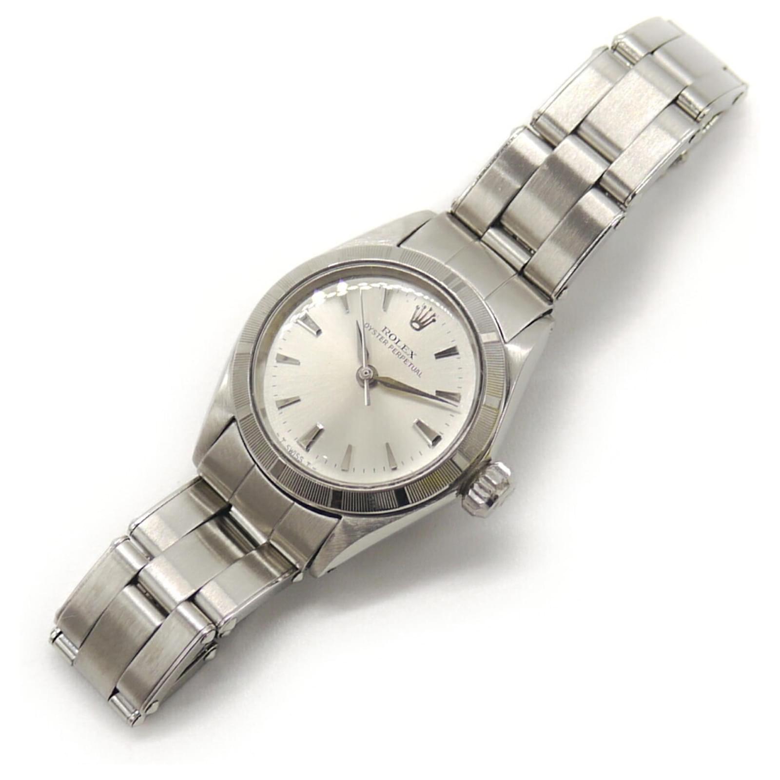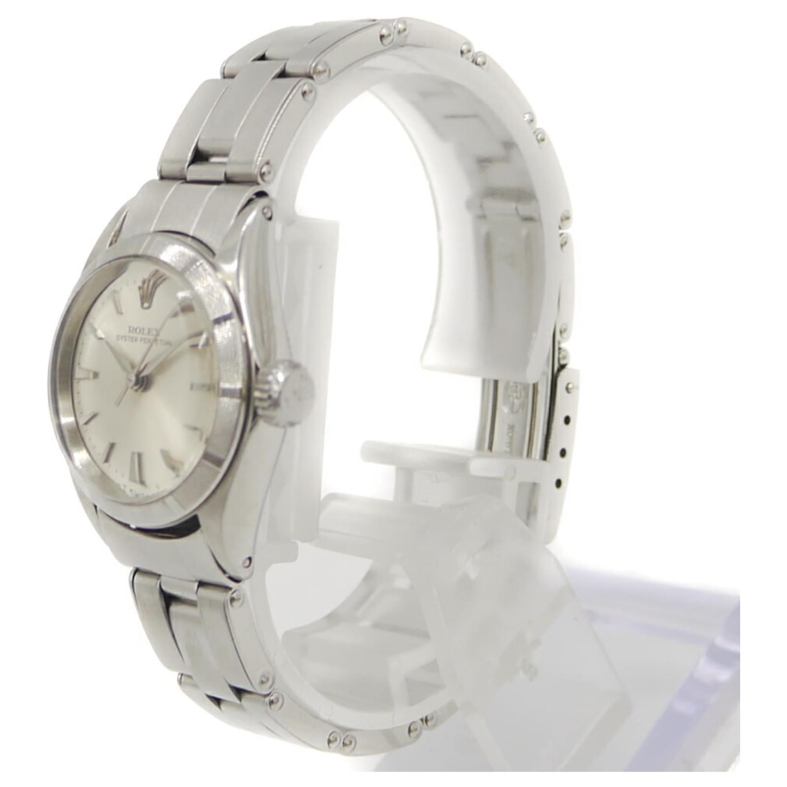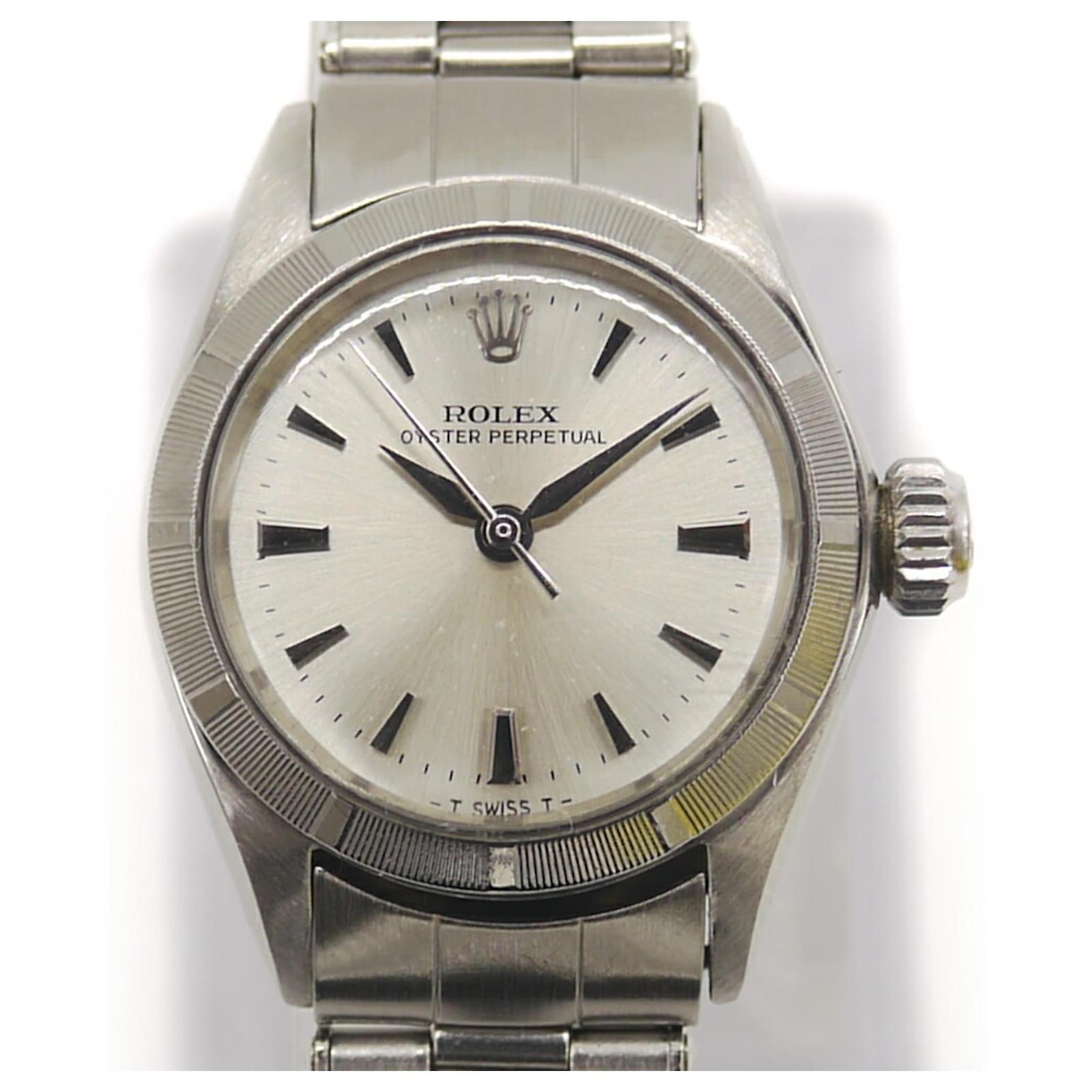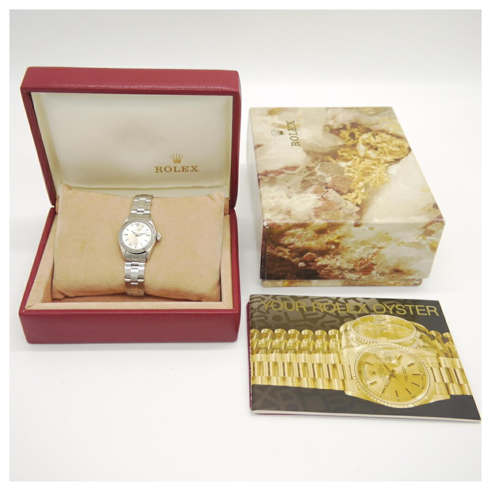 The Rolex Oyster Perpetual 6623 is a women's wristwatch featuring a silver dial and a stainless steel case and band. With a case diameter of 26mm, this timepiece is powered by a self-winding automatic movement. It is classified as used but remains in good condition, showing slight traces of wear such as minor scratches on the bezel, case, and band. The watch comes with both inner and outer boxes. This model is made in Switzerland and is identified by the MPN 6623. Before purchasing, it is advisable to review the images for a detailed view of the watch's condition and included accessories.