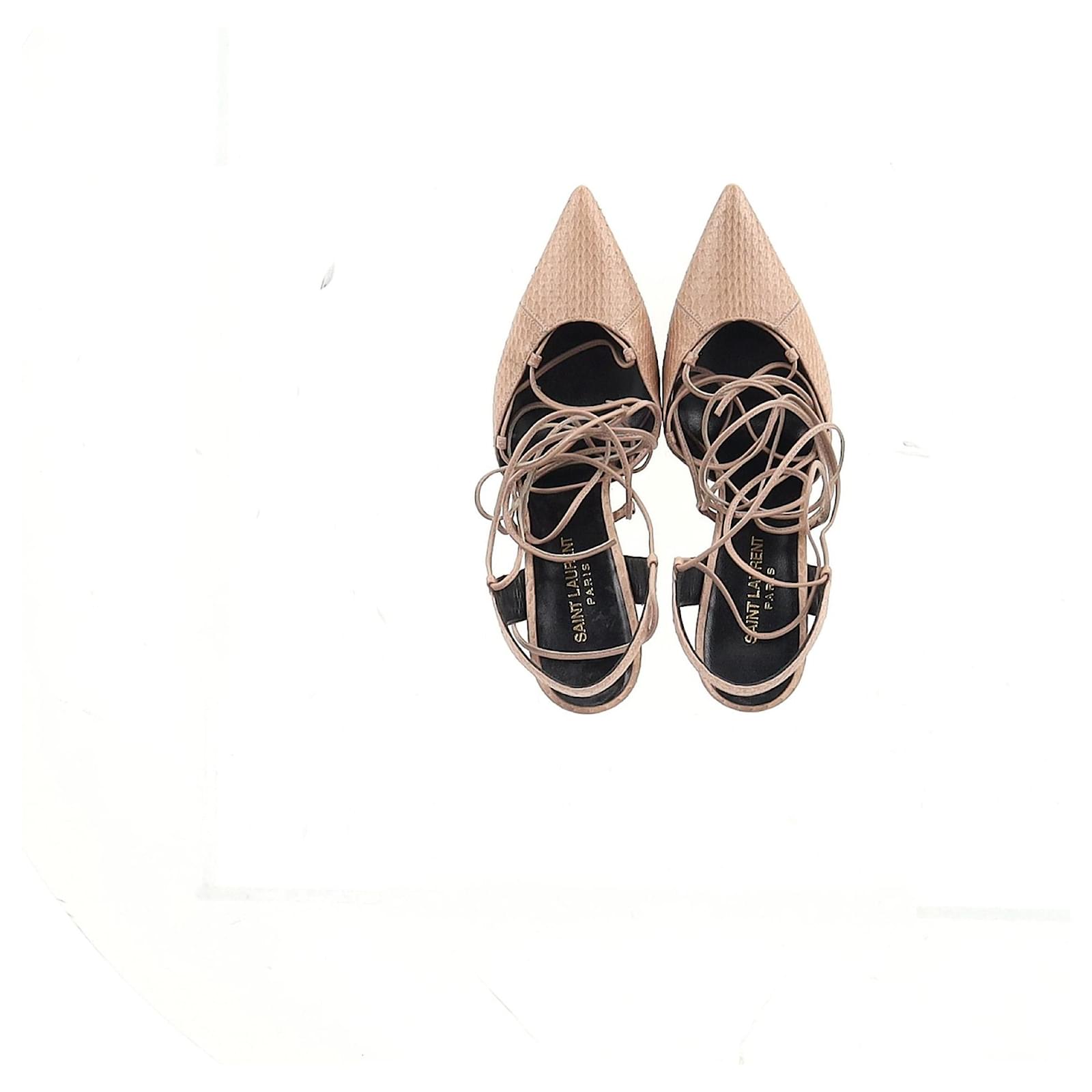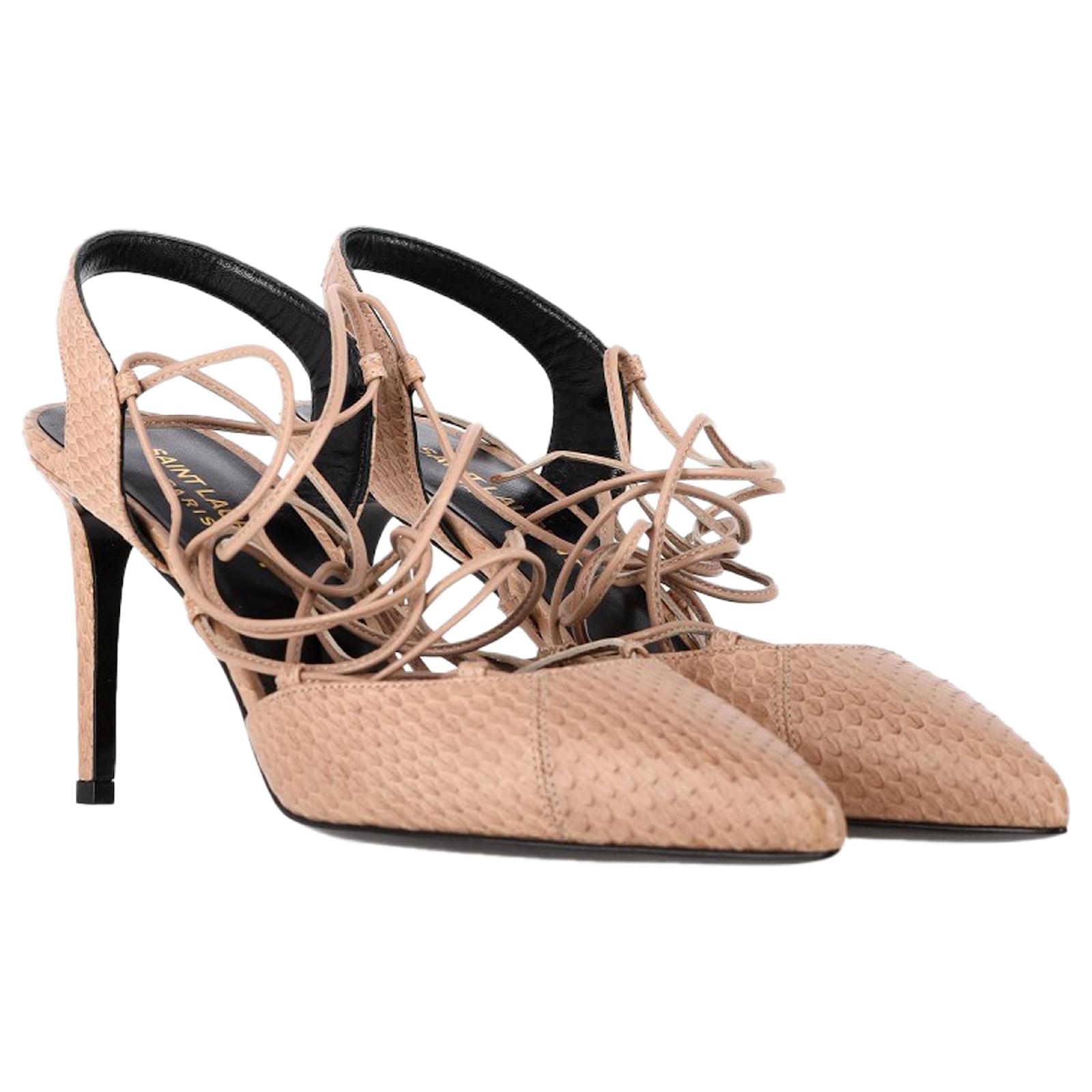 Exude fierce sophistication with the Saint Laurent Paris Skinny Snakeskin-Embossed Pumps, crafted in beige leather for a sleek, textural finish. The pointed toe and slender heel create an elongating silhouette, while the subtle snakeskin embossing adds a refined edge. **Styling tip:** Pair them with a tailored jumpsuit or pencil skirt for a polished, power-dressing look with a hint of wild elegance.
