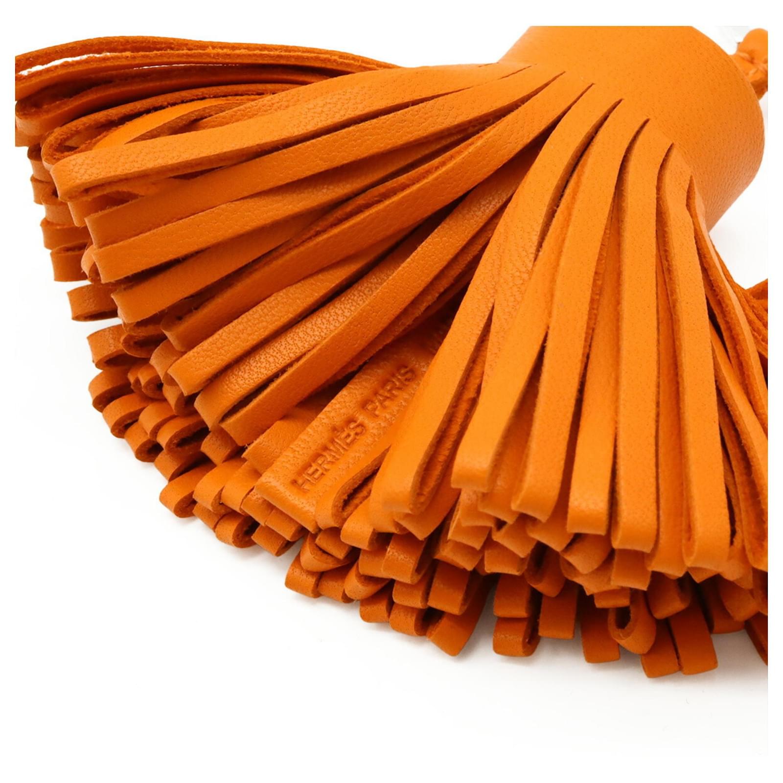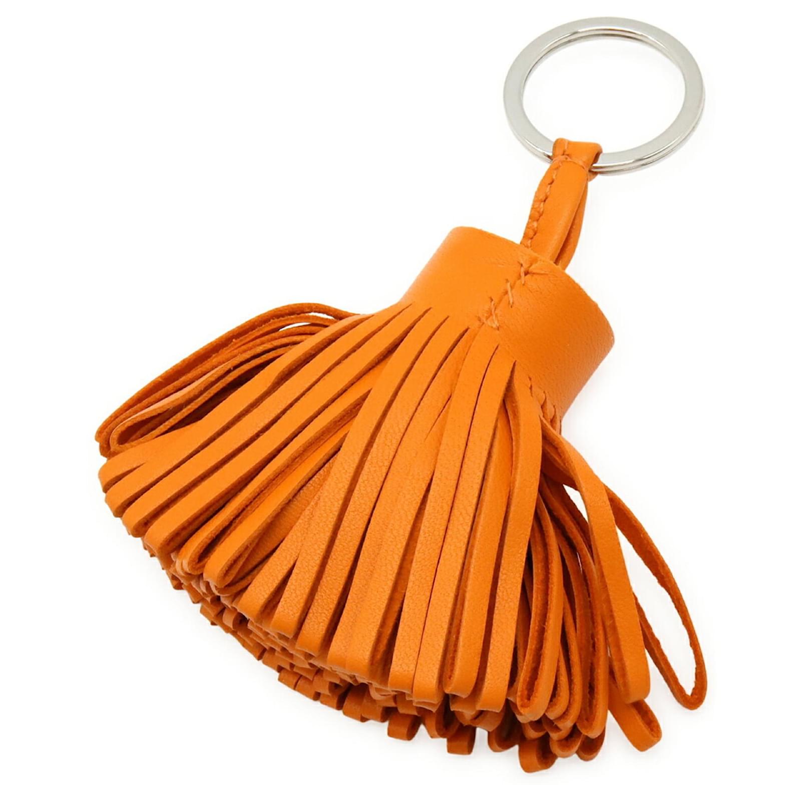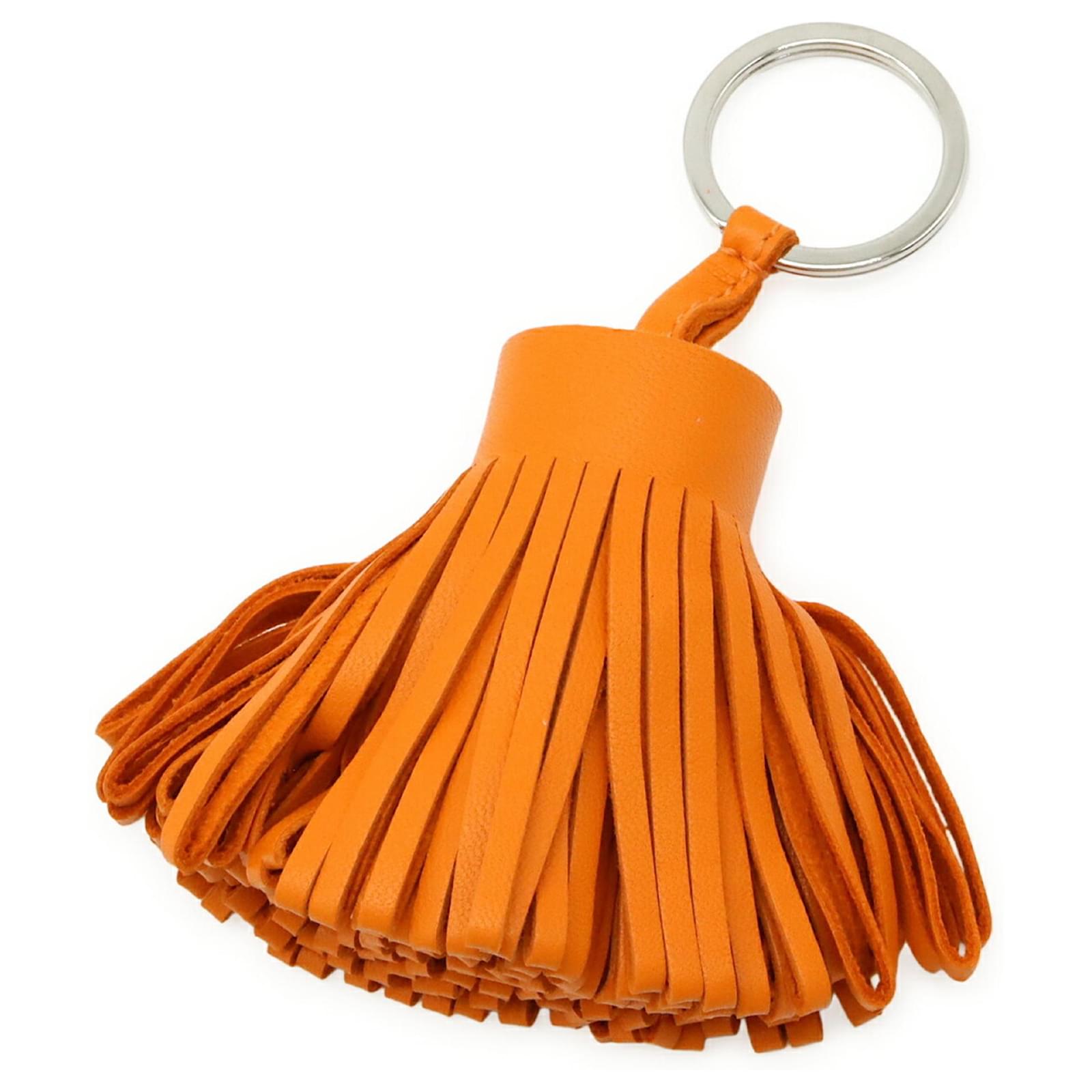 Le porte-clés Hermes Carmen est un accessoire élégant fabriqué en cuir Anjou Miro de couleur orange vif. Ce porte-clés présente un charme en forme de frange et est conçu pour un usage pratique.