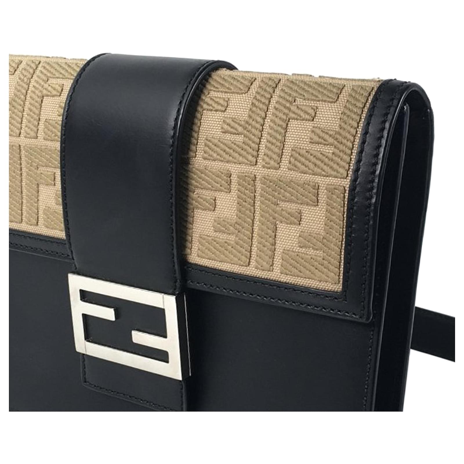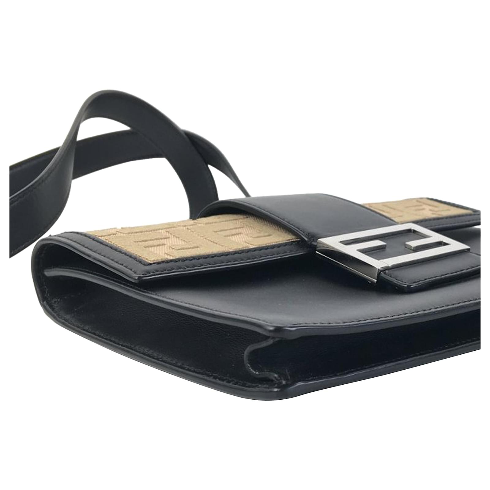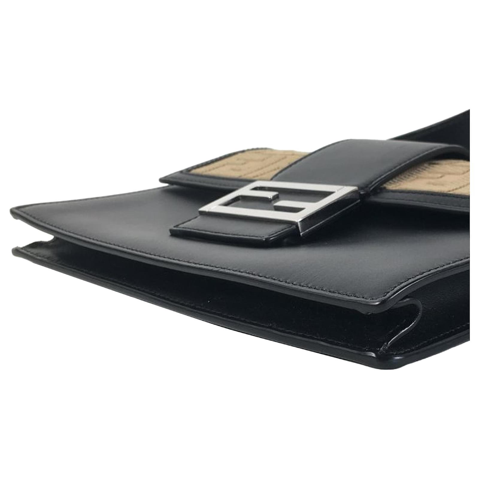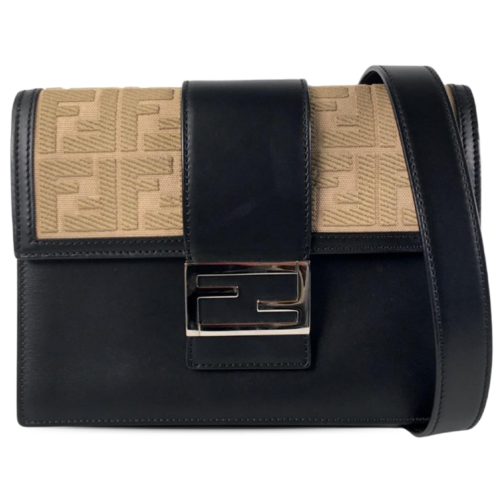 Baguette plat croisé FF 1974 en cuir de veau noir et toile Fendi