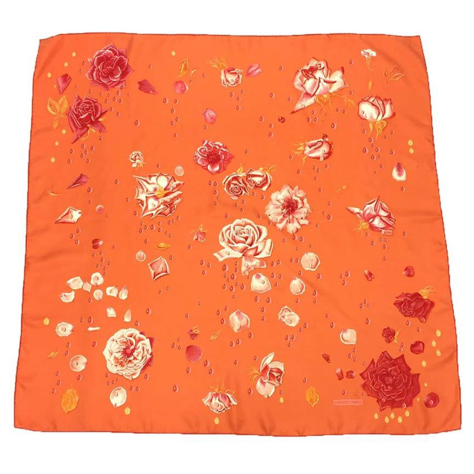 Cette écharpe Hermès, également connue sous le nom de Muffler Carre 90, présente une couleur orange vibrante ornée d'un design floral intitulé "La Rosse Dew Rose." Fabriquée en soie, elle mesure 90 cm x 90 cm (35,43'' x 35,43''). L'écharpe est classée comme utilisée mais est en très bon état, montrant seulement de légères traces d'utilisation, des rayures et de la saleté. Il est important de consulter les images fournies pour une vue détaillée de son état. Aucun accessoire supplémentaire n'est inclus avec cet article.