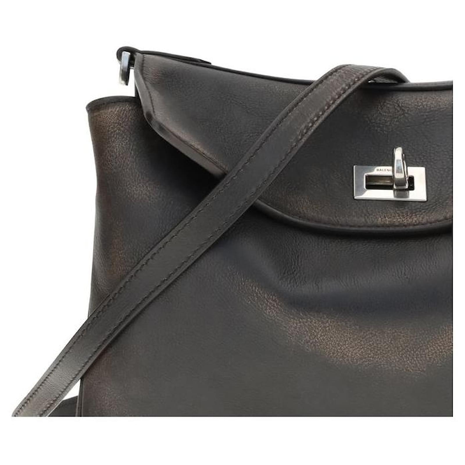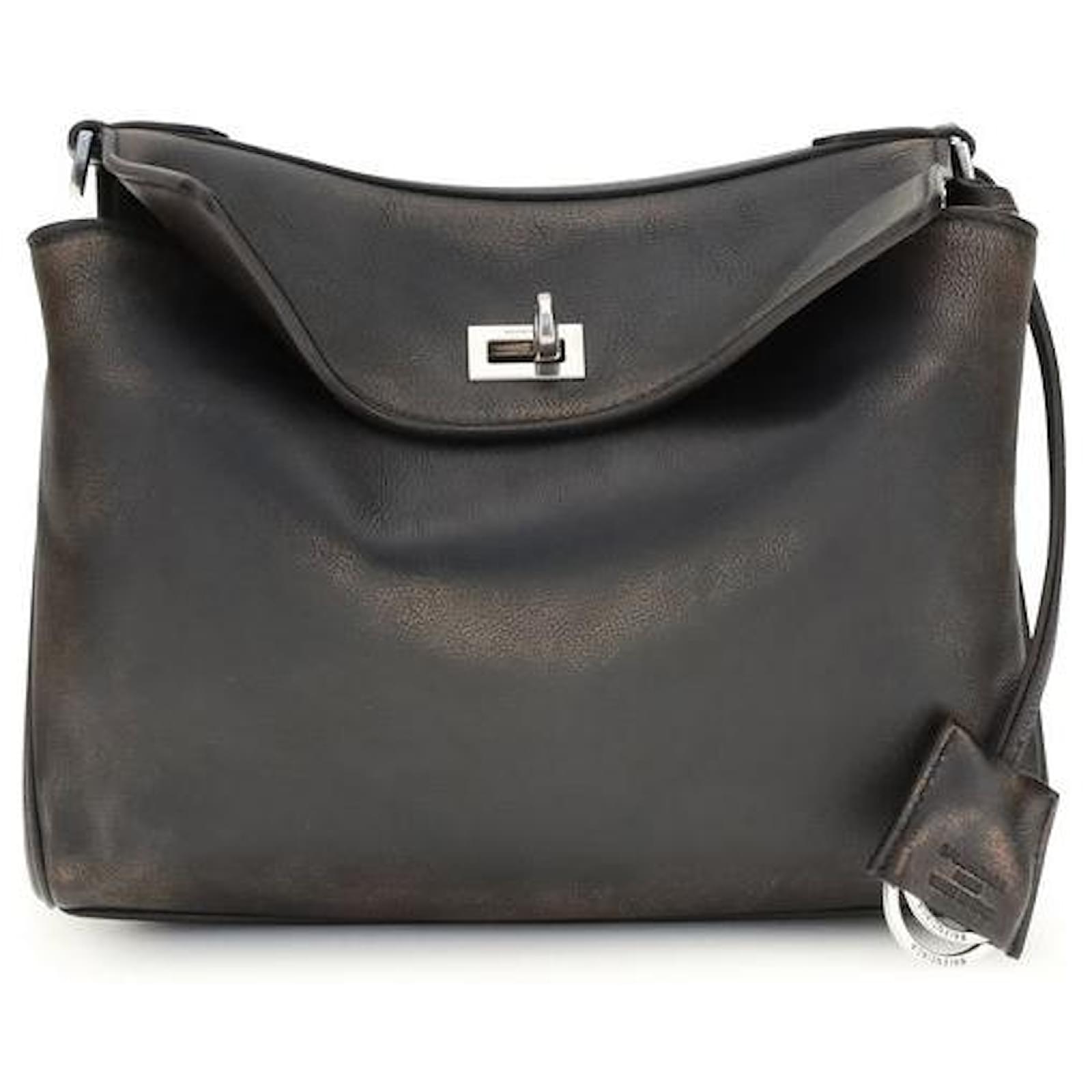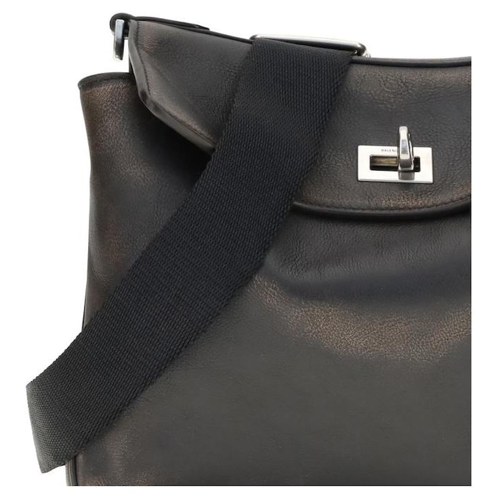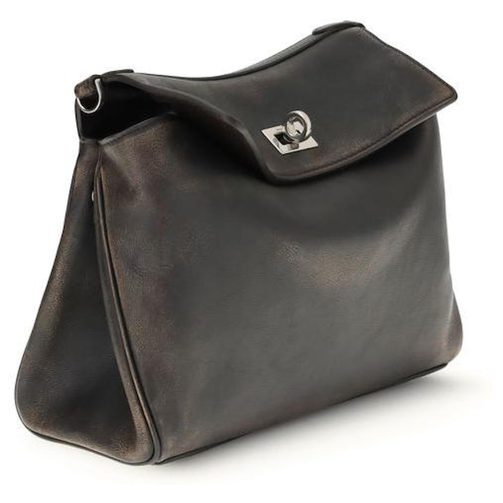 A pequena bolsa de ombro Rodeo da Balenciaga, projetada para o homem moderno, é feita de couro de bezerro bicolor com um efeito desgastado, conferindo-lhe uma sensação ousada e contemporânea. O design de mensageiro é complementado por uma alça de ombro ajustável e removível estilo cinto de carro, além de uma segunda alça de couro para maior versatilidade. Apresentando um fechamento prático com fecho giratório, possui um compartimento principal espaçoso, bolsos internos e externos, e detalhes funcionais como um chaveiro removível, botões de pressão laterais e pés de latão. O hardware em prata antiga adiciona um toque distinto.